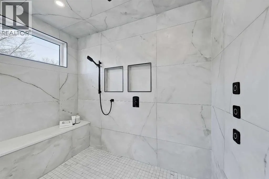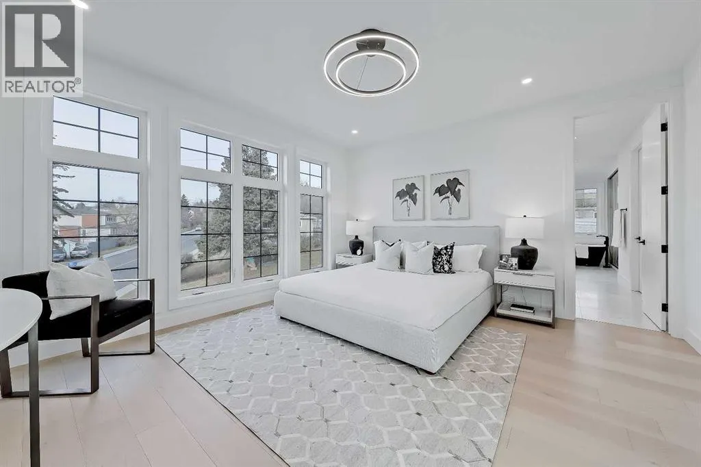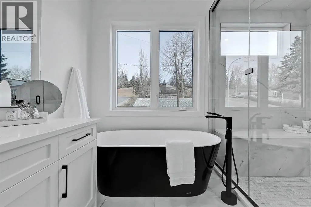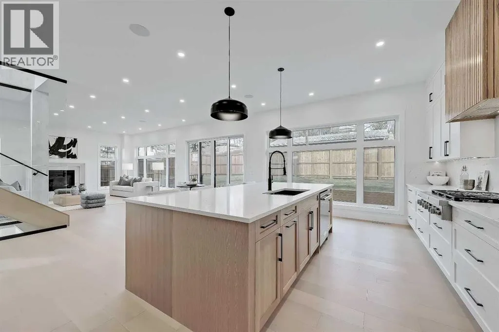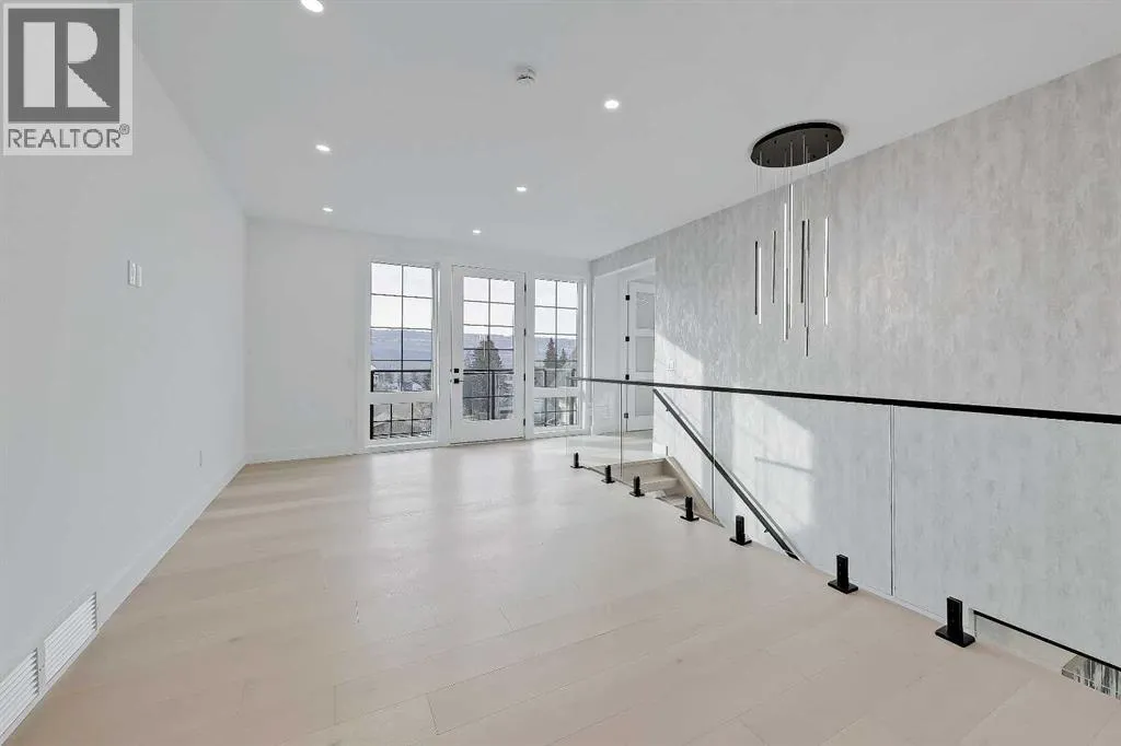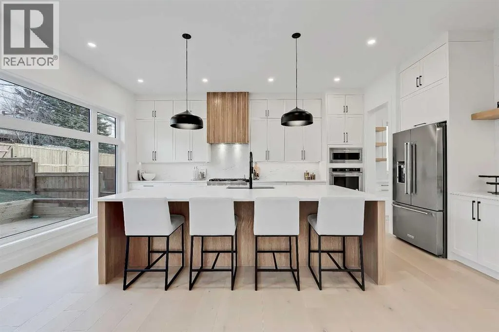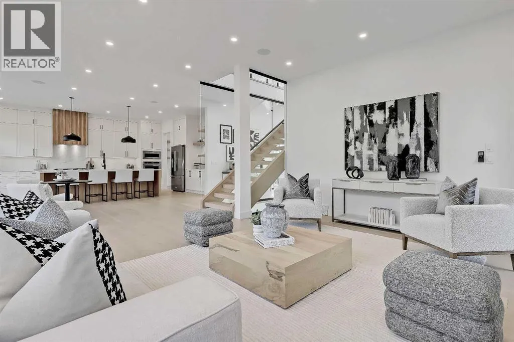 Perched high above the river valley in MONTGOMERY, this newly built estate home by NX HOMES blends bold architectural design with sweeping west-facing views and refined, contemporary comfort. Every detail has been thoughtfully curatedâfrom the striking arched windows that flood the interior with natural light to the custom oak staircase and the cohesive balance of texture, tone, and proportion that defines each space. This is a home that feels both commanding and sereneâa perfect match for its hillside setting just minutes from Market Mall, the University of Calgary, and the cityâs vibrant northwest core. Inside, soaring 10-foot ceilings and a gallery-style foyer set the tone for whatâs to come. The main level is anchored by a CHEFâS KITCHEN designed for gathering and performance, featuring waterfall-edge stone counters, high-end stainless steel appliances, and a large central island with seating for casual conversation. The BUTLERâS PANTRY offers extended prep and storage space, while the open-concept layout connects seamlessly to the dining area and a sunlit great room warmed by a modern gas fireplace. Oversized west windows frame mountain views, and double doors extend the living space outdoors to a generous upper deckâperfect for summer evenings and golden-hour sunsets. A front office, stylish powder room, and discreet storage complete this level with purpose and grace. Upstairs, three BEDROOMS WITH IN-FLOOR HEATED ENSUITES create private retreats for family and guests alike. The PRIMARY SUITE captures the west horizon with expansive windows and vaulted ceilings, a custom walk-in closet with built-ins, and a SPA-INSPIRED ENSUITE featuring a freestanding soaker tub, dual vanities, and an oversized glass-enclosed shower. A front-facing BONUS ROOM provides additional flexibility for a reading nook or play space, while the full-size LAUNDRY ROOM with sink keeps the upper level as functional as it is refined. The FULLY FINISHED WALK-OUT BASEMENT extends the homeâs li ving and entertaining potential. Here, a sleek WET BAR opens to a spacious recreation and movie areaâan ideal backdrop for game nights and gatherings. Thereâs also a fourth bedroom with a nearby full bath, a dedicated MUDROOM WITH BUILT-INS, and a rough-in for IN-FLOOR HEATING to keep every corner warm through Calgaryâs winters. Every element of this property reflects craftsmanship and quality, from the ENERGY-EFFICIENT SYSTEMS and superior insulation to the TRIPLE ATTACHED GARAGE with R/I for gas heater and the low-maintenance landscaped exterior. Outdoor lighting highlights the homeâs modern architecture, while the tiered front approach and private rear yard enhance curb appeal and usability. In a community prized for its views, parks, and proximity to downtown, this home stands apartânot just for its design, but for how it lives. Elegant yet welcoming, contemporary yet timeless, itâs the rare opportunity to own a truly ONE-OF-A-KIND CUSTOM BUILD IN MONTGOMERY. (id:27476)