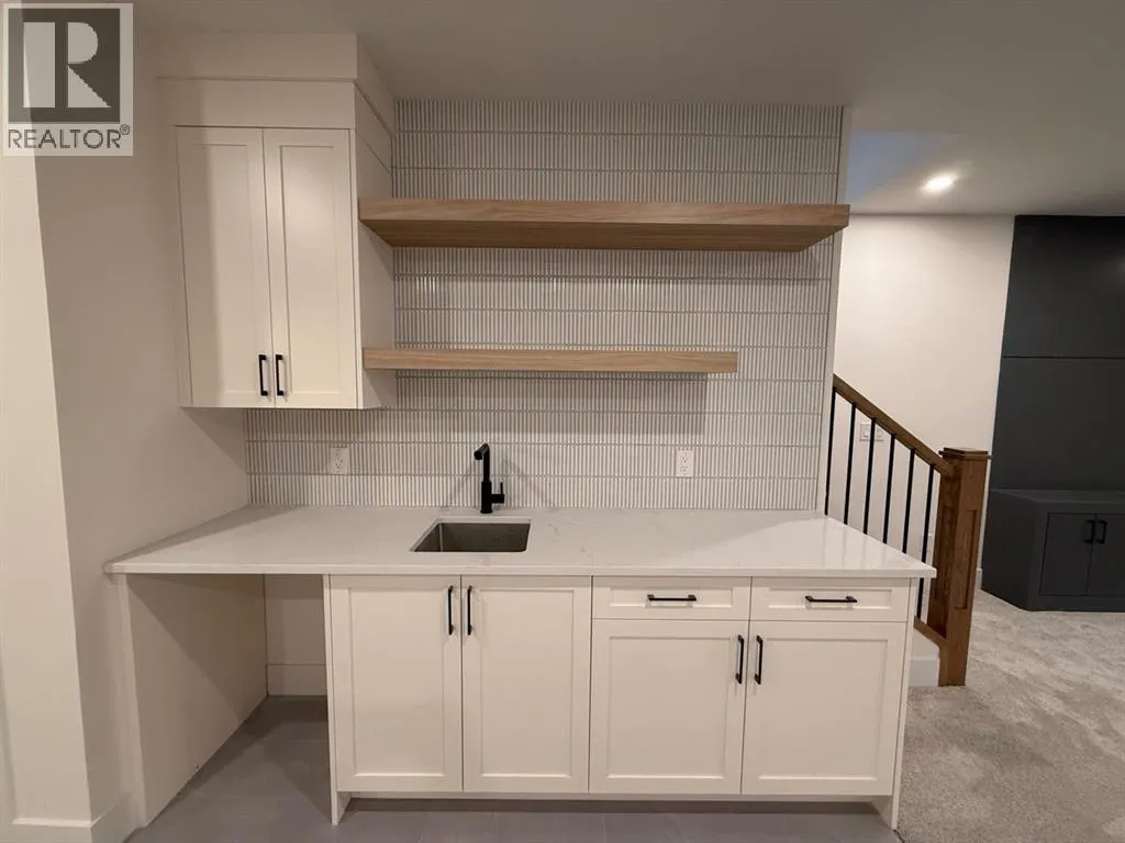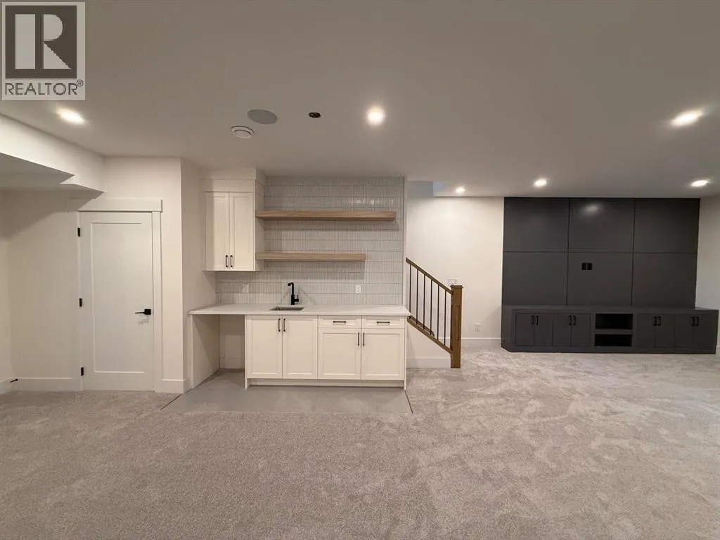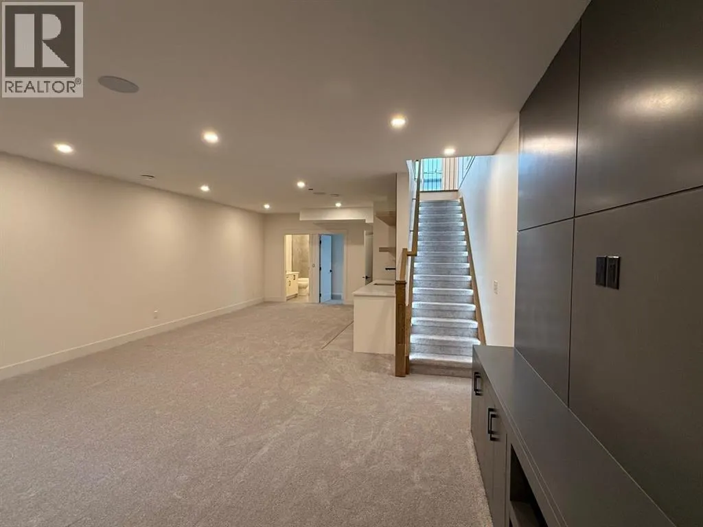 Timeless design, modern comfort, and everyday function come together on a quiet tree-lined street in this stunning new home in GLENBROOK. With expansive windows, warm natural materials, & elevated finishes throughout, itâs crafted for family living in one of Calgaryâs most established neighbourhoods. Step in from the covered entry to a bright foyer with sight lines across the open main floor, where light oak hardwood carries seamlessly through the principal rooms. The front dining room is anchored by a custom feature wall, setting the tone for the thoughtful millwork found throughout. An elevated powder room greets you upon entering & provides privacy & convenience through a hidden door. At the heart of the home, the chef-inspired kitchen blends beauty with purposeâtwo full pantries, crisp white uppers over matching oak lowers, a striking waterfall quartz island, exposed beams & professional KitchenAid appliances including a flat gas cooktop, built-in wall oven, & French-door fridge. Clean lines, elegant lighting, and generous prep space make this a true culinary hub. A well-designed butlers pantry & mudroom with custom built-ins keeps everyday essentials organized, The floor plan flows naturally into the inviting living room, where custom coffered ceilings & built-ins frame a cozy gas fireplace & create the perfect space to unwind or gather with friends & family. Large windows and an 8â sliding patio door pull in west light and open directly to the backyard for easy indoor/outdoor living. Step outside to a sun-soaked west-facing backyard, complete with a large rear deck & BBQ gas line, ready for late summer evenings & weekend gatherings. A double garage plus a striking exterior finished in stucco & Hardie-board siding complete this exceptional property. Head up the alluring hardwood stairs to find more of the same hardwood floors & a thoughtfully placed built-in desk that creates the perfect homework zone or dedicated home office. A spacious laundry room with q uartz countertop, pre-wash sink, plus extra storage ensures the second floor is as practical as it is comfortable.Retreat to the serene primary suite, where vaulted ceilings lift the space and morning sun pours through oversized windows. The ensuite reads like a private spa, offering a massive walk-in shower with body jets, (roughed in steam shower), double sinks, a deep free-standing soaker tub, & beautifully curated tile throughout. A custom walk-in closet completes the sanctuary. Two additional bedrooms sit down the hall. One even features its own custom built in closet.The lower level flexes effortlessly with family lifeâan expansive Rec room with custom built-in TV wall, a generous flex/rec area with a full wet bar, plus an additional bedroom and full bath, ideal for guests, teens, or extended family. Located close to schools, parks, playgrounds, shopping, transit, & major routesâoffering a perfect blend of community charm & everyday convenience. (id:27476)