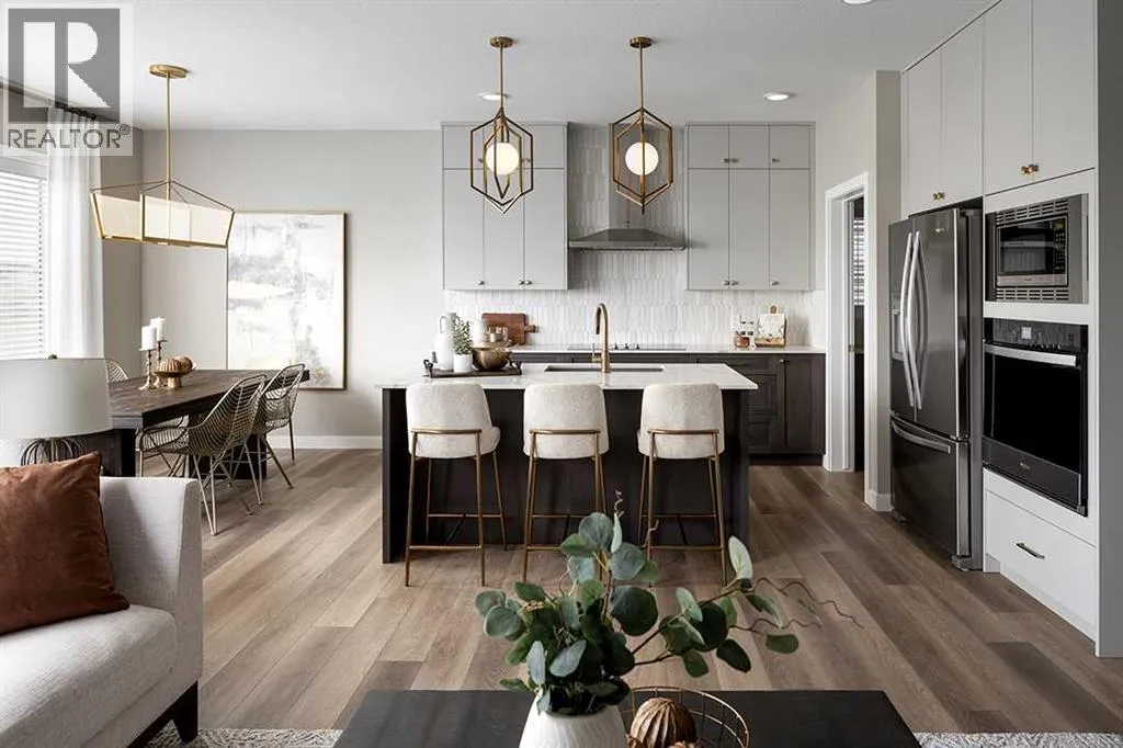 The Solara by Shane Homes â a pre-construction, customizable home in the desirable community of Ambleton. This 3-bed, 3-bath home sits on an extra-wide lot. The upgraded kitchen includes a chimney hood fan, built-in microwave, gas cooktop, and a spice kitchen for added convenience. Enjoy a main floor full bath, 9â basement foundation, and roughed-ins for potential future development flexibility. Personalize your finishes and design selections to suit your lifestyle. Located in a community surrounded by pathways, parks, and planned amenities. Photos are representative and may show optional features. (id:27476)
