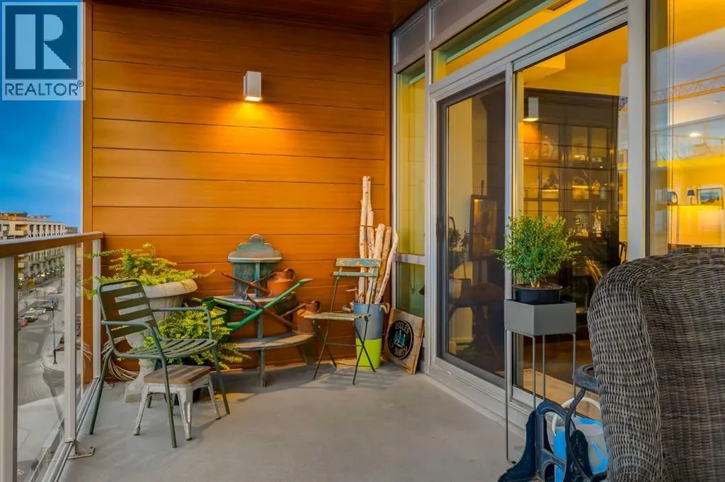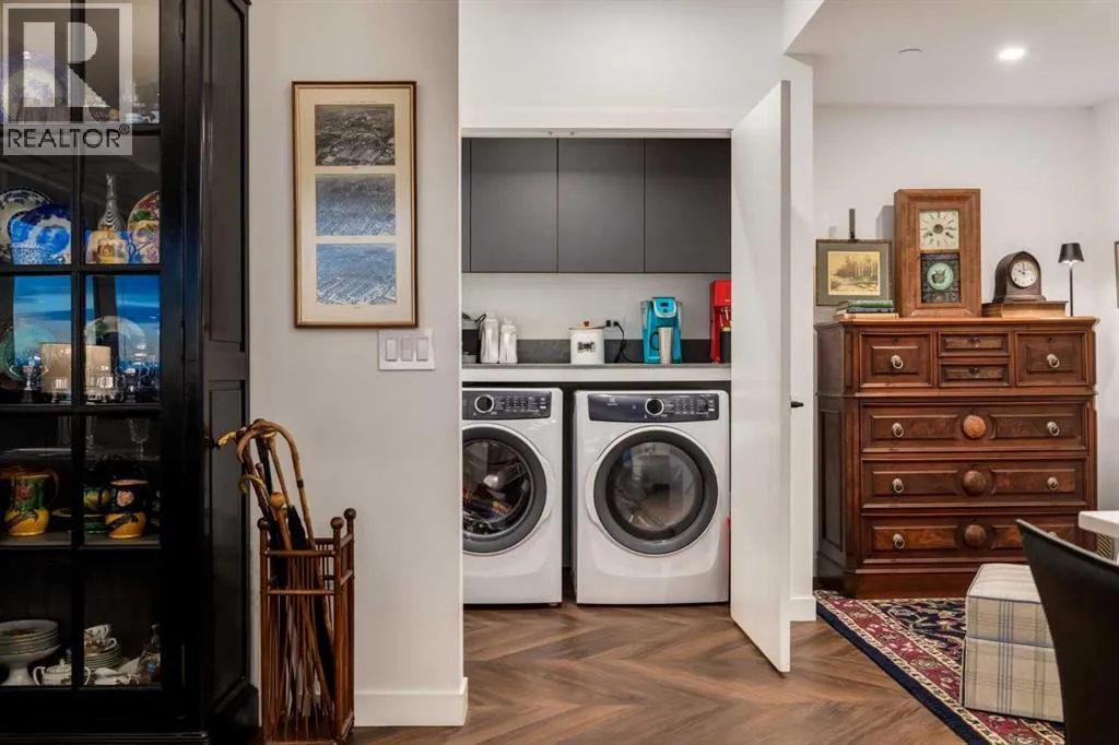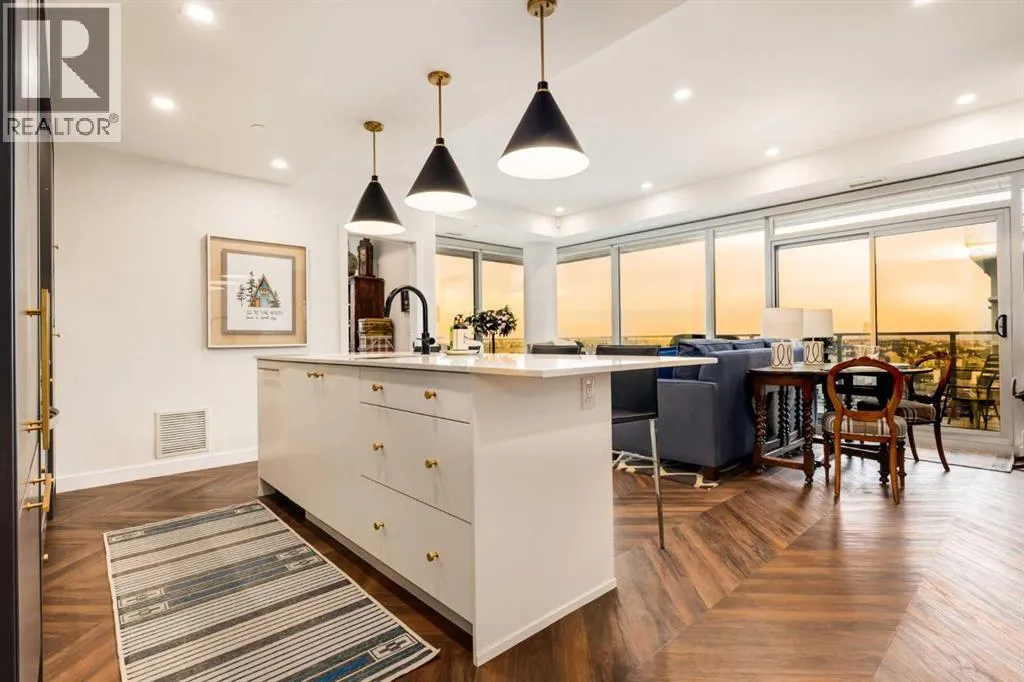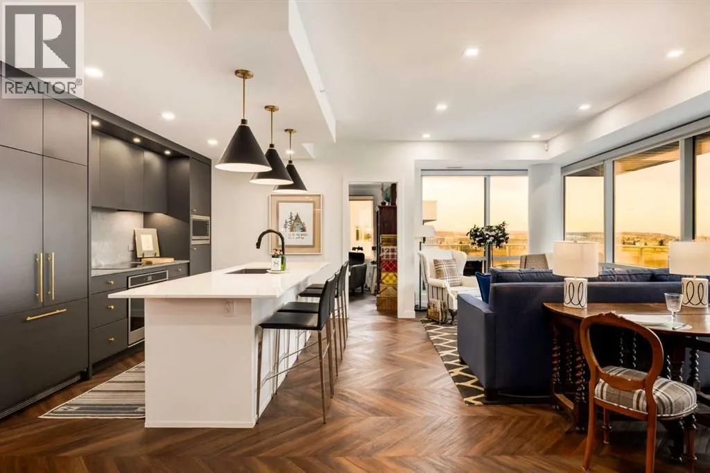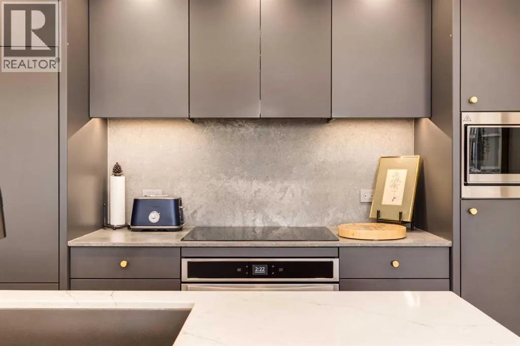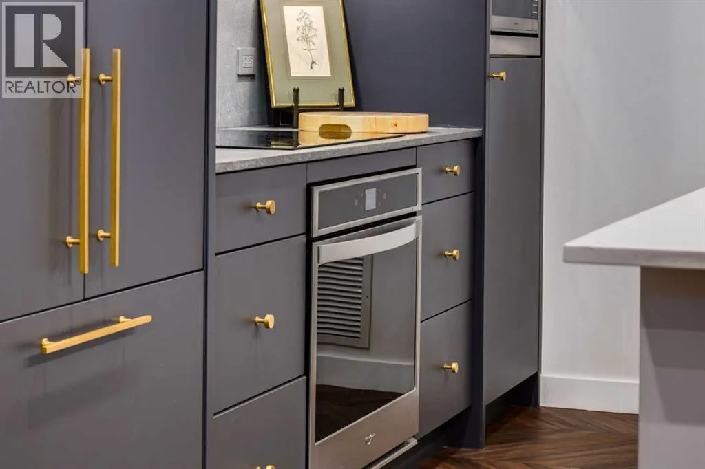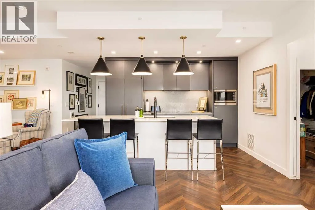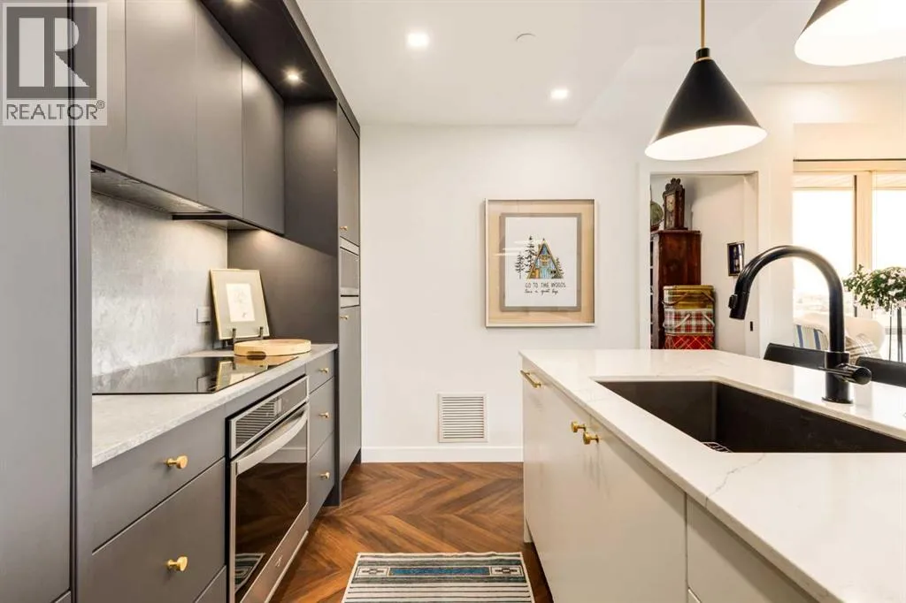 Experience elevated urban living in this warm and inviting two-bedroom residence offering over 1,100 square feet of thoughtfully designed interior space and a wraparound terrace perfect for everyday outdoor living and relaxed entertaining. Blending a cozy Ralph Laurenâinspired aesthetic with modern finishes, this home features chevron-patterned flooring, designer lighting, and flat-painted ceilings that create a timeless atmosphere throughout. The chef-inspired kitchen is the heart of the home, showcasing matte grey slate cabinetry with soft-close hardware, brushed-gold accents, quartz countertops, and a matching backsplash. Premium appliances include a Frigidaire induction cooktop, Elica hood fan, Fisher & Paykel integrated fridge and freezer, and Whirlpool oven, complemented by a deep grey Blanco sink, elegant black pendant lighting, and a spacious walk-in pantry. The open living room and dining areas are bathed in natural light from expansive windows that frame stunning mountain views, while a charming reading/coffee nook offers the perfect spot to unwind or start your day. The versatile second bedroom can easily serve as a guest room, home office, or creative space, complete with a walk-in closet and a stylish four-piece bathroom. The primary suite feels calm and comforting, with warm neutral tones, a walk-in closet, and a spa-like ensuite featuring dual vanities, quartz countertops, and a glass-enclosed shower. Additional features include a new Electrolux washer and dryer, generous linen storage, one titled underground parking stall, and two large storage units. The wraparound terrace enhances daily living with ample space for outdoor lounging and garden greenery, creating a private retreat in the heart of the city. Residents enjoy access to premium amenities including a rooftop patio, private ownerâs lounge, secure underground visitor parking, bike storage, EV charging stations, and concierge services. Ideally located in Calgaryâs West District, you are surrou nded by parks, walking paths, boutique shops, cafés, and dining options. Book your private viewing today! (id:27476)