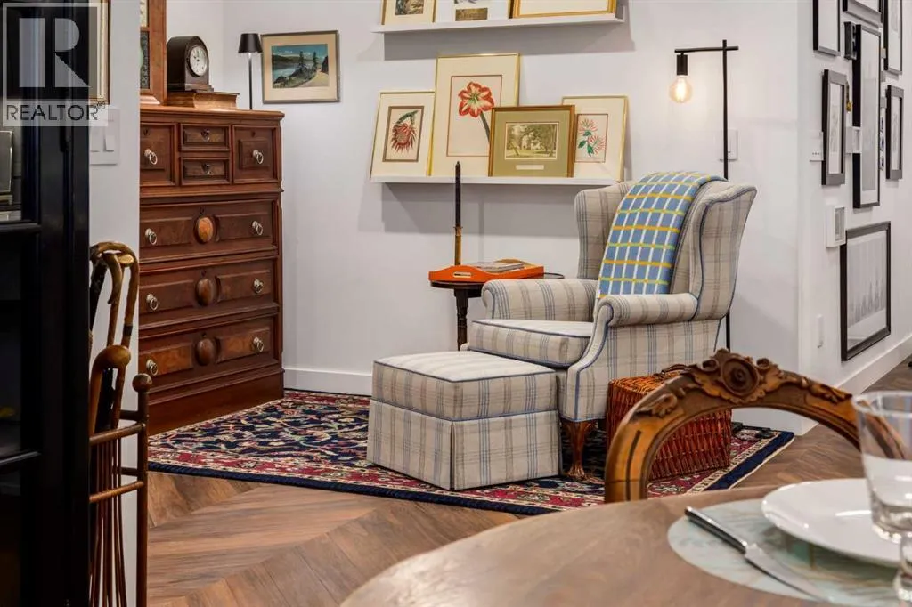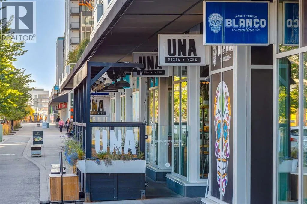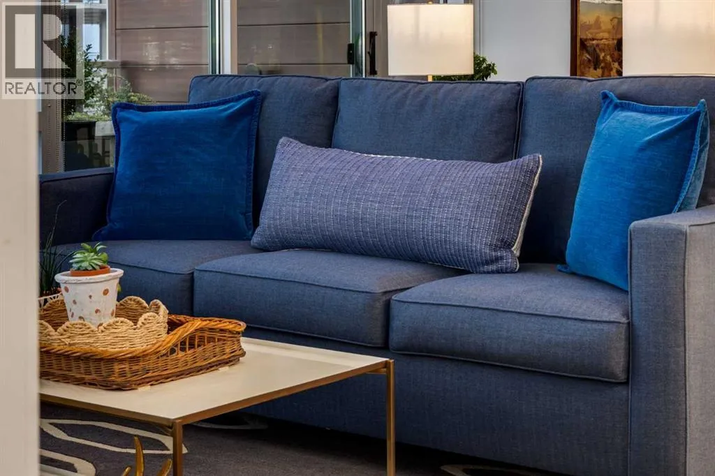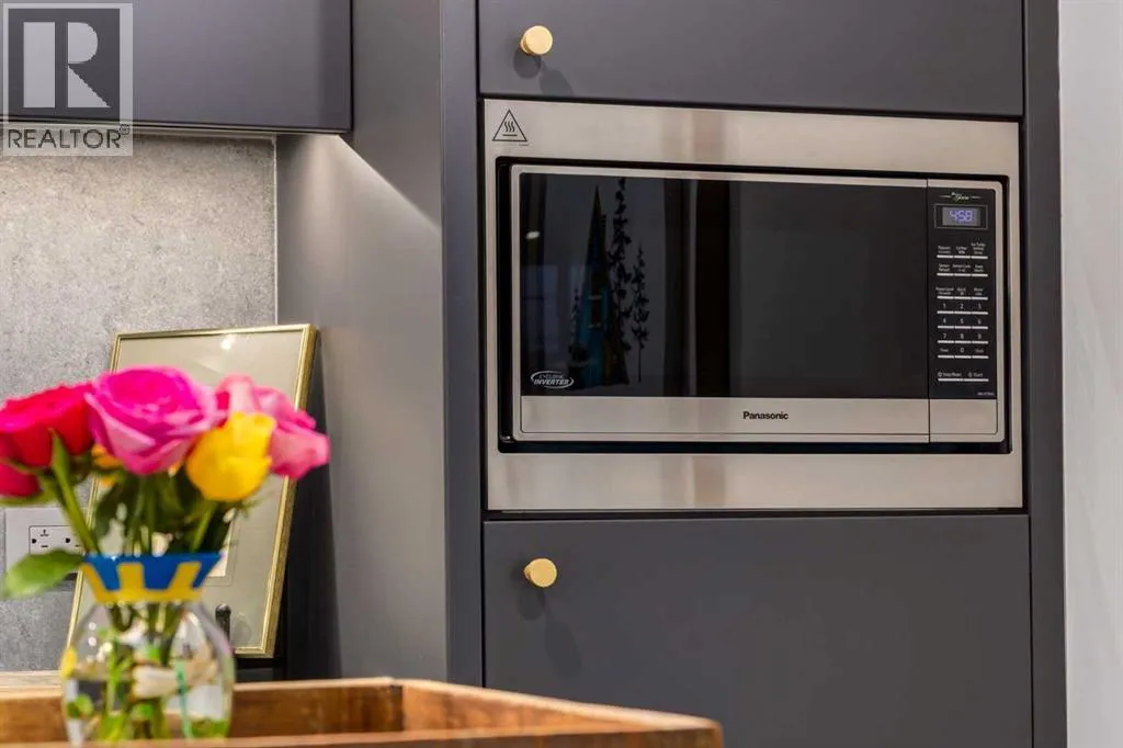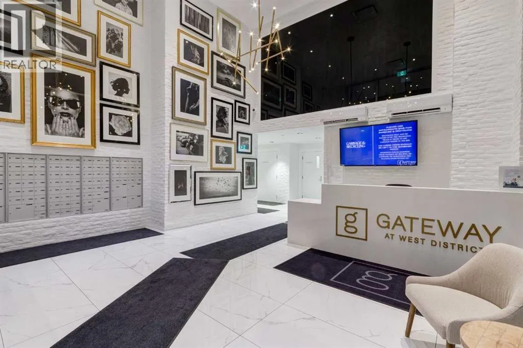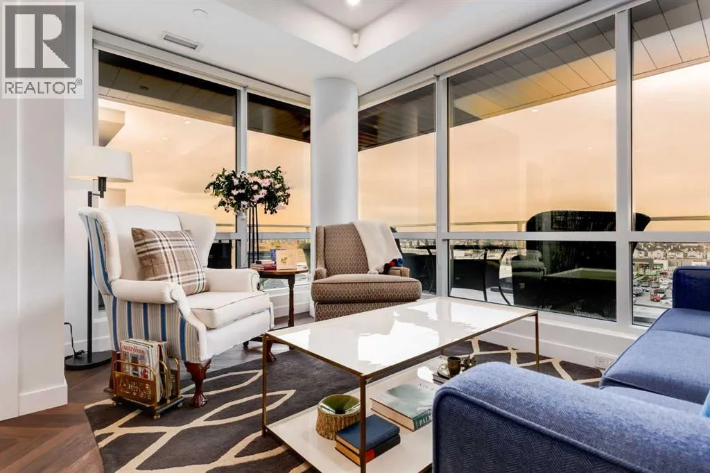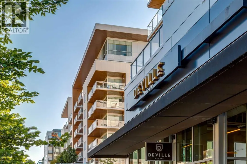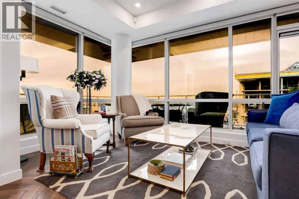 Experience elevated urban living in this warm and inviting two-bedroom residence offering over 1,100 square feet of thoughtfully designed interior space and a wraparound terrace perfect for everyday outdoor living and relaxed entertaining. Blending a cozy Ralph Laurenâinspired aesthetic with modern finishes, this home features chevron-patterned flooring, designer lighting, and flat-painted ceilings that create a timeless atmosphere throughout. The chef-inspired kitchen is the heart of the home, showcasing matte grey slate cabinetry with soft-close hardware, brushed-gold accents, quartz countertops, and a matching backsplash. Premium appliances include a Frigidaire induction cooktop, Elica hood fan, Fisher & Paykel integrated fridge and freezer, and Whirlpool oven, complemented by a deep grey Blanco sink, elegant black pendant lighting, and a spacious walk-in pantry. The open living room and dining areas are bathed in natural light from expansive windows that frame stunning mountain views, while a charming reading/coffee nook offers the perfect spot to unwind or start your day. The versatile second bedroom can easily serve as a guest room, home office, or creative space, complete with a walk-in closet and a stylish four-piece bathroom. The primary suite feels calm and comforting, with warm neutral tones, a walk-in closet, and a spa-like ensuite featuring dual vanities, quartz countertops, and a glass-enclosed shower. Additional features include a new Electrolux washer and dryer, generous linen storage, one titled underground parking stall, and two large storage units. The wraparound terrace enhances daily living with ample space for outdoor lounging and garden greenery, creating a private retreat in the heart of the city. Residents enjoy access to premium amenities including a rooftop patio, private ownerâs lounge, secure underground visitor parking, bike storage, EV charging stations, and concierge services. Ideally located in Calgaryâs West District, you are surrou nded by parks, walking paths, boutique shops, cafés, and dining options. Book your private viewing today! (id:27476)