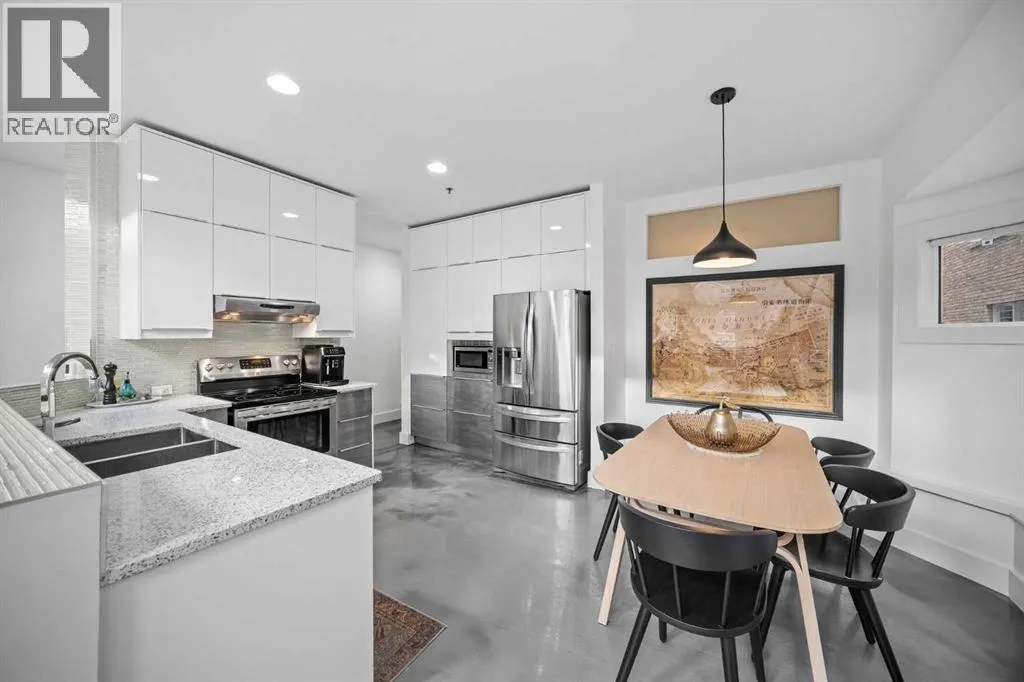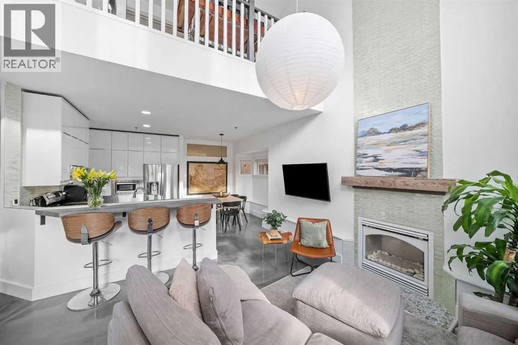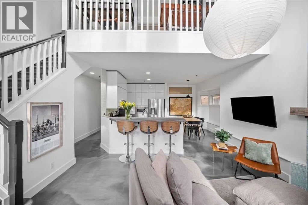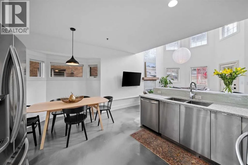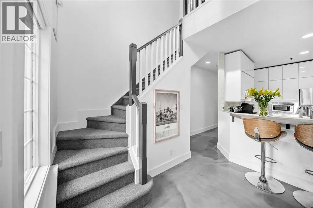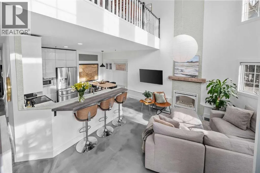 Welcome to a rare loft style sanctuary in Lower Mount Royal where soaring 18 foot ceilings, beautiful updates, and a walkable inner city location create an unforgettable living experience. From the moment you step inside you are greeted with newly updated doors and knobs that bring a fresh modern feel. The entry opens into the main floor living space with heated concrete floors throughout that keep the home warm and cozy through the colder months.The kitchen features sleek stainless steel appliances, ample prep space, and a new breakfast bar that offers a casual spot for everyday meals or cocktails before heading out to the boutiques, dining, lounges, and fitness studios just steps from your door. Beside the kitchen is the dining area which now features a newly constructed wall with a transom window. Previously this space had doors leading into the flex bedroom, but the new wall provides stronger separation, privacy, and functionality while still allowing natural light to flow through. It creates a more defined dining experience and elevates the entire main floor layout.The living room is bright and inviting with large south facing windows that fill the room with sunlight and open onto a private patio perfect for quiet mornings or unwinding at the end of the day. A new custom mantle adds warmth and architectural interest that complements the modern loft style aesthetic.Heading upstairs the newly carpeted stairs add softness and sound reduction as you transition to the loft. This upper level is an impressive open flex space ideal for a home office, fitness area, reading lounge, or cozy retreat. An updated storage closet adds even more functionality for those who value thoughtful organization.The spacious primary suite sits just beyond the loft and feels calm and elevated with its updated ceiling and new pot lights that offer gentle, ambient illumination. This level also includes a generous walk in closet and a private ensuite with double sinks and a large sho wer, creating a relaxing space to begin and end each day.A second full bathroom on the main level makes hosting guests or accommodating roommates effortless. Added conveniences include in suite laundry, a heated underground stall with storage, and pet friendly living. With direct first floor access and no elevator required, coming and going is easy and efficient.Set in one of Calgaryâs most beloved inner city communities, this home offers tree lined streets, charming cafes, specialty studios, world class dining, and lively lounges all within a short stroll. This is urban loft living at its most effortless with space, style, comfort, and walkability in perfect harmony. (id:27476)