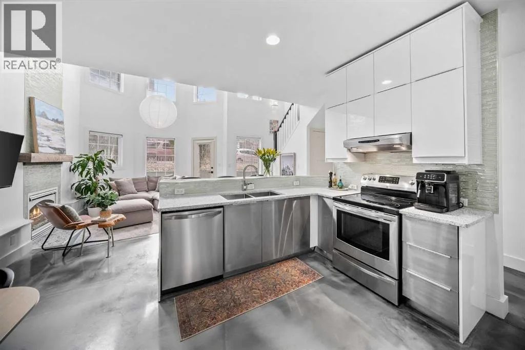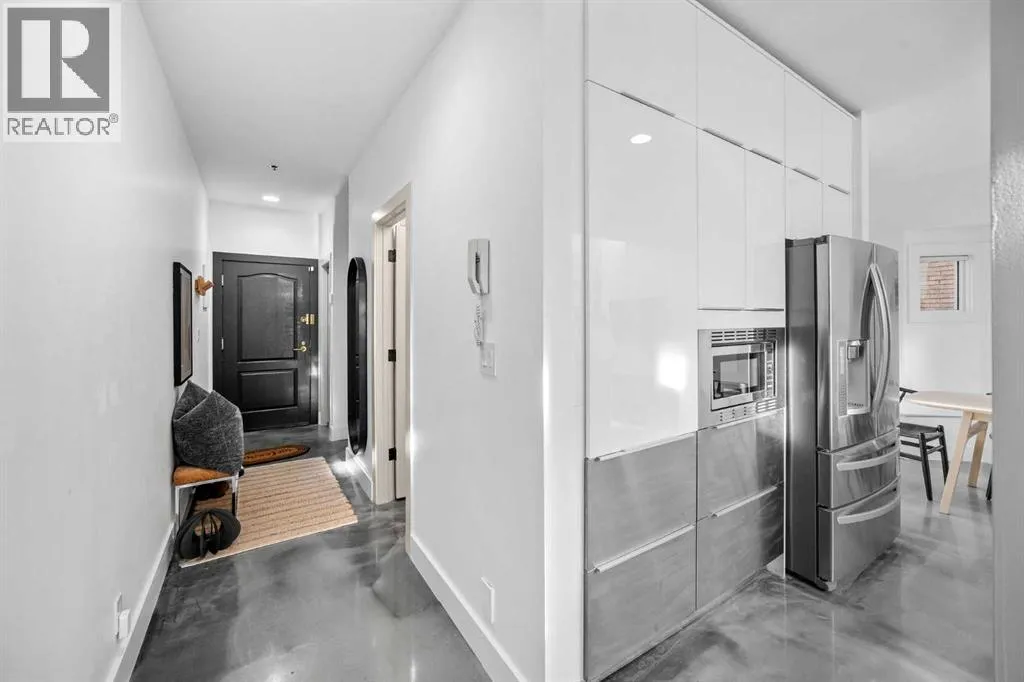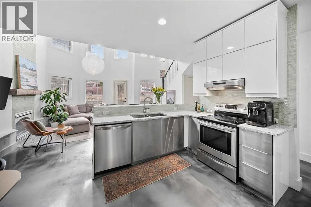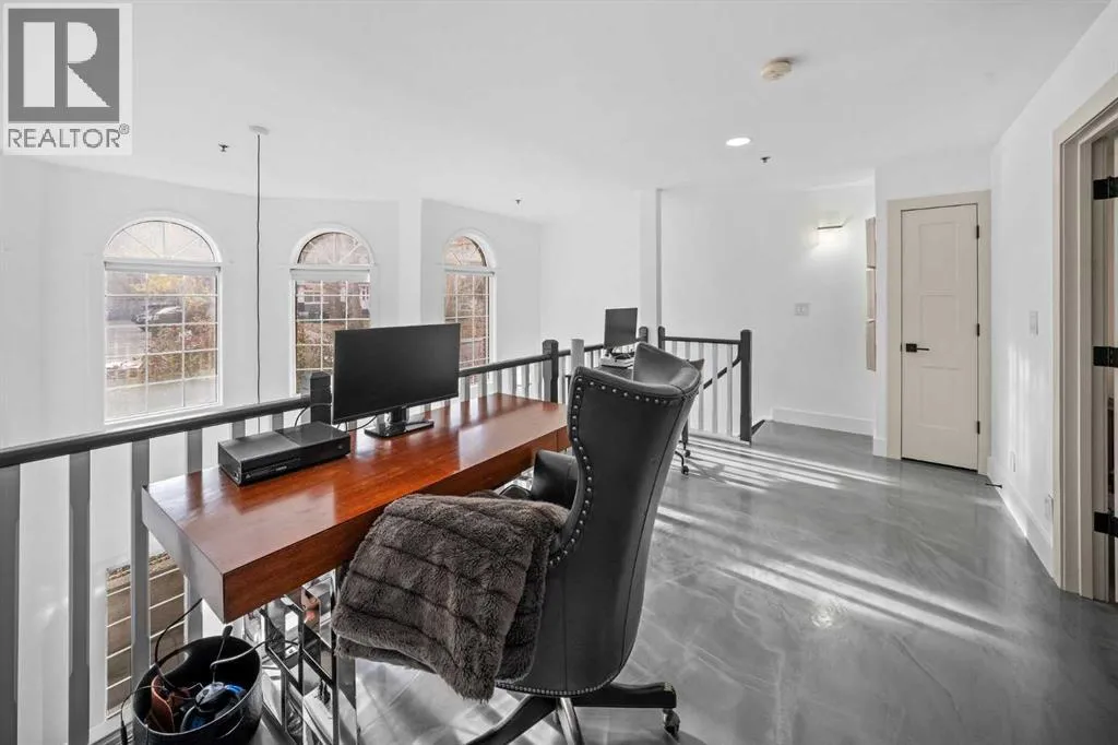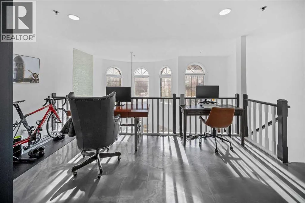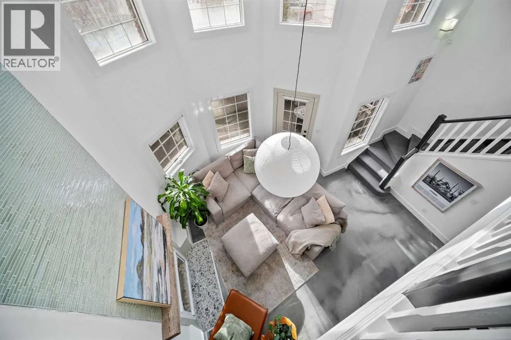 Welcome to a rare loft style sanctuary in Lower Mount Royal where soaring 18 foot ceilings, beautiful updates, and a walkable inner city location create an unforgettable living experience. From the moment you step inside you are greeted with newly updated doors and knobs that bring a fresh modern feel. The entry opens into the main floor living space with heated concrete floors throughout that keep the home warm and cozy through the colder months.The kitchen features sleek stainless steel appliances, ample prep space, and a new breakfast bar that offers a casual spot for everyday meals or cocktails before heading out to the boutiques, dining, lounges, and fitness studios just steps from your door. Beside the kitchen is the dining area which now features a newly constructed wall with a transom window. Previously this space had doors leading into the flex bedroom, but the new wall provides stronger separation, privacy, and functionality while still allowing natural light to flow through. It creates a more defined dining experience and elevates the entire main floor layout.The living room is bright and inviting with large south facing windows that fill the room with sunlight and open onto a private patio perfect for quiet mornings or unwinding at the end of the day. A new custom mantle adds warmth and architectural interest that complements the modern loft style aesthetic.Heading upstairs the newly carpeted stairs add softness and sound reduction as you transition to the loft. This upper level is an impressive open flex space ideal for a home office, fitness area, reading lounge, or cozy retreat. An updated storage closet adds even more functionality for those who value thoughtful organization.The spacious primary suite sits just beyond the loft and feels calm and elevated with its updated ceiling and new pot lights that offer gentle, ambient illumination. This level also includes a generous walk in closet and a private ensuite with double sinks and a large sho wer, creating a relaxing space to begin and end each day.A second full bathroom on the main level makes hosting guests or accommodating roommates effortless. Added conveniences include in suite laundry, a heated underground stall with storage, and pet friendly living. With direct first floor access and no elevator required, coming and going is easy and efficient.Set in one of Calgaryâs most beloved inner city communities, this home offers tree lined streets, charming cafes, specialty studios, world class dining, and lively lounges all within a short stroll. This is urban loft living at its most effortless with space, style, comfort, and walkability in perfect harmony. (id:27476)