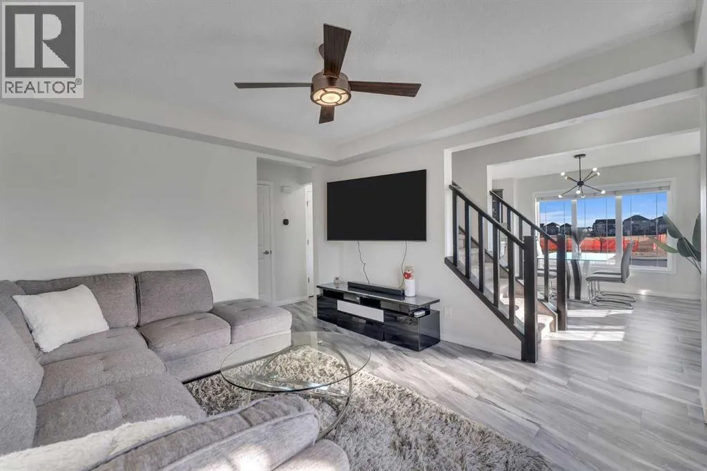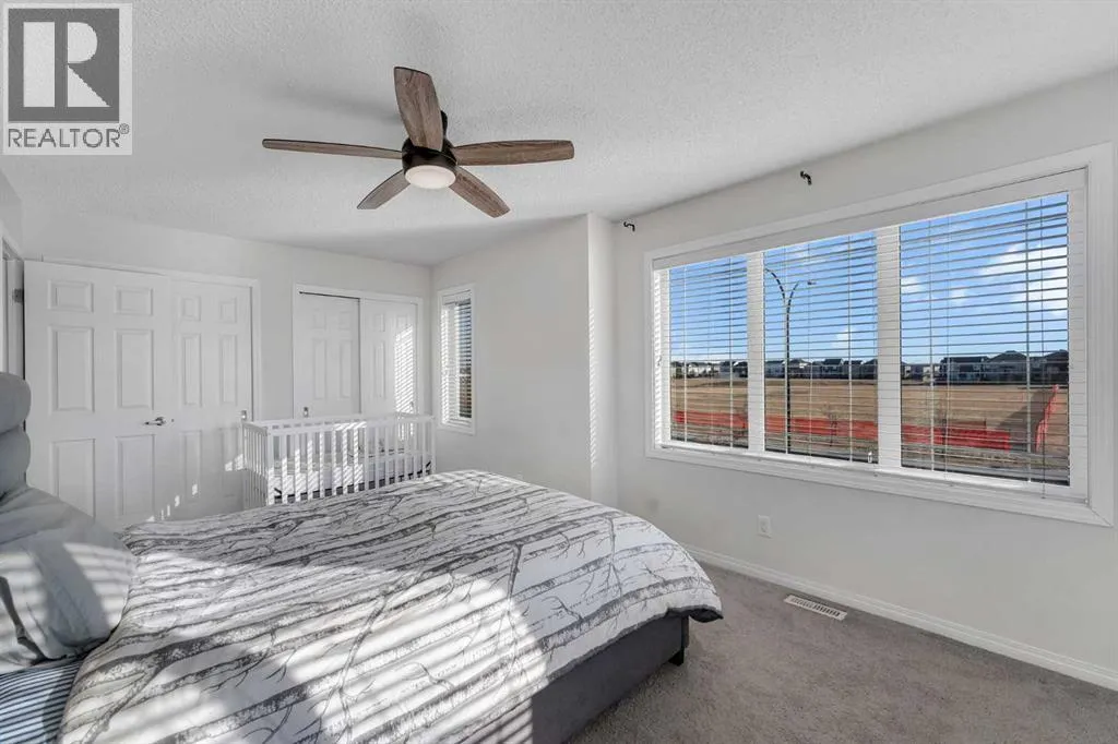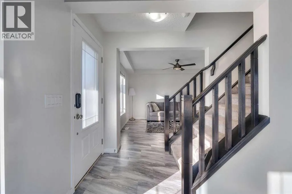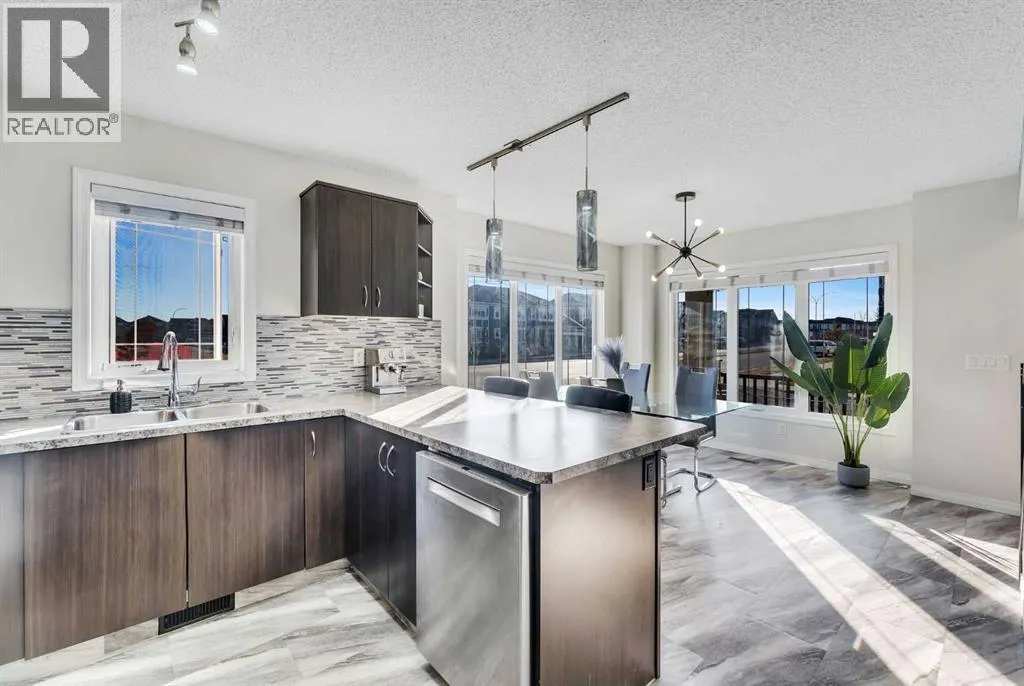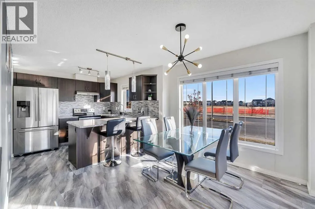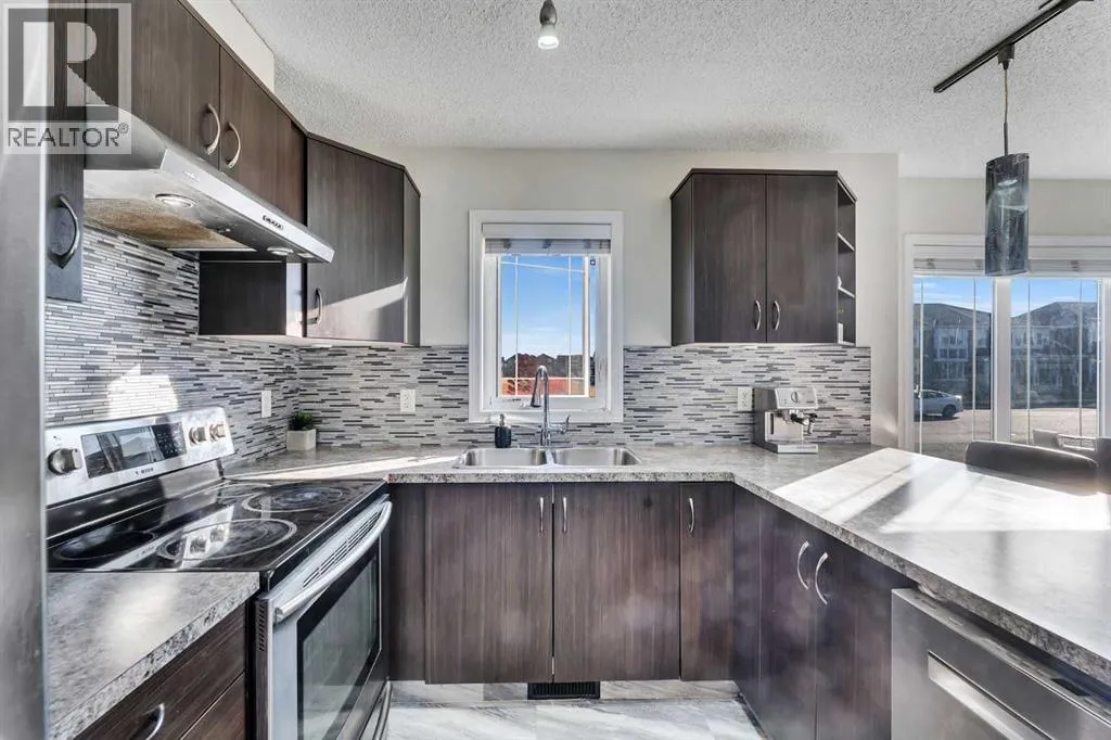 Beautiful townhome with no condo fees, a double attached garage, and air conditioning.This end-unit townhouse features modern décor throughout and luxury vinyl tile flooring on the main level. The spacious living room is perfect for entertaining. The stunning kitchen includes rich cabinetry, stainless steel appliances, a peninsula with a breakfast bar, modern lighting, and is open to the dining area.The upper level offers two primary bedrooms, each with its own ensuite bathroom and walk-in closet. A bright bonus roomâideal as an office or second living spaceâfeatures sliding doors that lead to a private deck. Conveniently, the laundry is also located on the second level. (id:27476)