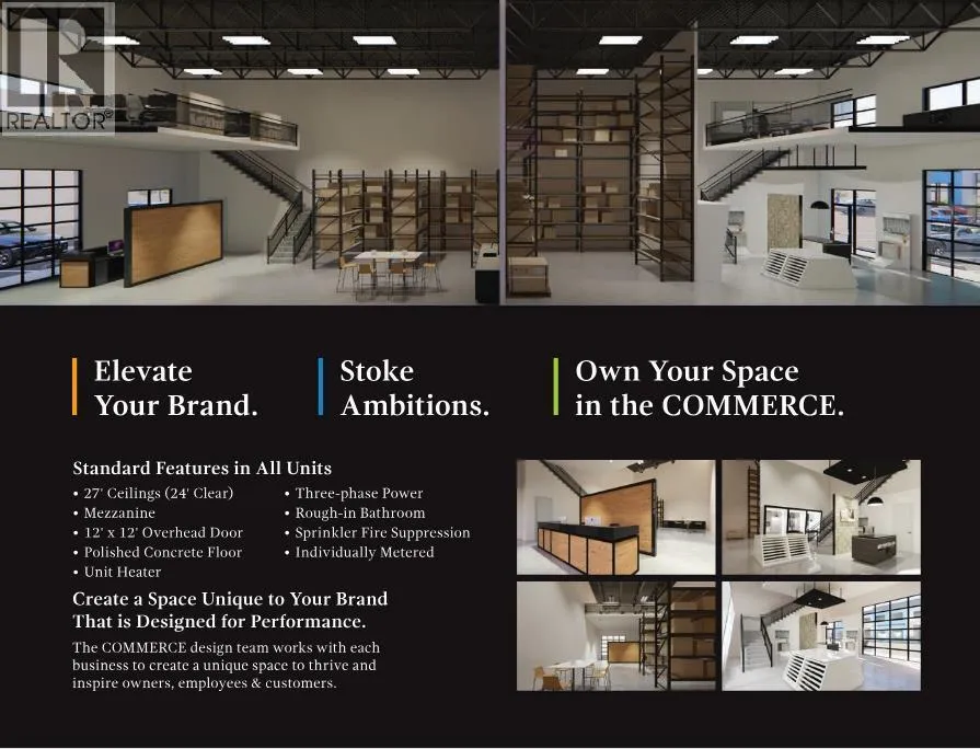 Premium Commercial Space in Calgaryâs Southwest THE COMMERCELocated near Calgaryâs prestigious SW communities and the city centre, THE COMMERCE offers premium commercial bays ideal for a wide range of professional businesses. Its highly visible and accessible location naturally attracts a discerning clientele, making it an excellent fit for companies seeking a strong presence in this sought-after area.With flexible sizing options and the ability to customize, each bay provides over 2,000 sq. ft. including mezzanine potential. The building features contemporary architectural design and clean, modern lines, giving businesses the opportunity to create a professional space that reflects quality and sophistication. High ceilings, open layouts, and the potential for premium interior finishes allow you to design a welcoming and elevated environment tailored to your needs.Whether you envision a well-lit showroom, a polished workspace, or a customer-focused lounge on the mezzanine, the bays offer the versatility to bring your concept to life. Ample parking and convenient access ensure ease for both clients and employees.While the location is well suited to businesses connected to the nearby VAULTS community and its clientele, THE COMMERCE also supports a wide range of compatible commercial uses. Its placement in an area home to many high-net-worth individuals provides strong potential for businesses looking to serve an established, affluent market.More details available in the photos and supplements. (id:27476)