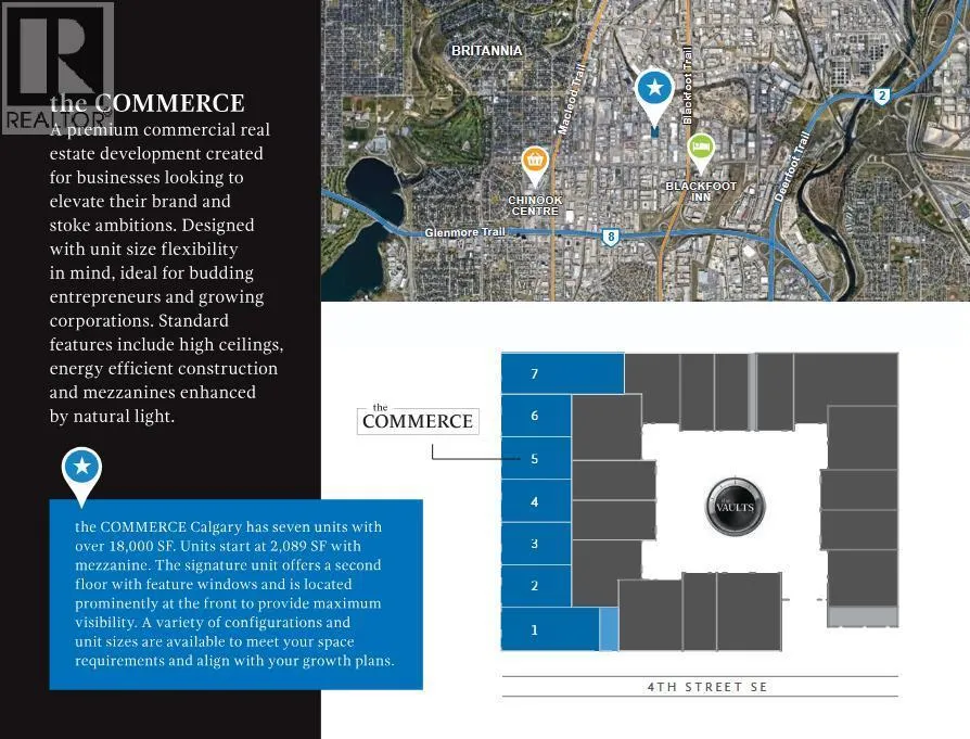 Premium Commercial Space in Calgary’s Southwest THE COMMERCELocated near Calgary’s prestigious SW communities and the city centre, THE COMMERCE offers premium commercial bays ideal for a wide range of professional businesses. Its highly visible and accessible location naturally attracts a discerning clientele, making it an excellent fit for companies seeking a strong presence in this sought-after area.With flexible sizing options and the ability to customize, each bay provides over 2,000 sq. ft. including mezzanine potential. The building features contemporary architectural design and clean, modern lines, giving businesses the opportunity to create a professional space that reflects quality and sophistication. High ceilings, open layouts, and the potential for premium interior finishes allow you to design a welcoming and elevated environment tailored to your needs.Whether you envision a well-lit showroom, a polished workspace, or a customer-focused lounge on the mezzanine, the bays offer the versatility to bring your concept to life. Ample parking and convenient access ensure ease for both clients and employees.While the location is well suited to businesses connected to the nearby VAULTS community and its clientele, THE COMMERCE also supports a wide range of compatible commercial uses. Its placement in an area home to many high-net-worth individuals provides strong potential for businesses looking to serve an established, affluent market.More details available in the photos and supplements. (id:27476)
