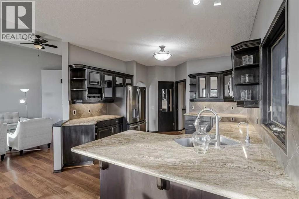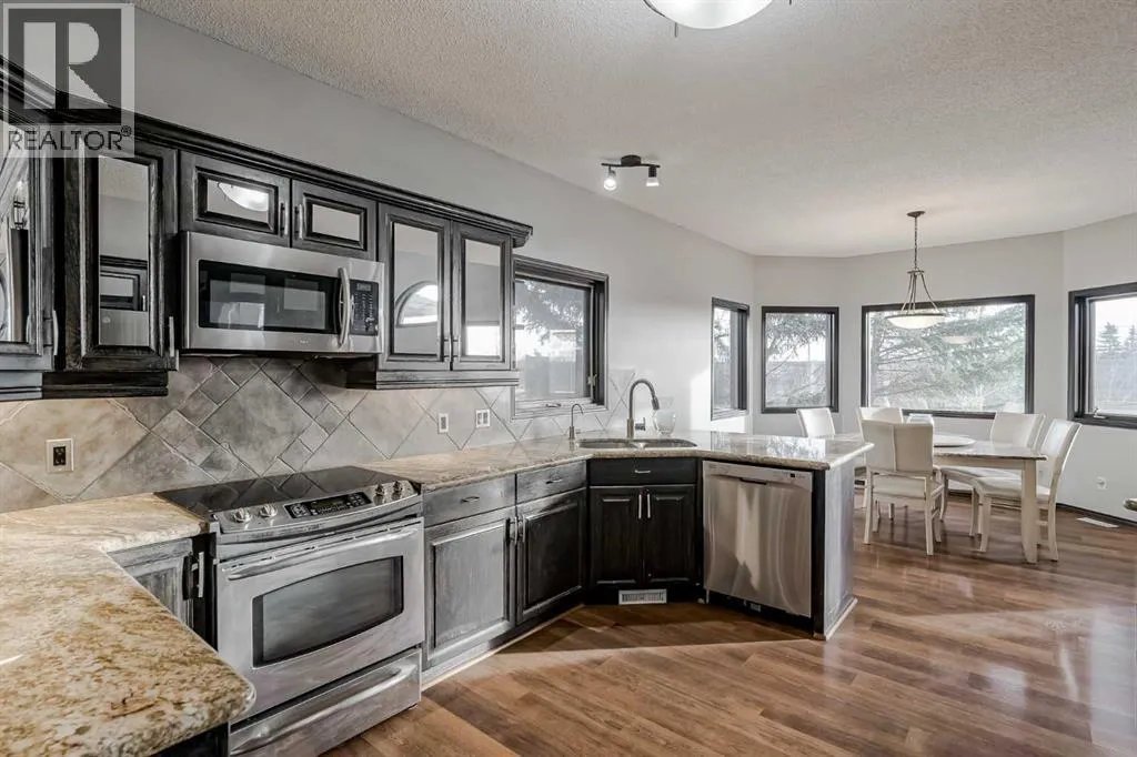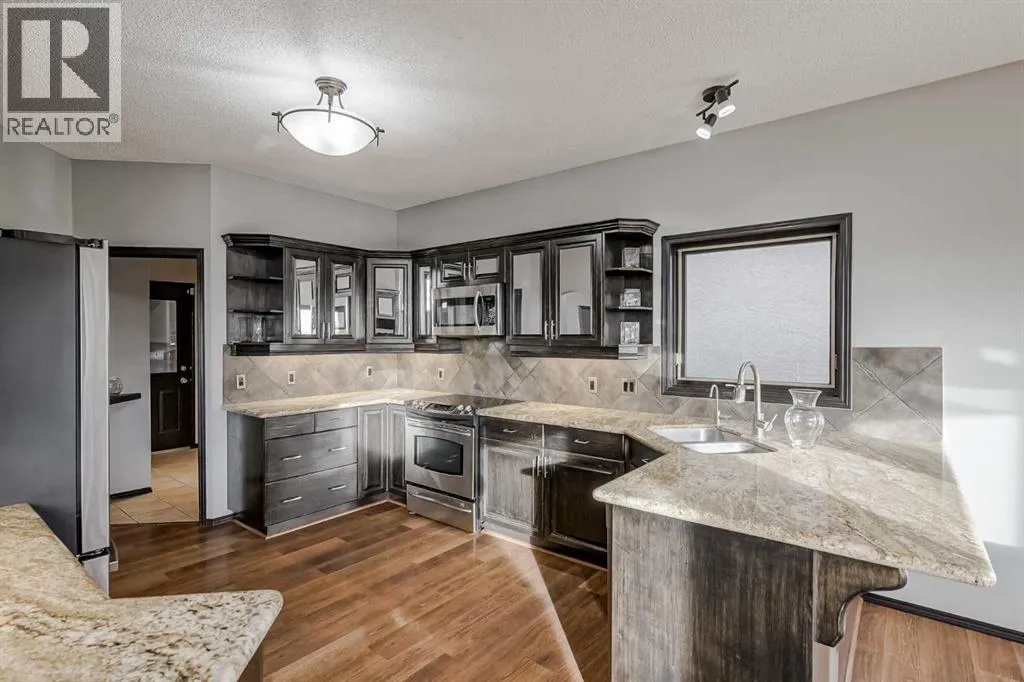 **OPEN HOUSE SAT NOV 22 & SUN NOV 23 12PM-4PM** Get excited! This fully finished bungalow delivers almost 2800 sqft of developed living space, style, LAKE PRIVILEGES, and the perfect foundation to make it truly your own! From the moment you step inside, the soaring 12' ceilings, rich dark-stained cabinetry and trim, and stylish laminate flooring create an impressive and welcoming atmosphere. **The bright, open kitchen is designed for both cooking and gathering, featuring abundant cabinetry, granite counters, stainless steel appliances, a handy eating bar, and a spacious dining area that flows right out to the deck (12' x 21'). The primary bedroom also offers direct deck accessâyour own private retreatâwith a walk-in closet and a relaxing ensuite complete with corner jetted tub, separate shower, vanity, and makeup desk. A main floor office adds the perfect workspace, flex room OR SECOND BEDROOM UP! **The walkout basement delivers even more living space, boasting laminate flooring throughout, a cozy family room with a second fireplace, a huge recreation room for entertaining, two additional bedrooms, a full bathroom, and plenty of storage. **Outside, enjoy a beautifully landscaped backyard featuring a patio, shed, RV parking off the back lane, and the added bonus of a double attached front garage. Plus, enjoy peace of mind knowing all Poly-B plumbing has been recently replaced. **This home truly has it all - style, space, upgrades, and an amazing location, ready for your personal touch!** (id:27476)