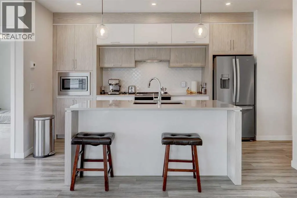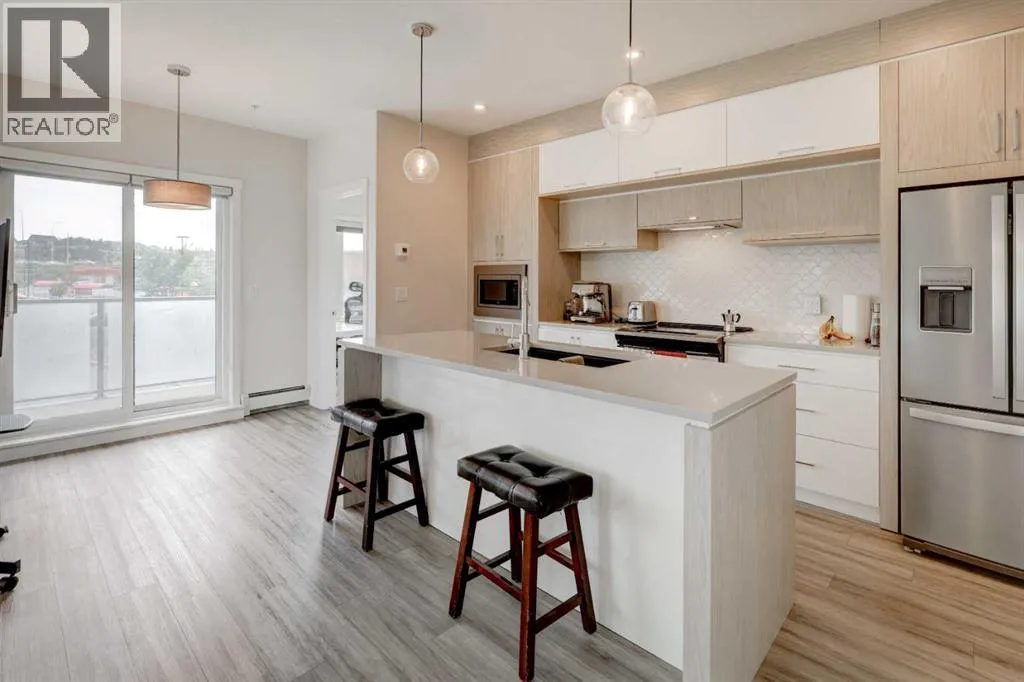 Welcome to 315, 138 Sage Valley Common NWâan exceptional 2-bedroom, 2-bathroom condominium offering luxurious living in the heart of Sage Hill. This is a rare, first-time market offering from the original owner, showcasing meticulous care and pride of ownership. With its unbeatable location, this home effortlessly blends elegance with convenience. As you step inside, you'll be greeted by an open-concept layout, drenched in natural light and featuring a sophisticated neutral color scheme. The luxury vinyl plank flooring creates a seamless flow throughout, while high-end stainless steel appliances, including a full-size front-load washer and dryer, enhance the overall living experience. The kitchen is a chefâs dream, featuring sleek quartz countertops and an oversized island ideal for meal prep and entertaining. Comfort is at the forefront with large windows that fill the space with warmth and light. The spacious living and dining areas provide flexible options for relaxation and hosting. The primary bedroom includes a generous walk thru closet for all your storage needs and a 3-piece bathroom. While the second bedroom and well-appointed 4-piece bathroom create an inviting atmosphere, perfect for guests or as a private office.Step out onto the private balcony, where a gas line for BBQs sets the stage for outdoor dining and gatherings. Additional perks include titled underground parking and a convenient storage locker. This building is ideally located next to a plaza, offering all the amenities you could need, including Co-op Grocery, daycare services, Shoppers Drug Mart, Tim Hortons, restaurants, Anytime Fitness, a gas station, and moreâall just steps away. Plus, youâre only 20 minutes from Calgary International Airport and 25 minutes from downtown Calgary, with parks and playgrounds nearby. Don't miss the chance to call this beautiful home yours! (id:27476)