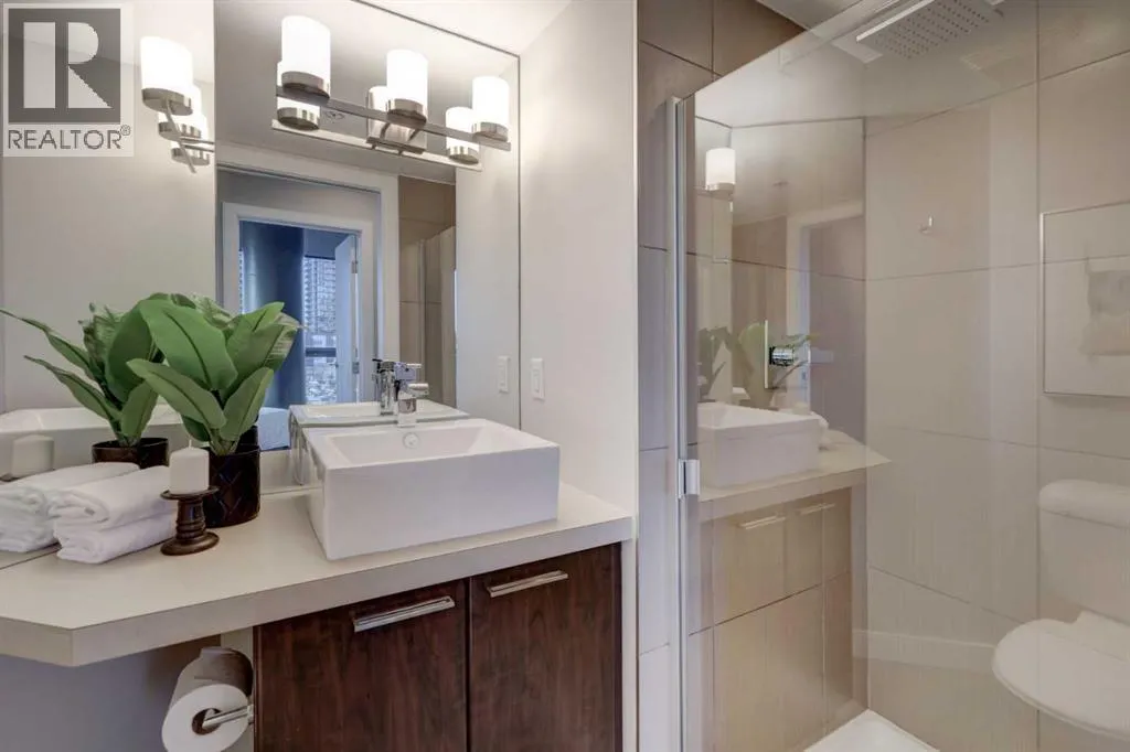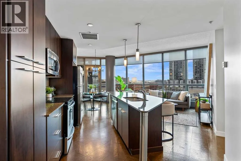 This upgraded 2-bedroom, 2-bathroom corner condo in the Keynote 1 building is move-in ready and waiting for you to call home. The open-concept layout connects the kitchen, dining area, and living room, with a prime east-facing view that creates an inviting space and an ideal place to entertain. It has been meticulously prepared for the new owner with freshly painted throughout (walls, doors, baseboard, trim, kitchen bulkhead), new plush carpet/underlay in the bedrooms, dishwasher (2023), washer and dryer (2025), three-panel organizer in the walkthrough closet in the primary bedroom, light fixtures, and professionally cleaned. Other key features include floor-to-ceiling windows for maximum natural light and a front-row view of the Stampede fireworks, stainless steel appliances, granite countertops, central air conditioning in the main living area, a no-pet home, titled heated underground parking, titled storage locker, and concrete construction for superior sound-dampening and durability. Living at Keynote 1, youâll have an on-site manager, access to the fully equipped fitness facilities (weights and cardio room), two guest suites, ownerâs lounge with TVs, pool table, partial kitchen, BBQs, outdoor patio, plus 15 rooftop oasis, bike storage, plus direct access to Sunterra Market. Keynote 1 offers high-quality living, affordability, and an ultra-convenient location to downtown, local lifestyle amenities, the Stampede Ctrain station, the Plus 15 Skywalk system, and easy access to main thoroughfares for city-wide access. (id:27476)