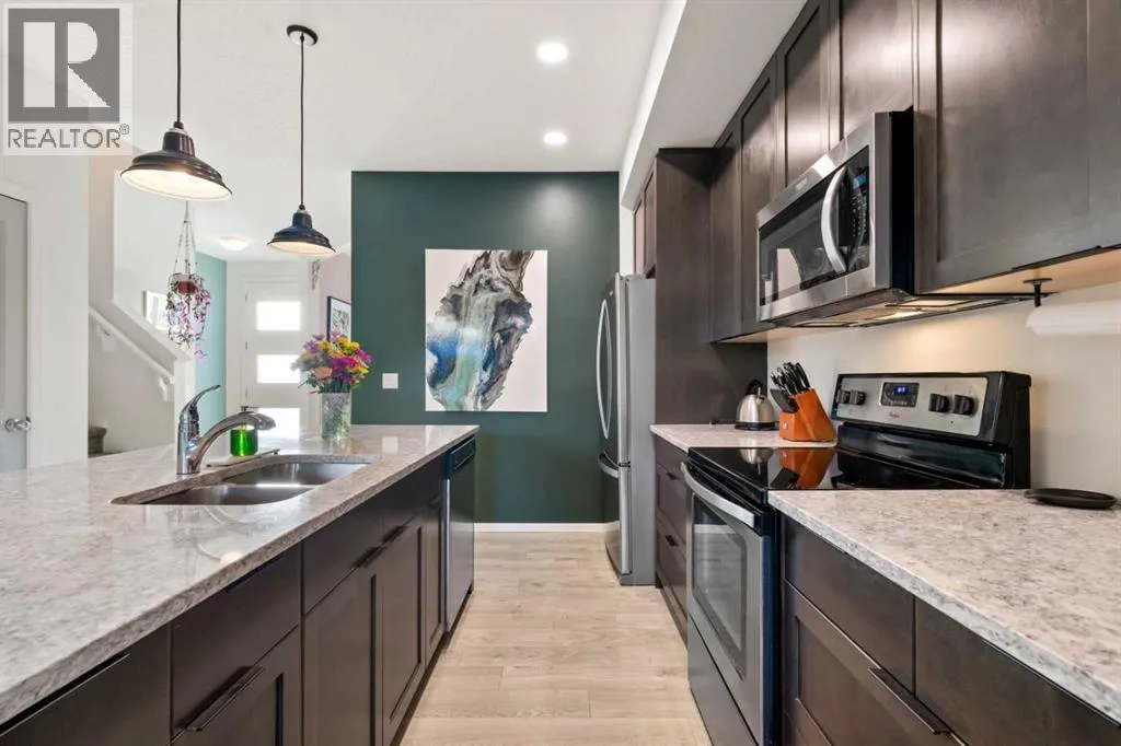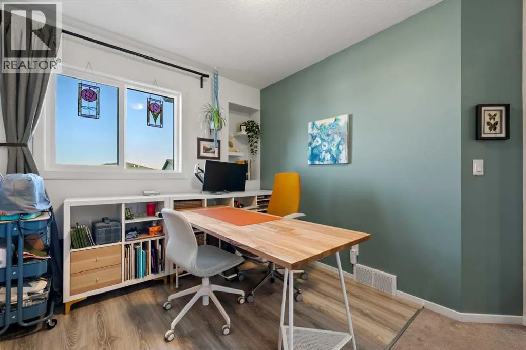 Welcome to 1307 Walden Drive SE â a beautifully cared-for and thoughtfully upgraded duplex in the heart of Walden, offering 1,633 sq ft of bright, comfortable living. From the moment you step inside, the home has a calming, intentional feel, with natural light pouring through large windows and spaces that genuinely work for everyday life.The front of the home opens into a standout flex space thatâs currently set up as a study, warmed by built-in bookshelves, big windows, and soft South-facing natural light. Itâs one of those rooms that immediately feels lived-in and loved â perfect for working, reading, or simply settling in with your morning coffee.The kitchen is anchored by quartz counters, upgraded lighting, and an island that makes the entire main floor feel connected. From here, you look across the dining and living areas, creating a clean and cohesive finish throughout. The living room is bright and inviting, framed by upgraded fixtures and a large windows, with direct access to the backyard through the rear entrance mud room.Upstairs is where this home truly shines. The primary bedroom is a retreat in every sense â vaulted ceilings, incredible natural light through a nearly floor-to-ceiling window with a sliding door, and a charming Juliet balcony that brings a boutique feel to the space. The ensuite is equally impressive, offering a separate shower and deep soaker tub, along with a spacious walk-in closet complete with a window. Itâs a suite that feels special, comfortable, and genuinely relaxing. Two additional bedrooms and another full bathroom complete the functional and impressive upper level.The basement is unfinished but well thought out, with rough-ins for both a bathroom and a wet bar, with floor plans showing a smart layout option for future development.Outside, the backyard is private and low-maintenance, with a back deck built in 2021, raised flower beds added in 2022, and pet-friendly artificial grass running along the side of the home â a p erfect dog-run setup that keeps things tidy year-round. The double detached garage is connected side-by-side with the neighbourâs and includes extra outlets for tools, hobbies, or working on projects.Additional upgrades include air conditioning installed in 2024 and the home was professionally repainted in 2022 including spraying the doors.This is a warm, welcoming home in a great community â thoughtfully designed, updated where it counts, and ready for its next chapter. (id:27476)