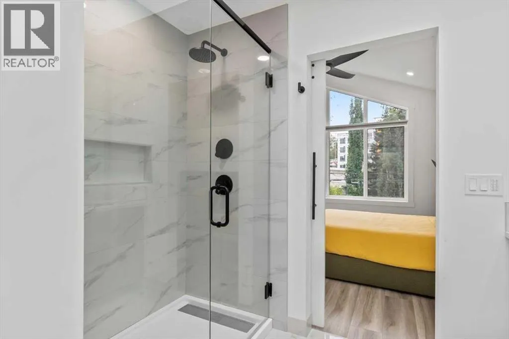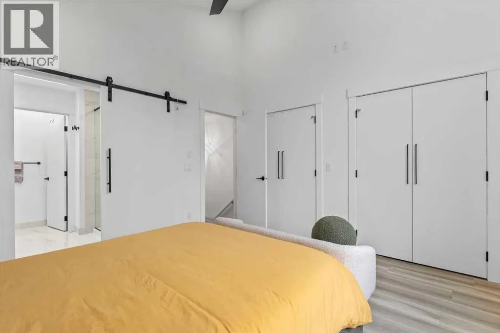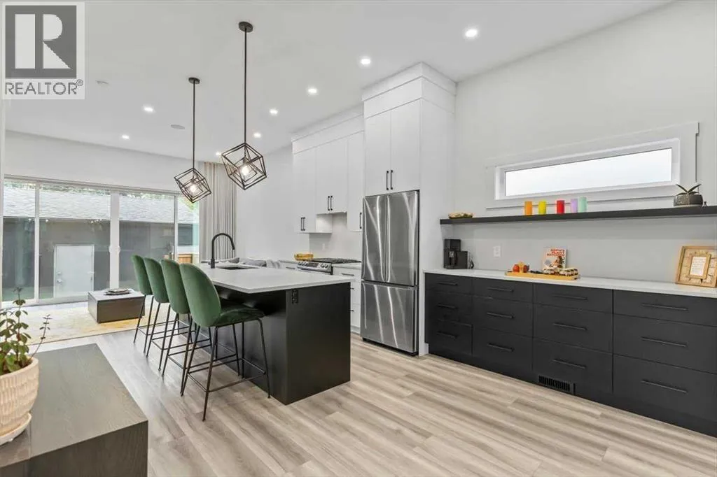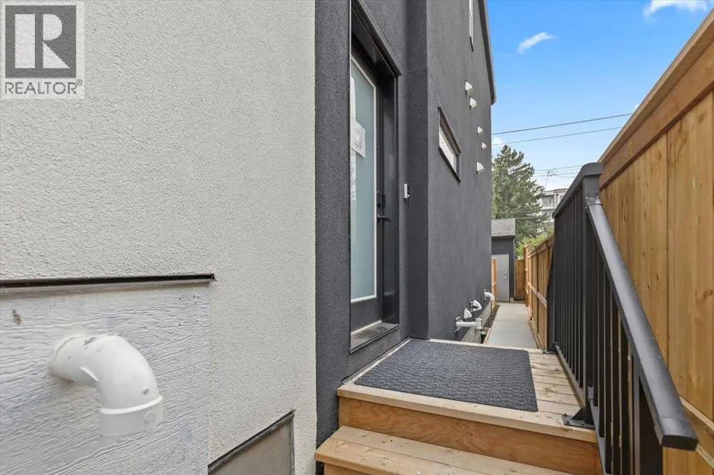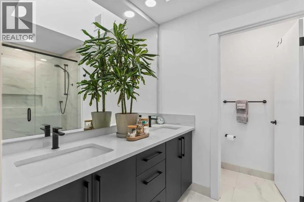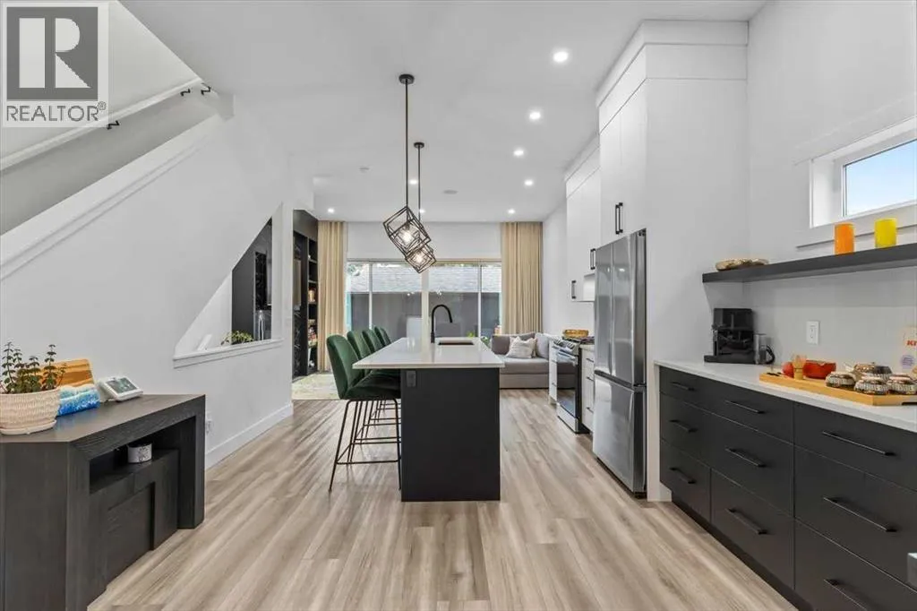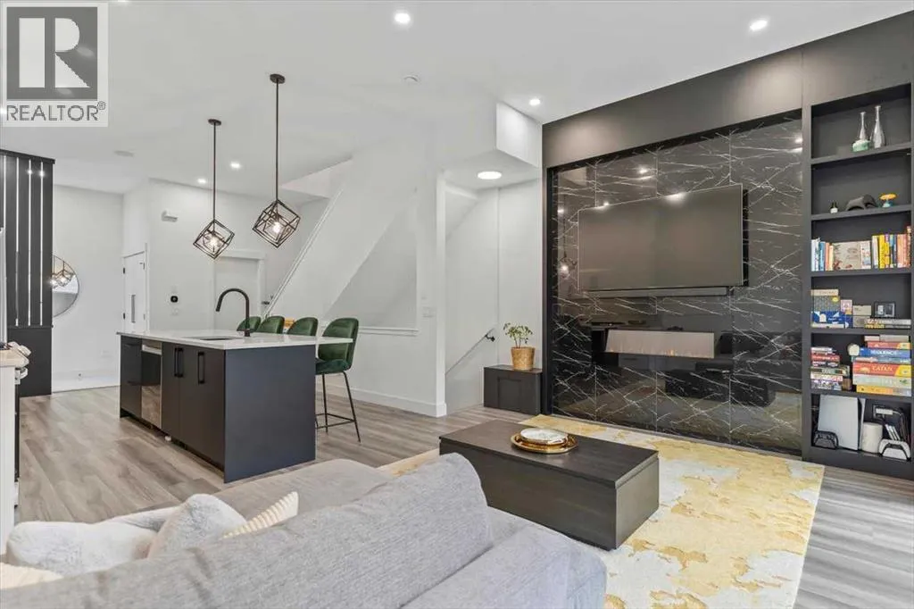 Welcome to this Immaculate and thoughtfully designed town home in the heart of Marda Loop, over 1,700 sq ft of living space, just minutes away from downtown. Features superior party wall system between units. Main floor showcases 11 ft ceiling, open concept layout, vinyl plank flooring, designer built entry unit. The living room is spacious featuring a wall unit, sleek tile, and a Bluetooth enabled electric fireplace. The kitchen is equally impressive, boasting a large island with quartz counter top, ideal for entertaining, ample soft- close cabinetry, stainless steel appliances. The large south facing sliding door brings in rays of sunshine and light through out the day, tastefully covered with Hunter Douglas honeycomb shades and floor to ceiling blackout drapes for privacy professionally installed by Normandeau, overlookimg a fenced, cozy yard leading to a single detached garage.This floor is completed by a spacious guest half bath. Upstairs, the primary bedroom is a true retreat, with vaulted ceilings, double door his and hers closets, large windows with professionally installed electric blackout honeycomb shades. The barn door leads into a spa-like en-suite with heated flooring, double sink vanity, quartz counters, skylight, oversized tiled shower and dual shower heads. The second large bedroom also has it's own en-suite and skylight, plus manual honeycomb shades. The fully finished basement boasts a bright family/ flex room. A third spacious bedroom with a walk-in closet and a full bath. THIS HOME COMES WITH COUNTLESS UPGRADES- A/C, high efficiency furnace, humidifier, thankless hot water on demand, radon extraction sump pump, built-in speaker system, light dimmers in master bedroom, smart thermostat (ecobee), bathroom fan timers, kitchen and master bedroom lights can be manged through smartphone. This exceptional home offers the best of urban living in an ideal location. This is the one you have been waiting for. Book a showing today. (id:27476)