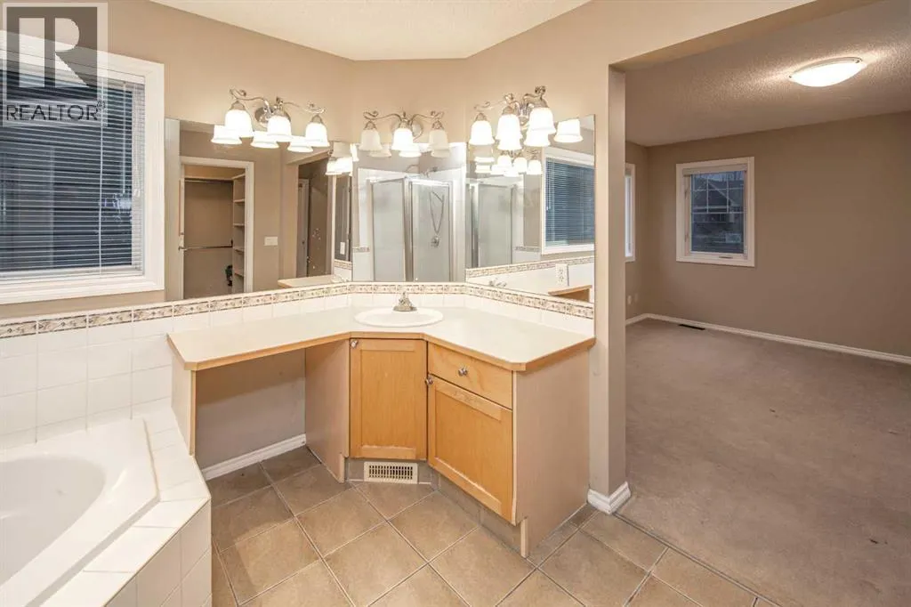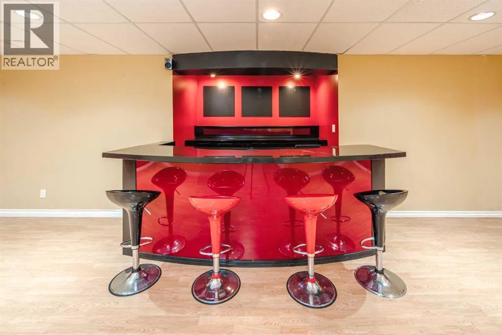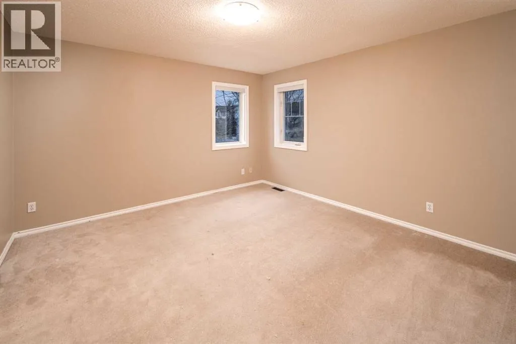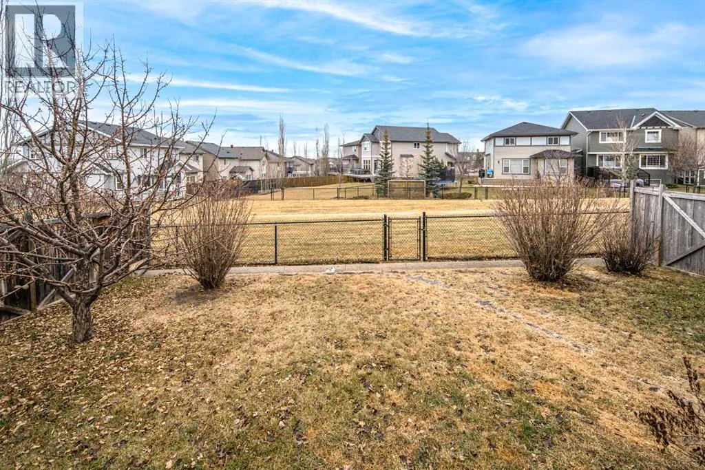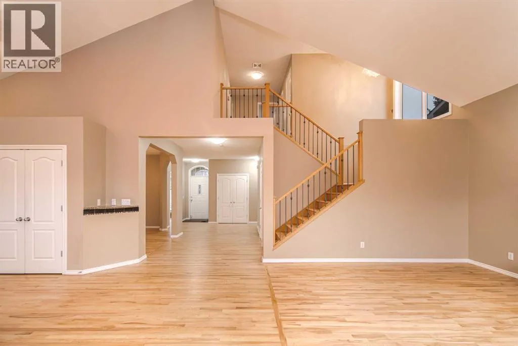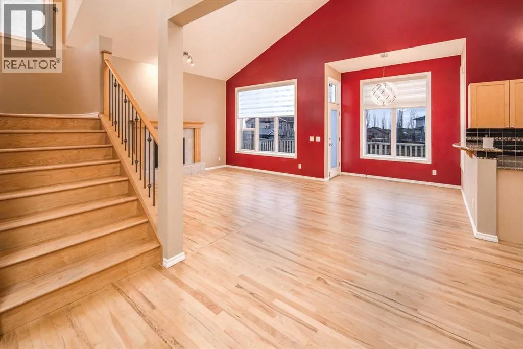 Backing onto a serene green belt, this cozy and well-kept 2-storey home is located in the highly sought-after community of Hanson Ranch. Offering a total of over 2,200 sq. ft. of living space, the main level features an open-concept design starting with a bright den/office, a spacious formal dining area, and a vaulted gourmet kitchen complete with granite countertops and maple cabinetry. The impressive 17-ft open-to-below living room is highlighted by a beautiful fireplace, while maple hardwood floors flow throughout the main floor.The upper level includes a generous primary bedroom with a 4-piece ensuite, along with two additional well-sized bedrooms. The fully finished basement adds even more value with a large family room featuring an elegant bar, a fourth bedroom, and a third full bathroom.Additional recent upgrades include new window coverings, new stove and fridge, and newly polished hardwood flooring throughout. The home also offers a double attached garage.Ideally located with easy access to Vivo Centre, Superstore, shopping, schools, and public transit.Call today for your private viewing â shows 10/10! (id:27476)