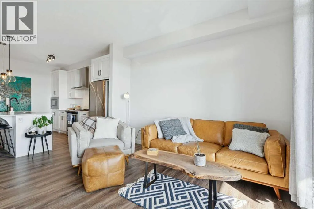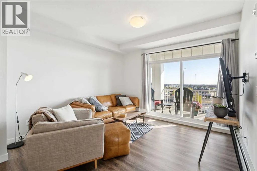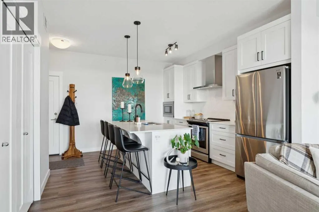 Look no further for your TOP floor unit with beautifully curated interiors and a functional layout. This unique "Pratt" layout by Logel Homes, is for the home buyer who wants a larger single bedroom and larger common areas- no small bedrooms here! Enjoy upgraded finishings like the herringbone tiled backsplash, stainless steel appliance package, trendy black pendant lights, luxury vinyl plank flooring throughout and an integrated microwave that helps the functionality of the kitchen flow seamlessly. The spacious bedroom accommodates large furniture and welcomes personal items & belongings with a walkthrough closet. Tucked past the closet is a 4-piece ensuite with a tiled bath/shower and sparkling quartz counter tops. The unit has a second bathroom for guests- offering convenience and privacy for the homeowners. Just off the cozy living room are sliding balcony doors that take you to your private outdoor hub- which includes a gas barbecue! We cannot forget to mention, one of the best features of Auburn Bay... LAKE ACCESS! Enjoy year-round exclusive access to the Home Owners Association which includes a splash park, tennis courts, a fishing dock, a boathouse, picnic tables, gymnasiums and more. Nearby services like South Health Campus (3 min drive) and grocery stores, shopping, entertainment and parks just a couple blocks away, makes Auburn Bay a community of choice for many. Complete with a titled parking stall (end stall) and an over-sized storage locker compared to other units, this is an ideal choice for vibrant living in one of Calgary's most desired neighbourhoods. LIKE-NEW, gently lived in, this unit is truly turn-key and could be yours today! *Mortgage at 1.69% may be assumed, subject to buyer qualification and lender approval. Please contact listing agent for details. (id:27476)