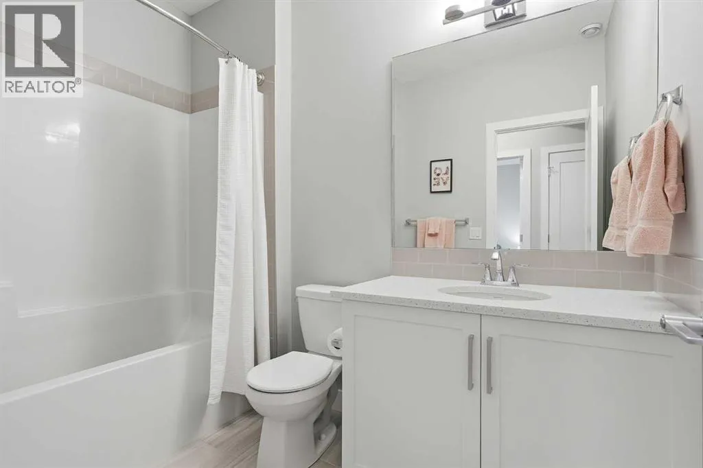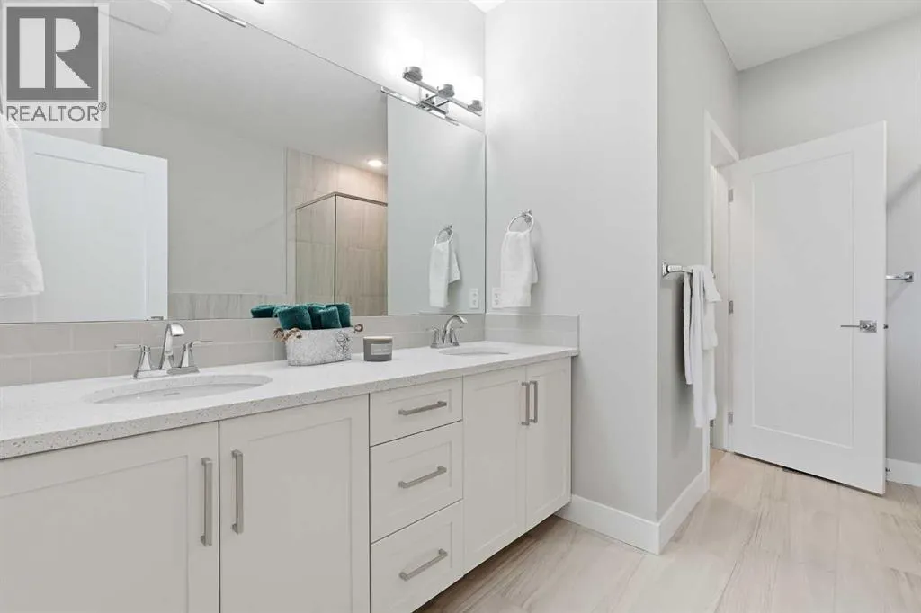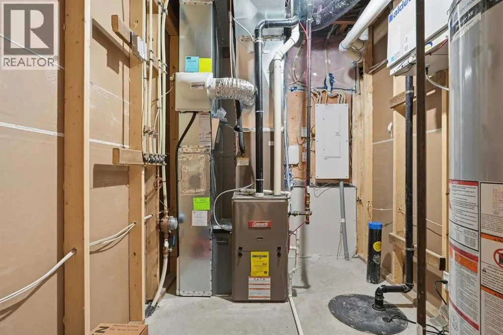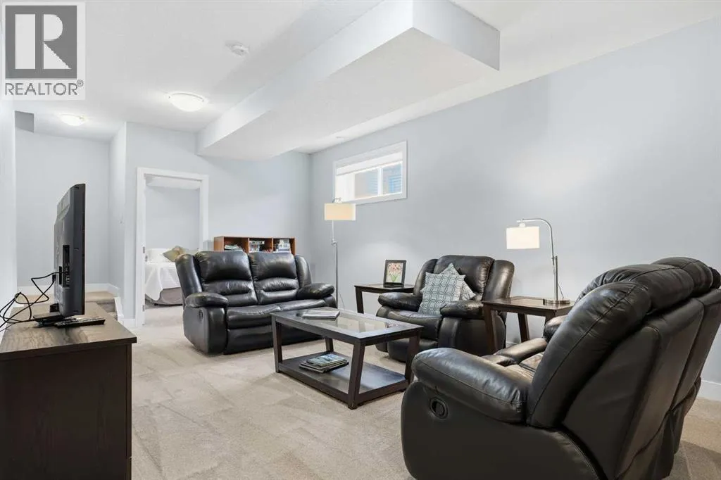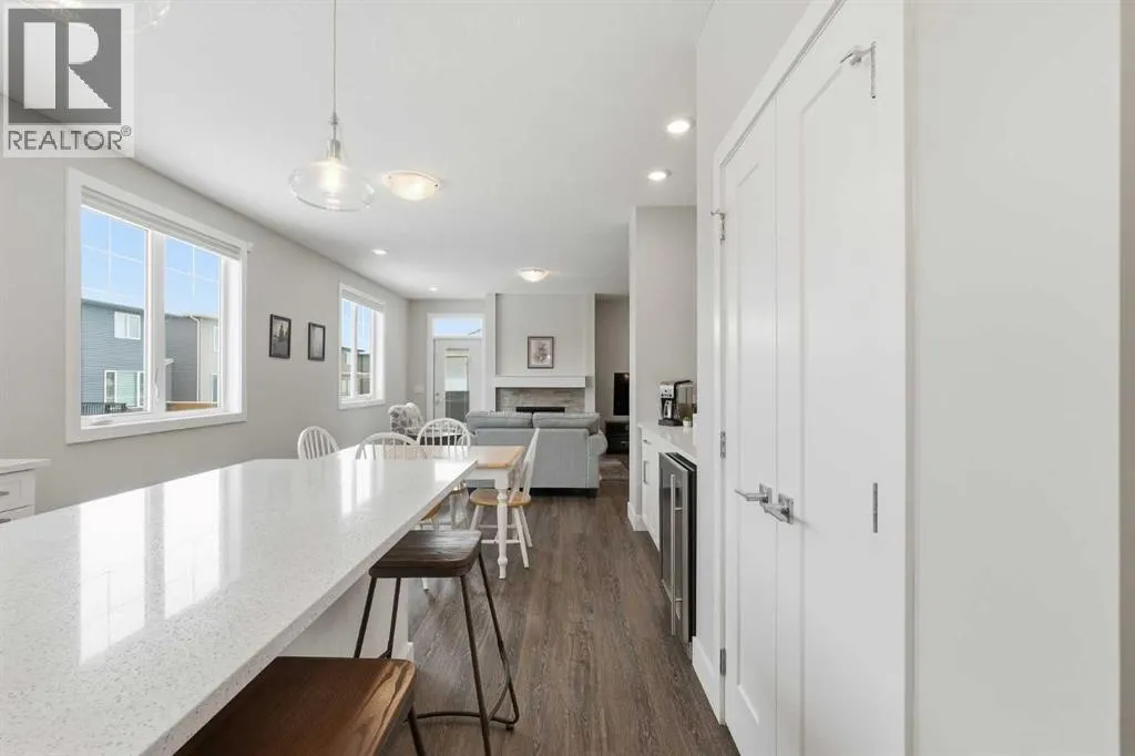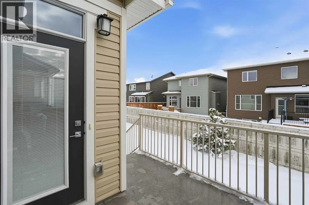 Experience the ease of lock-and-leave villa living in this nearly brand-new home, completed in 2024 and still carrying that fresh, new-home feel (and smell!) Elegantly and functionally designed, this low-maintenance villa offers tons of developed living space and is surrounded by everyday conveniences, including a nearby nature reserve, Spruce Meadows, shopping, and excellent access to major transportation routes. Inside, the home is loaded with upgrades. Through the front door youâre greeted with luxurious vinyl plank flooring underfoot, high ceilings above, and a neutral color palette throughout - each space absolutely drenched in natural sunlight. A quaint den to your right offers flexible use, while a handy half bath is thoughtfully tucked away from the main living and dining areas. Youâre then welcomed into the bright living room, featuring a gorgeous upgraded gas fireplace and access to your rear deck, complete with a gas hookup for your BBQ. The kitchen & dining area truly anchor the home with their âwowâ factor: extended height cabinets, a stunning hood fan, gas range, fridge with water, and a built-in microwave all form part of the upgraded appliance package. Quartz countertops make prep and cleanup effortless, while under-cabinet lighting adds warmth and ambiance at the end of the day. All cabinetry is finished with soft-close hinges and practical organizers throughout. The dedicated coffee/butler server station with a beverage cooler keeps your main counter space free and functional, and offers even more prep & storage space. The main level is designed with true convenience in mind, including side-by-side laundry. The generous primary bedroom features a large walk-in closet that leads into your spa-like 5-piece ensuite complete with dual sinks, a stunning tub, stand-alone shower, separate toilet room, and luxurious in-floor heating. Downstairs, high ceilings create a bright, open feel thatâs far from a typical basement. A huge living area offers flexibili ty for a gym, media space, games room - whatever suits your lifestyle. Two additional bedrooms, a 4-piece bathroom, and ample storage complete the lower level. The utility room includes a high-efficiency furnace, sump pump, rough-in for radon mitigation, air exchange system, and a large hot water tank. This villa is finished with central A/C, a double attached garage, and a generously sized driveway (shoveled by the condo corp!) Beautifully appointed and designed for effortless living, this home is the perfect blend of comfort, luxury, and low-maintenance convenience - an ideal option for anyone seeking easy living. This is truly a smart move. (id:27476)