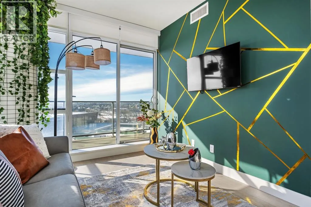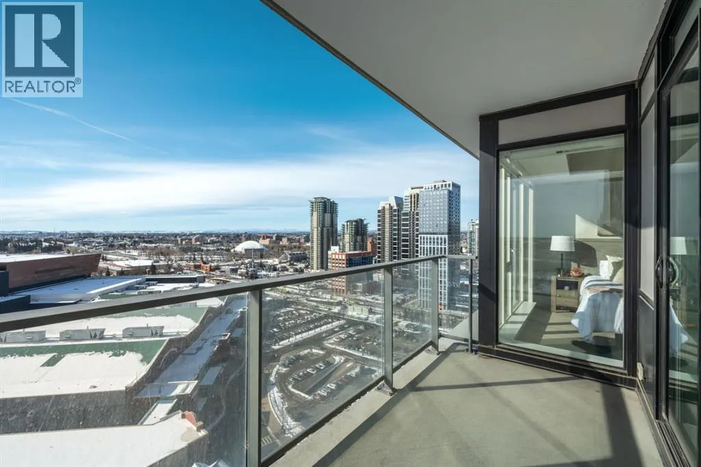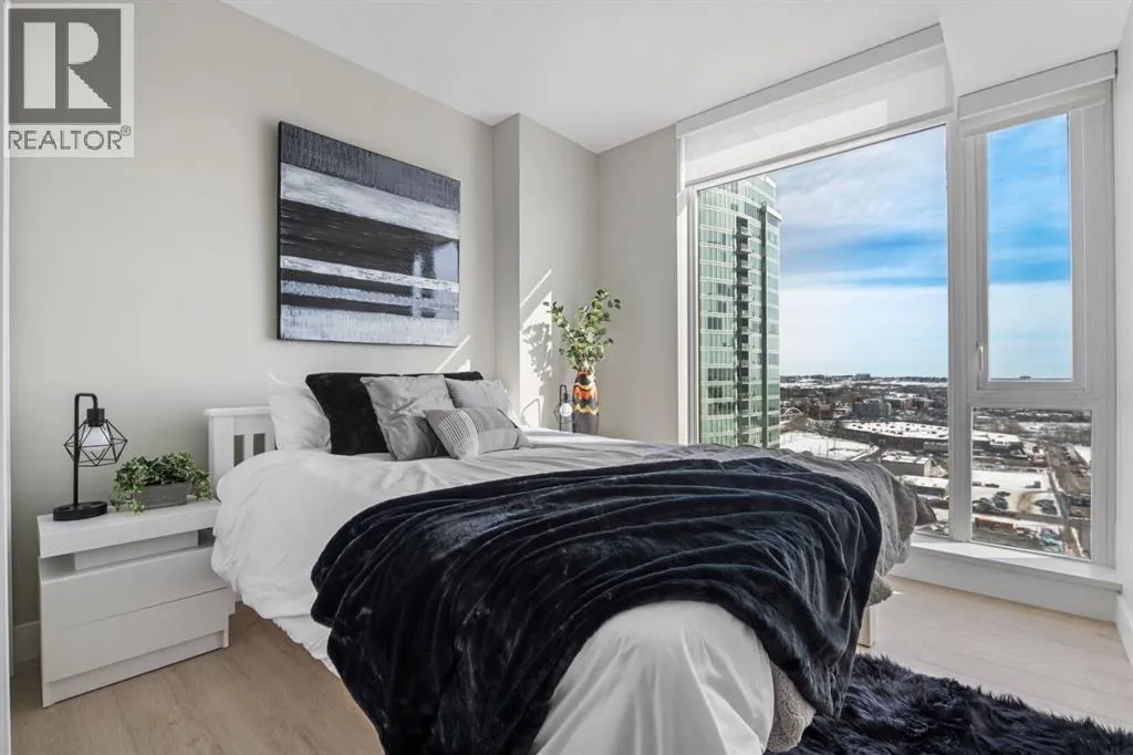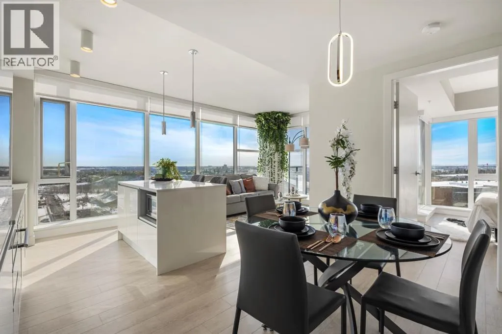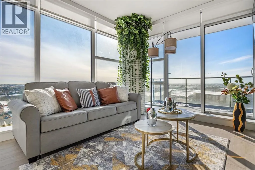 Premium Corner Unit with Unmatched Views in The Guardian South Tower.Step into elevated urban luxury with this exceptional, fully furnished corner residence on the 20th floor of The Guardian â Calgaryâs tallest residential tower. Perfectly positioned in the most desirable stack of the building, this rare opportunity offers unobstructed panoramic views of the mountains, Bow River, downtown skyline, and Calgaryâs emerging entertainment district, including the upcoming events centre and new stadium.From sunrise to sundown, the floor-to-ceiling glass walls flood the space with natural light and provide a cinematic backdrop to every room â a feature only available in premium-tier corner units.Inside, the home boasts:â¢Two well-separated bedrooms for privacy and functionalityâ¢A sleek, modern kitchen with high-gloss cabinetry, integrated appliances, and quartz countertopsâ¢An open-concept layout ideal for entertaining or executive livingâ¢A spacious primary suite with walk-in closet and spa-inspired ensuiteâ¢Airy ceilings and high-end finishes that reflect The Guardianâs signature contemporary designProfessionally staged, this suite shows like new â and includes the option to be sold fully furnished, offering an effortless move-in or turnkey investment for corporate stays or luxury short-term rentals.Located in East Village, steps from transit, cafes, the Saddledome, Stampede Park, and the future event hub, this is one of the best-positioned investments in Calgaryâs core.?? Includes titled parking and exclusive building amenities such as concierge, gym, social lounge, and workshop. (id:27476)