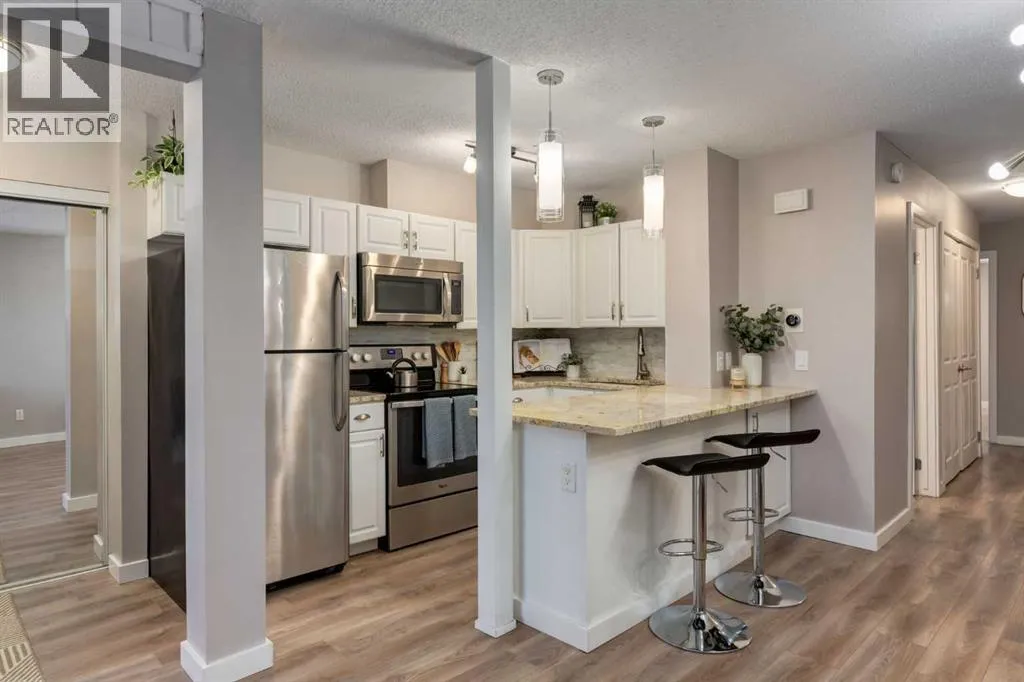 This bright and spacious main floor unit has been updated and features an open floor plan and laminate floors throughout. There is a well appointed kitchen with plenty of cabinets, stainless appliances, granite countertops and a breakfast bar, a dining area which flows into the living room with a wood burning fireplace and patio doors leading to your private enclosed courtyard with gate. There are 2 good sized bedrooms, the main bath with double sinks, and insuite laundry plus a storage room to complete this home. You also have an assigned parking stall. Canyon Creek Heights complex is a pet friendly complex with no size restrictions and up to 2 dogs allowed with board approval and has a great location, close to transit, shopping, schools and amenities. (id:27476)