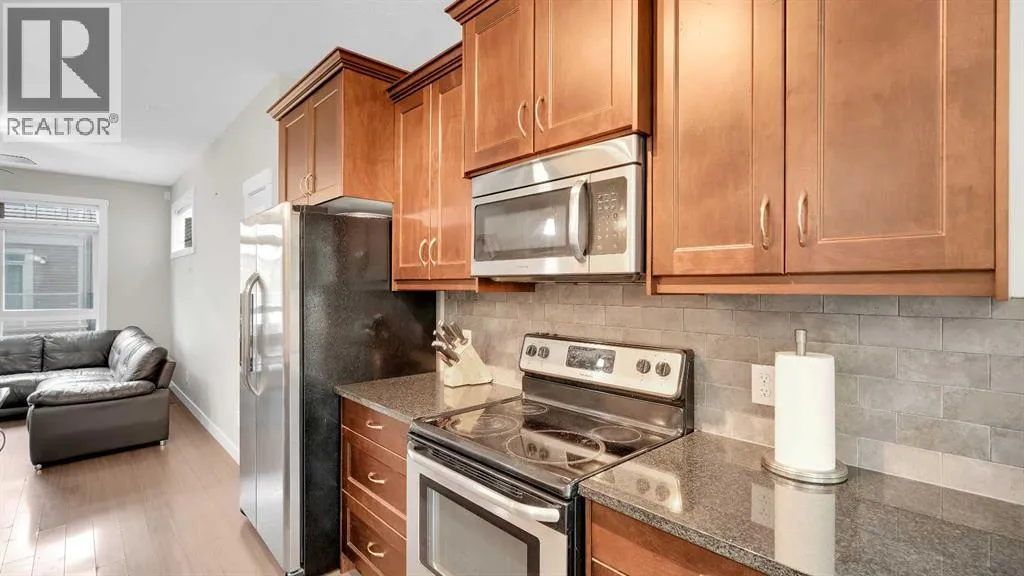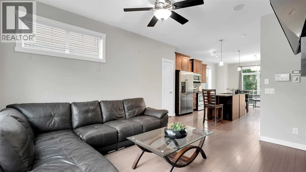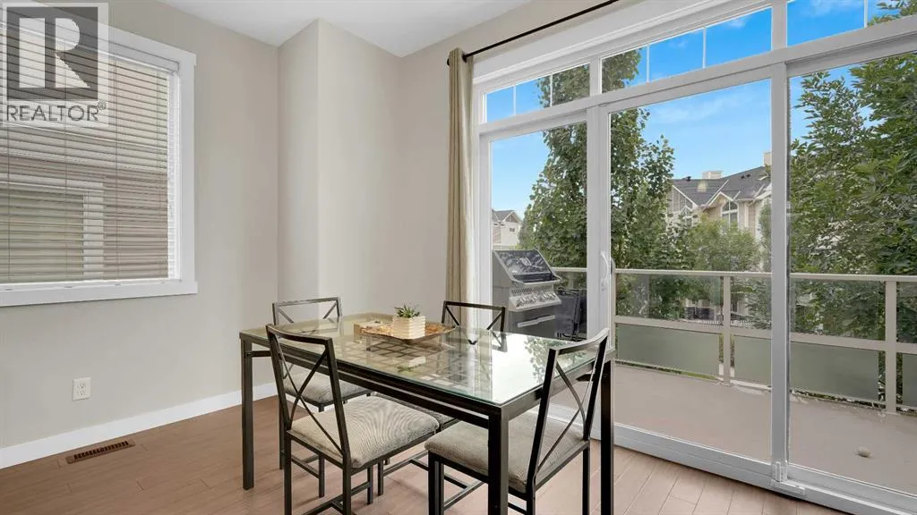 Welcome to Your New Home in Skyview Ranch â Where Comfort Meets Convenience. Nestled in the family-friendly community of Skyview Ranch, this upgraded corner unit isnât just a house; itâs a lifestyle choice! Think of it as the Swiss Army knife of living spacesâversatile, stylish, and sure to impress your in-laws. Step inside to a tastefully decorated open-concept layout on the second floor, filled with natural light and laminate flooring that keeps your family game nights from turning into slip-and-slide competitions. Cozy up to the natural gas fireplace, surrounded by built-in shelving for your collection of questionable figurines. The kitchen is a culinary dream! With stainless steel appliances, a microwave hood fan, and an oversized breakfast bar, youâll be whipping up gourmet meals that even Gordon Ramsay would admire. And for the grill masters, the large south-facing deck, overlooking the playground, is your new BBQ paradise with a natural gas hookup. On the third floor, the master bedroom is a serene sanctuary with a 5-piece ensuite and his and her closets (because sharing isnât always caring). Plus, thereâs a convenient laundry room to avoid those dreaded laundry-hauling trips. With a second bedroom, an office space, and a 2-piece bathroom, this unit truly has it all! Skyview Ranch Gardens is close to major highways and within walking distance to transit, cafes, restaurants, parks, schools, and shopping. Why wait? Embrace the chance to call this charming corner unit your home, where comfort meets convenience, and laughter is always welcome! (id:27476)