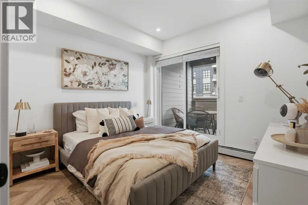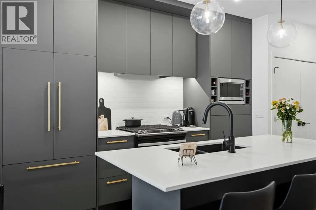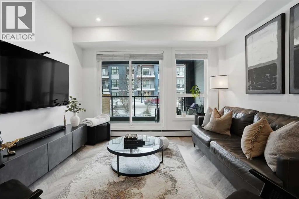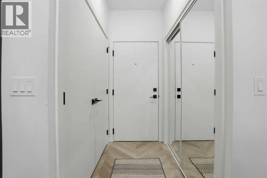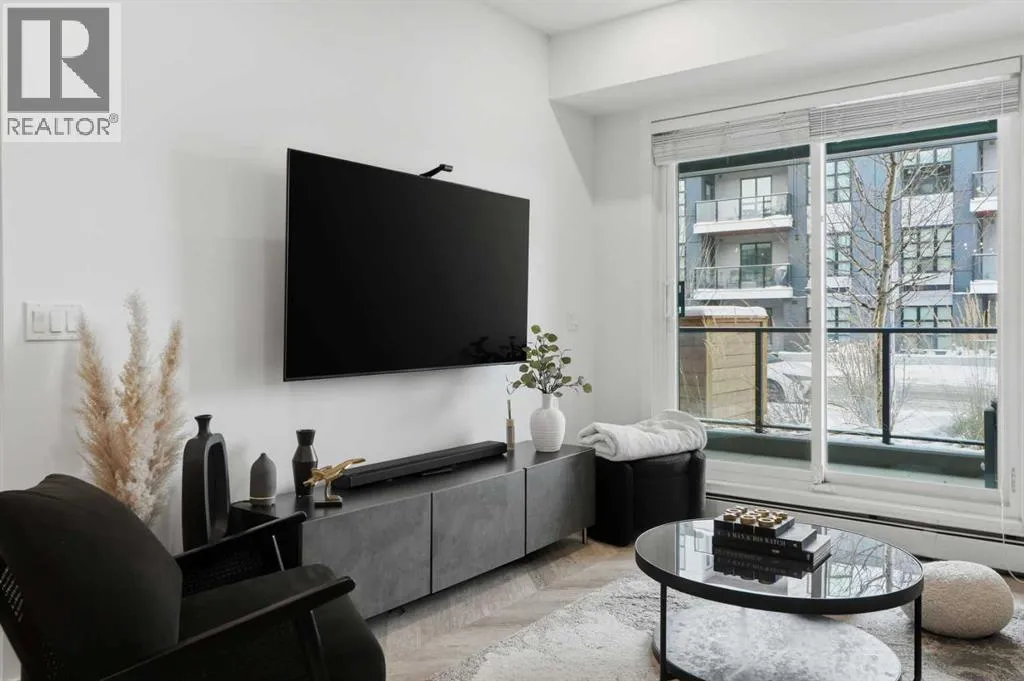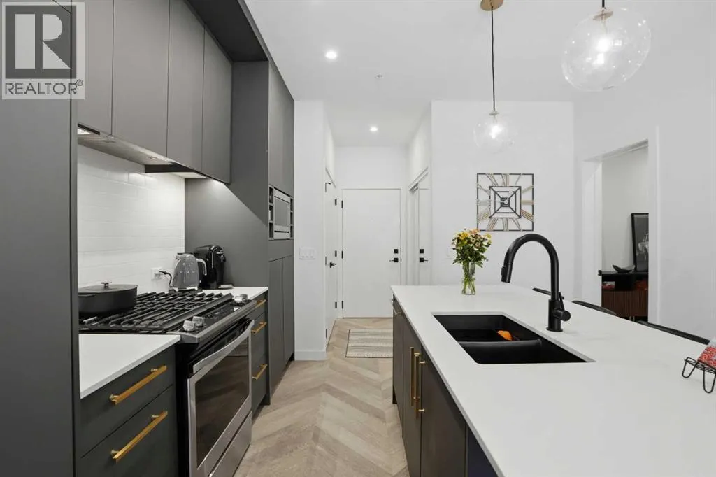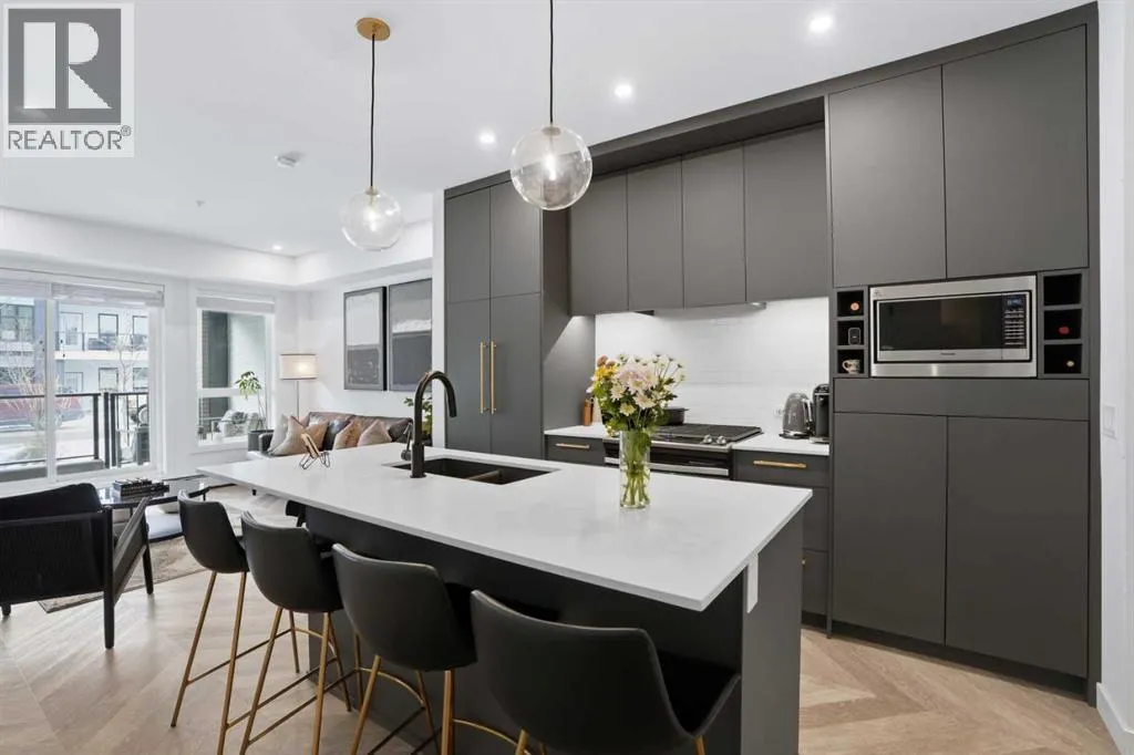 Step into contemporary living in one of Calgaryâs most sought after urban communities, the award-winning UNIVERSITY DISTRICT. This beautifully crafted TWO bedroom, one bathroom home offers stylish functionality and the rare benefit of a PRIVATE GROUND LEVEL ENTRANCE, creating the perfect blend of convenience and comfort.Inside, the thoughtfully designed layout welcomes you with soaring 9 foot ceilings, oversized windows with custom blinds, and a bright open-concept living area ideal for everyday living or hosting friends. The kitchen stands out with sleek quartz counters, full height soft close cabinetry, paneled appliances, a gas range, designer pendant lighting, and a large island that doubles as a casual dining space.Both bedrooms are spacious and versatile, whether used as sleeping quarters, a home office, or a guest room. The closets have been customized by CALIFORNIA CLOSETS, with full warranty remaining. The bathroom is elegantly finished with modern tilework and premium fixtures. Enjoy the everyday ease of in suite laundry with full sized washer and dryer. Luxury vinyl plank flooring throughout reinforces the homeâs modern aesthetic and durability.A highlight of this unit is the expansive covered patio with a gas hookup, perfect for outdoor dining, relaxing mornings, or entertaining year-round, all with effortless access thanks to the street-front walkout design.Esquire by Truman Homes offers exceptional resident amenities including a fully equipped fitness centre, bike storage and repair stations, and the building is professionally managed for peace of mind. A titled parking stall in the heated underground parkade, and an independent storage locker are also included.Live just steps to an incredible mix of shops, cafés, fitness studios, dining, and entertainment. Grab groceries at Save-On-Foods, sip at Monogram Coffee, enjoy brunch at OEB, or catch a movie at Cineplex VIP â all without getting in your car. Endless green spaces, dog parks, and the B ow River pathway network elevate your outdoor lifestyle. Plus, the University of Calgary, Alberta Childrenâs Hospital, Foothills Medical Centre, and Market Mall are moments away, with quick transit or driving access to downtown.Offering professional appeal, a walkable lifestyle, and refined finishes throughout, this home is the ultimate choice for first time buyers, downsizers, and savvy investors alike. Welcome to University District living at its finest. (id:27476)