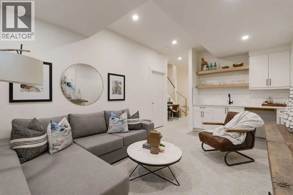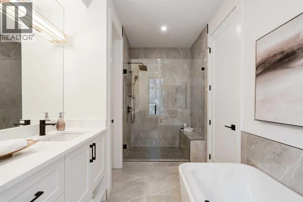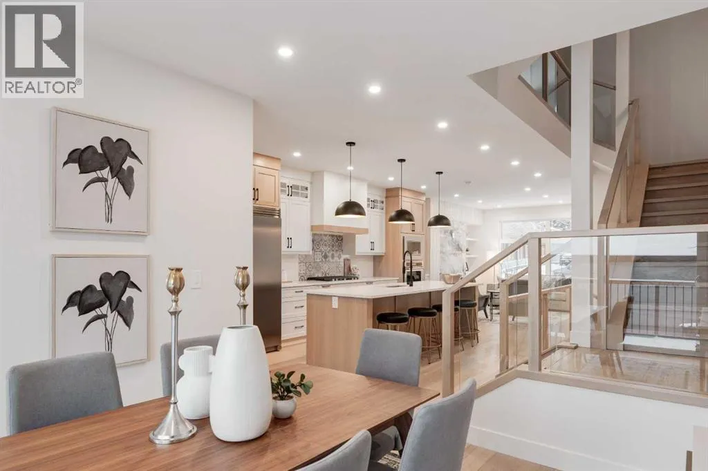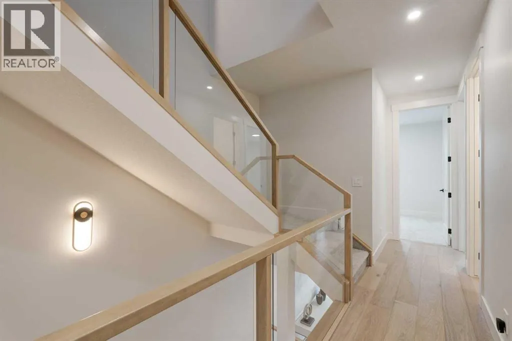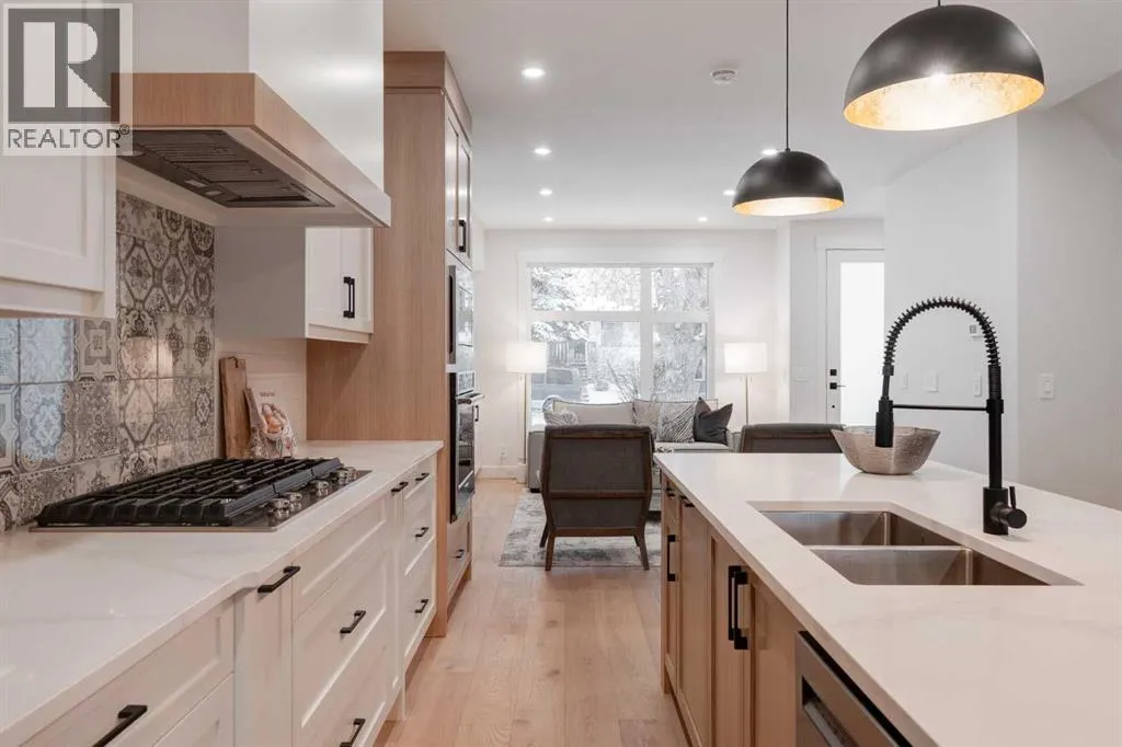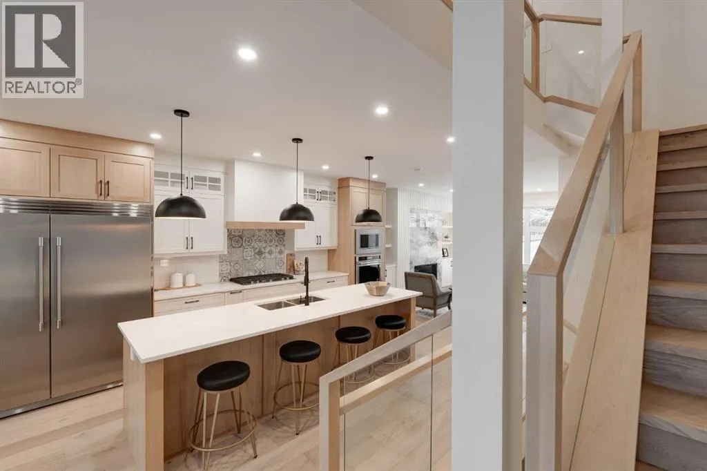 Priced to Sell! Discover modern luxury in this 5 bedroom + 4.5 baths, semi-detached home boasting 2,468 sq. ft. across three levels, plus a fully developed 868 sq. ft. lower level. The main floor features an elegant central Kitchen with long island, elegant two-tone cabinetry, gorgeous countertops, custom covered hoodfan, black accents, and upscale stainless steel appliances including a commercial grade fridge! This Kitchen layout is ideal for entertaining; complete with a convenient walk-in pantry with a countertop, shelves and drawers that makes organizing a breeze! White oak engineered hardwood flooring flows throughout, complementing high ceilings on the Main and Lower levels. The 2nd level features a spacious Primary bedroom with an impressive walk-in closet, luxurious 5 piece ensuite with deep pedestal soaker tub, over-sized shower, separate water closet and dual vanity with culture marble countertop. It also has its own private West-facing deck! There are also two more bedrooms, a 3-piece bathroom and an oversized laundry area with an impressive amount of countertop space, laundry sink and cabinetry. The 3rd floor bonus area has a very spacious living area, a large bedroom with an impressive walk-in closet, 3-piece bathroom and an additional walk-in closet. This floor also has an AMAZING outdoor living space that could easily fit a sectional, fire-table and dining set to enjoy those warm starry Calgary evenings! The lower let has another bedroom, a den, study nook, 3-piece bathroom, and a games/recreation/media area with a wet bar. Outdoor living with three decks adds so many living options. The property also has a private backyard with double detached garage and new fencing on both sides of the property. With impeccable design, ample space, and a prime, tree-lined, inner city southwest location in Killarney - just steps away from schools, parks, pathways and other conveniences, this home and location is a true gem! (id:27476)