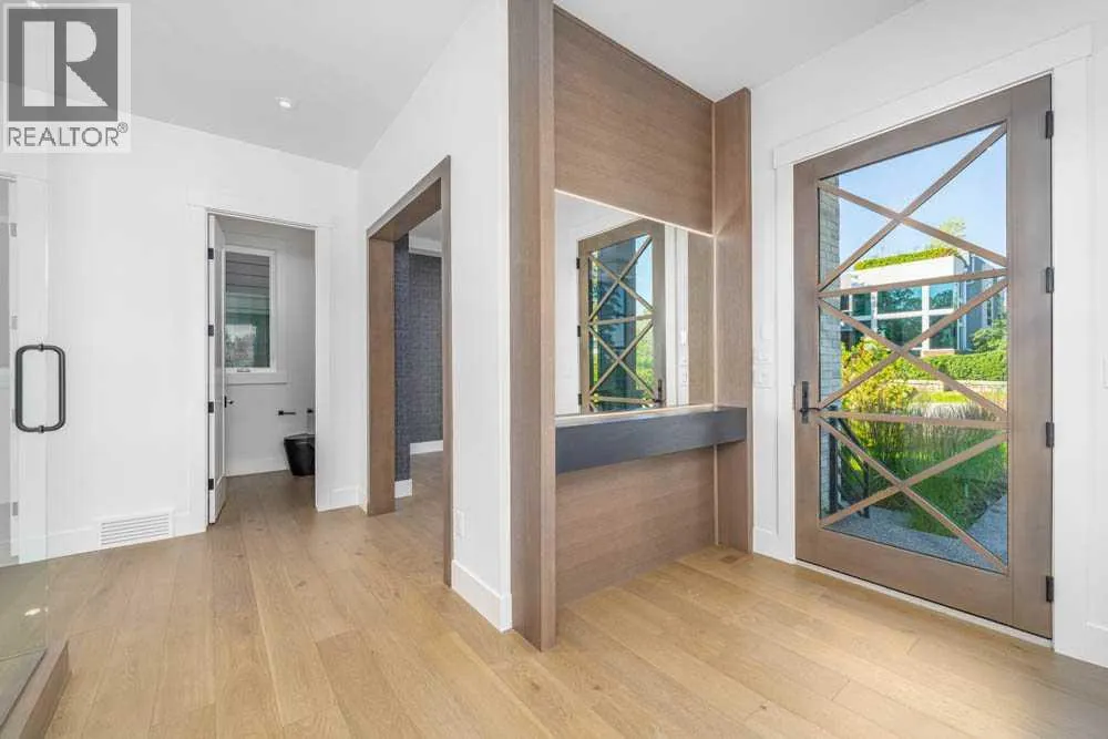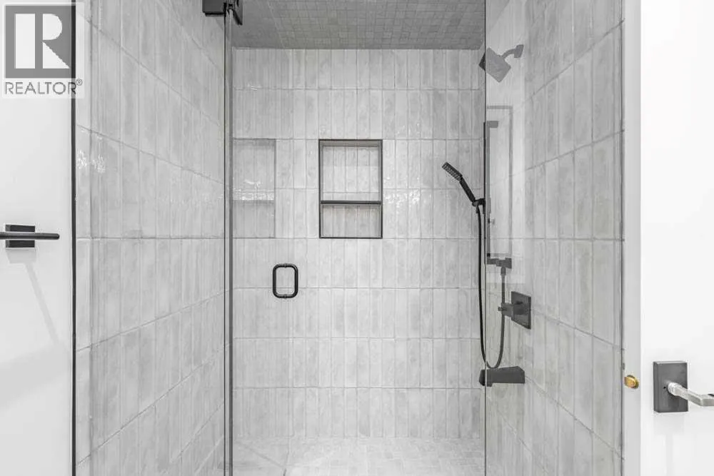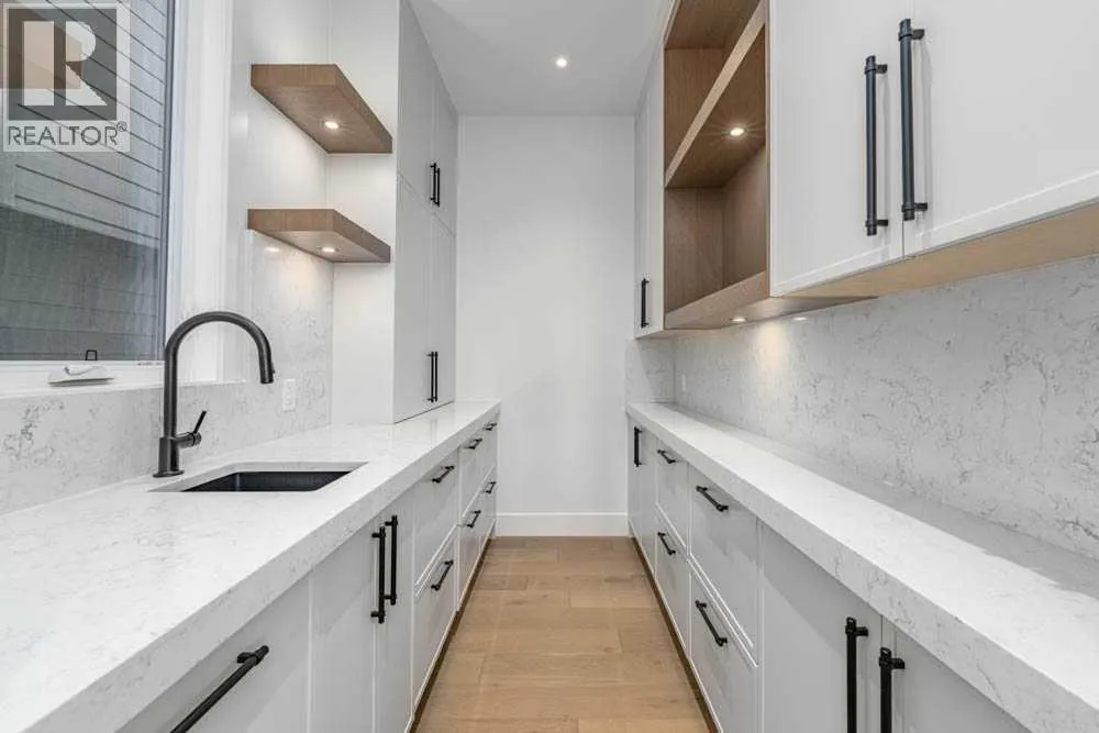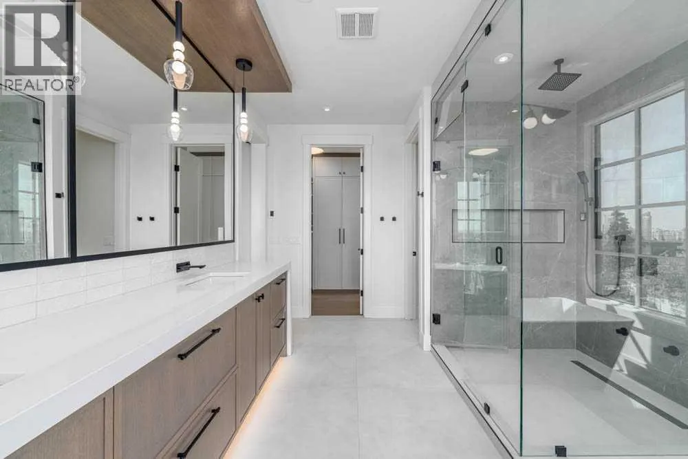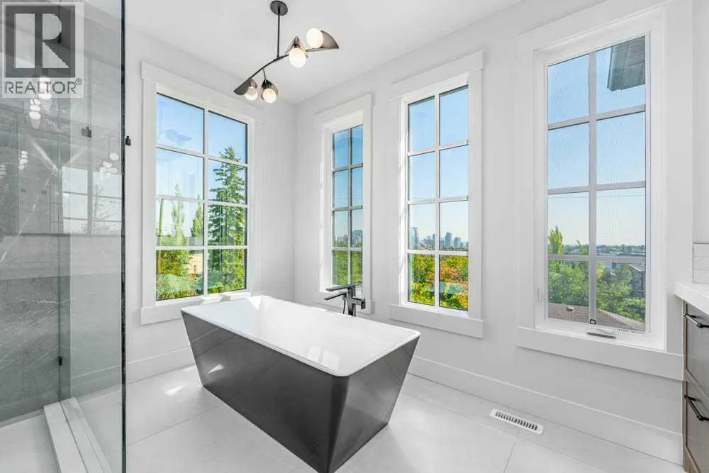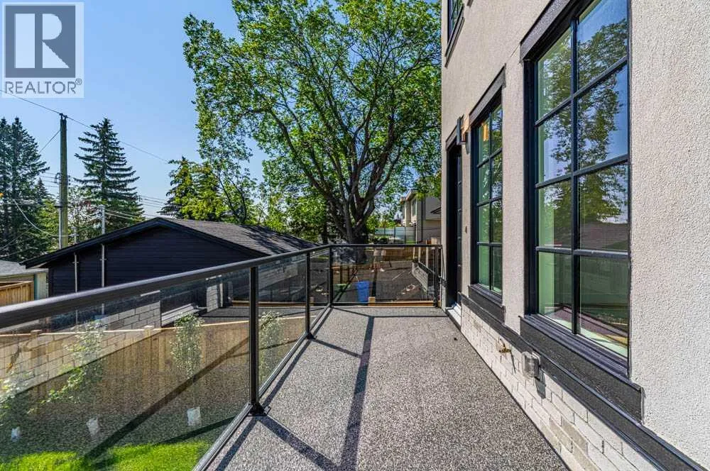 Exquisite Modern Corner Home with Panoramic Downtown Views. This striking luxury contemporary corner home, is perfectly positioned in one of Calgaryâs most sought after inner city neighbourhoods. From the moment you arrive, the homeâs bold architecture, oversized windows, and meticulously landscaped, low maintenance yard with automatic irrigation, make a lasting impression. Step inside to soaring ceilings and sun drenched spaces that immediately evoke a sense of openness. The formal dining area, surrounded by windows, is ideal for entertaining, while a discreet powder room and custom wine storage add subtle touches of luxury. At the heart of the home, the chefâs kitchen impresses with premium Fisher & Paykel appliances, elegant quartz countertops, statement tile, and a butlerâs pantry to keep everything organized. The oversized island is perfect for cooking, gathering, or casual dining, and the cozy breakfast nook opens onto a private terrace, seamlessly connecting indoor and outdoor living. The family room is anchored by a dramatic floor to ceiling stone fireplace and provides direct access to the terrace with sweeping downtown views, perfect for relaxing evenings or weekend entertaining. A striking glass enclosed staircase adds architectural drama while allowing natural light to flow throughout the home. Upstairs, the luxurious primary suite serves as a private retreat. It features dual custom closets, a built-in vanity, and a spa inspired ensuite with heated floors, a deep soaker tub with downtown views, double sinks, a rainfall steam shower, and high-end finishes. Two additional bedrooms offer flexible space for children, guests, or home offices, with a full bathroom that also includes in-floor heating and ample storage. The upstairs laundry room, equipped with high-end washer and dryer and abundant cabinetry, makes daily tasks effortless. The fully developed lower level expands your living space with a spacious recreation room, custom wet bar with wine fridge and integrated dishwasher, perfect for entertaining. Radiant in-floor heat ensures comfort year round. A fourth bedroom and full bathroom provide additional space for guests or teens, while an oversized mudroom with smart storage connects directly to the heated double garage. Additional features include central AC, integrated lighting, and high-end Hunter Douglas remote operated blinds throughout, fully programmable via app for complete convenience and privacy control. This home blends luxury, style, and practical functionality, with a location that puts the best of Calgaryâs inner city right at your doorstep. Donât miss this rare opportunity to own a home that elevates both everyday living and entertaining. Please see 3D tour and video. (id:27476)