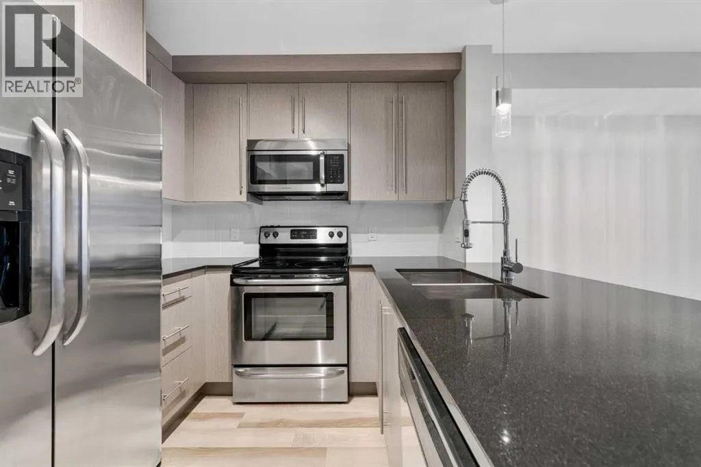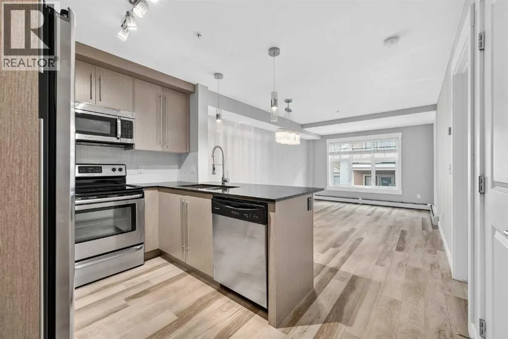 Welcome to this immaculate one-bedroom-plus-den condo in the highly sought-after community of Mahogany, celebrated for its vibrant outdoor lifestyle. Perfectly positioned with full lake access, this professionally renovated unit offers an ideal blend of comfort, style, and convenience. Upon entering, youâre greeted by contemporary finishes, including brand-new waterproof laminate flooring throughout and tile in the bathroom. The kitchen is equipped with all the essentials, featuring a breakfast bar, upgraded modern cabinetry, quartz countertops, and stainless steel appliances.Freshly painted from top to bottom, the entire space feels bright, clean, and inviting. The primary bedroom is spacious and can comfortably accommodates a king-sized bed. The generous den serves as a versatile multi-purpose roomâideal as an additional bedroom, office, workout area, or extra entertaining space. The unit also includes in-suite laundry and underground TITLED parking with a storage locker. Ideally located just steps from Mahogany West Beach, Mahogany Plaza, and the dining and entertainment at Westman Village, including Alvinâs Jazz Club and Chairmanâs Steakhouse. The lake offers many year-round amenities such as swimming, skating, tennis courts, splash park, fishing, fitness areas, and more. With quick access to 52nd Street, Stoney Trail, Deerfoot Trail, and close proximity to schools, shopping, and the South Health Campus, this is an exceptional opportunity for first-time buyers, downsizers, or investors alike. (id:27476)