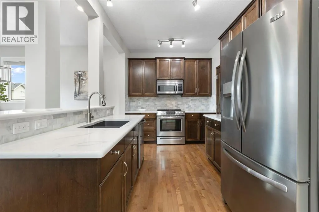 OPEN HOUSE Sunday December 14th from 1-3 pm! Welcome to 99 Sage Valley Park NW - a beautifully appointed residence where comfort, style, and community come together in one of Calgaryâs most desirable neighbourhoods. With over 2,250 sq. ft. of thoughtfully developed living space, this family home offers an inviting first impression. Gleaming hardwood floors lead you through the open-concept main level, seamlessly connecting the living, dining, and kitchen areas. The bright kitchen features a spacious pantry, a breakfast bar accented with custom wainscotting, and an expansive dining space perfect for gathering with family and friends. The living room is warm and welcoming, centred around a cozy gas fireplace. A convenient powder room and main-floor laundry complete this level. Step outside and experience one of the homeâs standout features: a generous 4,477 sq. ft. landscaped backyard. Enjoy summer evenings on the two-tiered deck complete with a BBQ gas line, relax under the pergola, and admire the established perennials, beautiful all season long with no annual planting required. Added trees provide both charm and privacy. Back inside, ascend the elegant staircase to your serene primary retreat, showcasing vaulted ceilings, large windows, a walk-in closet, and a luxurious 5-piece ensuite. Down the hall are two well-sized bedrooms and a 4-piece bathroom. A bright, open flex space at the top of the landing offers the perfect setting for a home office, craft area, or reading nook. The fully developed lower level features a fourth bedroom and an inviting entertainment space complete with a 65â TV and Bose sound system, also wired to the garage, ideal for movie nights or hosting guests at the built-in bar. A dedicated storage room and a rough-in for a future bathroom offer added convenience and value. Sage Valley is a community celebrated for its picturesque pathways, abundant green spaces, and family-friendly parks, perfect for evening walks, morning runs, or weekend ad ventures. Youâll appreciate being just minutes from Sage Hill Crossing and Creekside Shopping Centre, where cafés, restaurants, groceries, and everyday amenities are all within easy reach. Top-rated schools, nearby fitness facilities, and quick access to major routes ensure a lifestyle of ease and convenience. At 99 Sage Valley Park NW, youâre not just purchasing a home, youâre embracing a vibrant community youâll be proud to be part of for years to come. (id:27476)