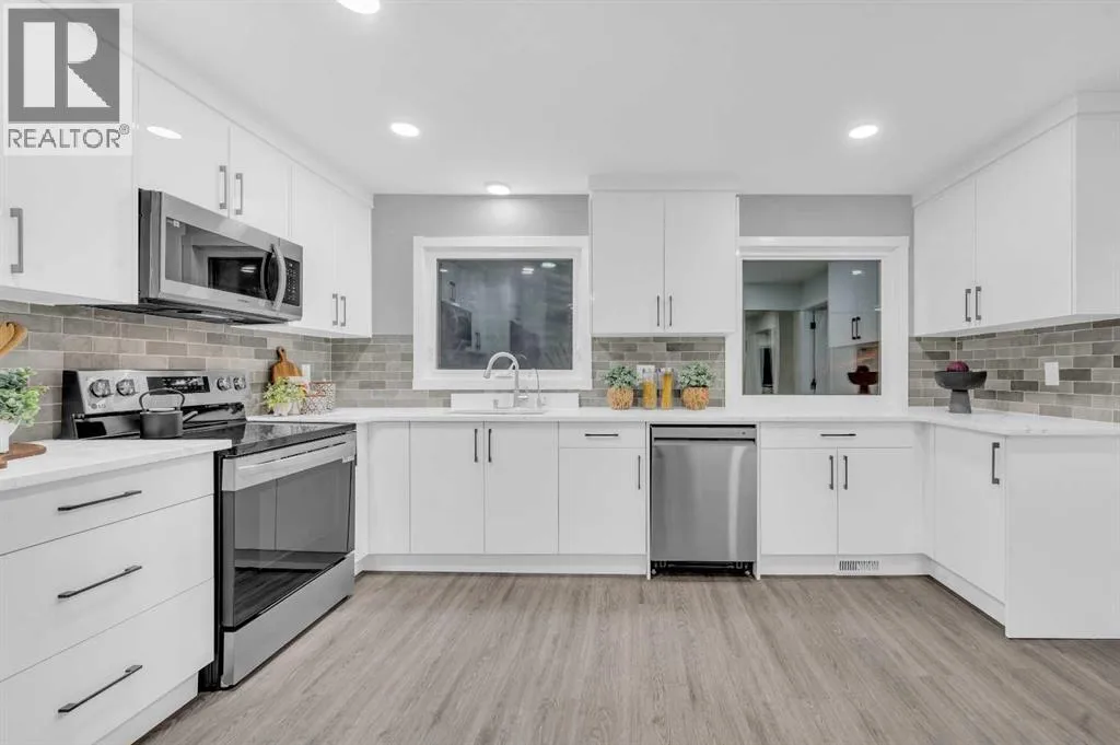 Fully Renovated 6-Bed, 4-Bath Single family home on an Over-Sized lot perfectly nestled in the highly sought-after community of Dalhousie NW. This inviting residence offers over 2,200 sq. ft. of thoughtfully designed living space, ideal for families looking for comfort, space, and style. Step inside to a generous front foyer that leads to a bright living room with brand-new full-size window filling the living room with ample sunlight. This fully developed bungalow has been beautifully renovated, showcasing stylish vinyl plank flooring throughout the house. The spacious kitchen features quartz countertops, white color cabinet, a striking backsplash, high-end stainless-steel appliances and seamless connection to the dining area. The main floor offers 3 bedrooms, 2 full bathrooms including a generous primary bedroom with a 4-piece ensuite. Convenient laundry area is also located on the main floor. Downstairs, the fully finished Illegal Basement Suite boasts a large living room, spacious 3 bedrooms, 2 bathrooms, full kitchen with brand-new stainless-steel appliances, cabinets and quartz countertops. It also includes a laundry along with a separate entrance which is great for potential rental income. Recent upgrades include brand new triple pane full size windows, vinyl plank flooring, new doors, new stainless-steel appliances, quartz counter tops, kitchen cabinets, lighting fixtures, washroom vanities and freshly painted. The oversized backyard is fully fenced features mature trees, sun exposure, and fire pit. This home truly has it all â location, style, and functionality. Enjoy proximity to top-rated schools, parks, shopping, and quick access to major routes, including Sarcee Trail, Crowchild Trail, and John Laurie Boulevard. Nearest elementary school - Dalhousie School, Nearest Junior high school - H.D. Cartwright School, Nearest high school - Sir Winston Churchill High School. Donât miss your chance to see it today! Call your favorite realtor to book the viewing. (id:27476)
