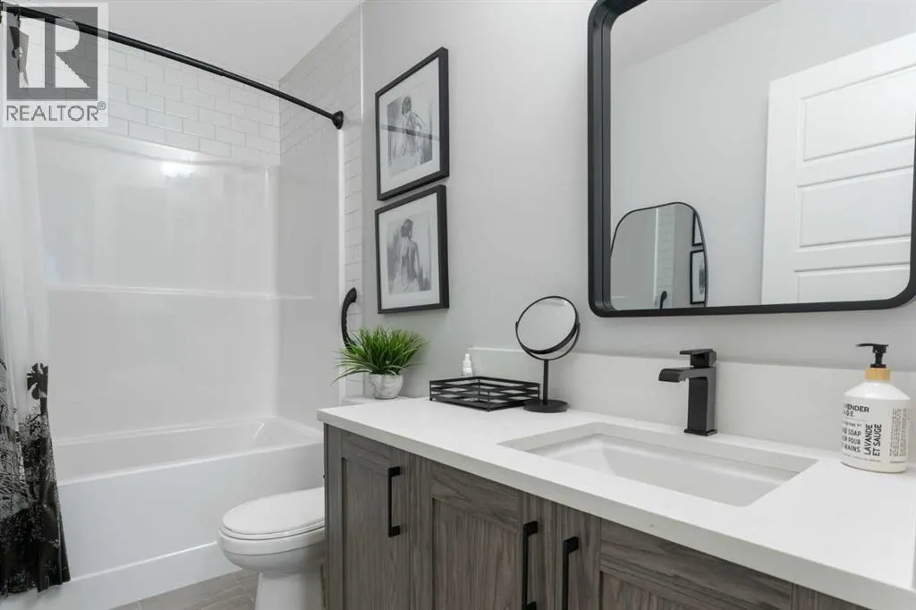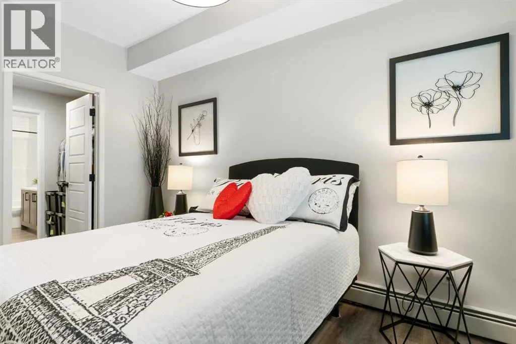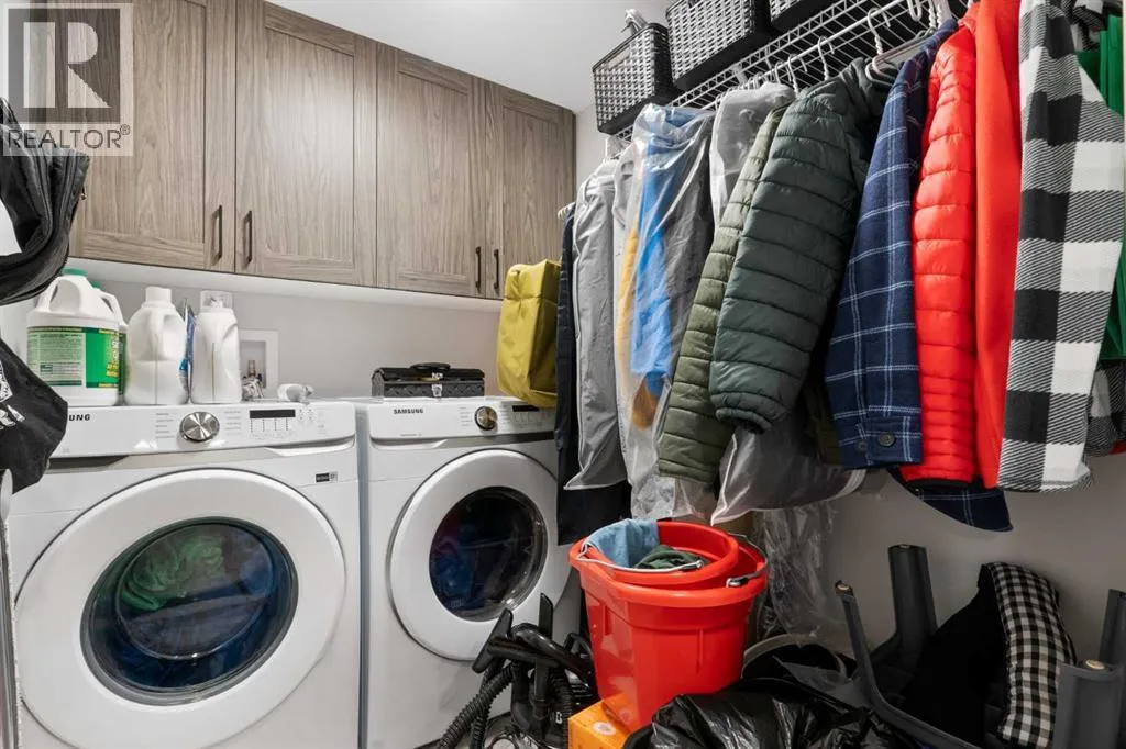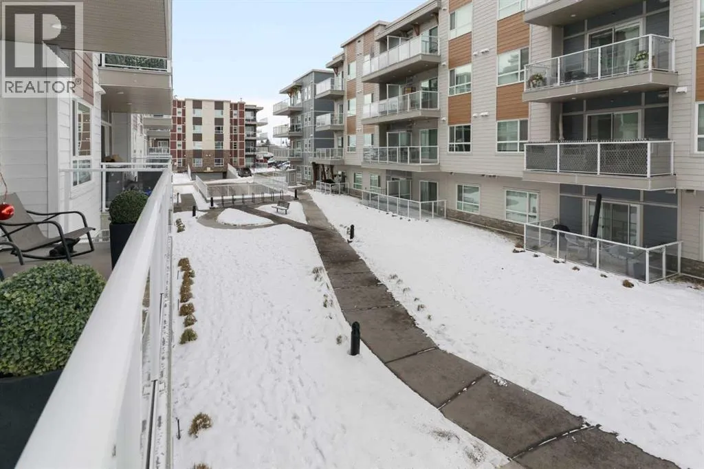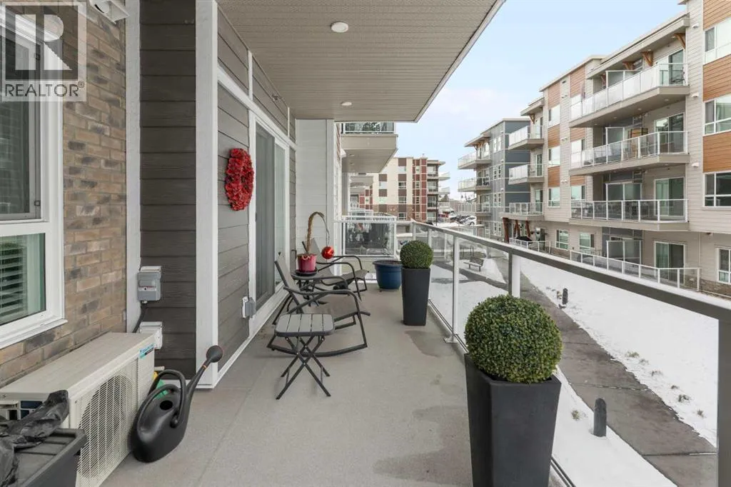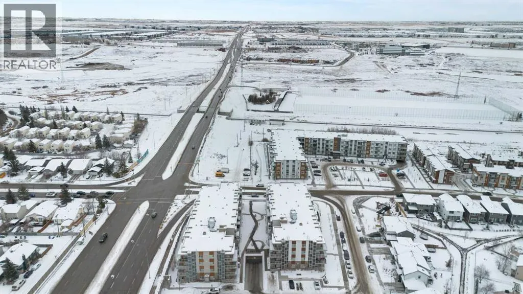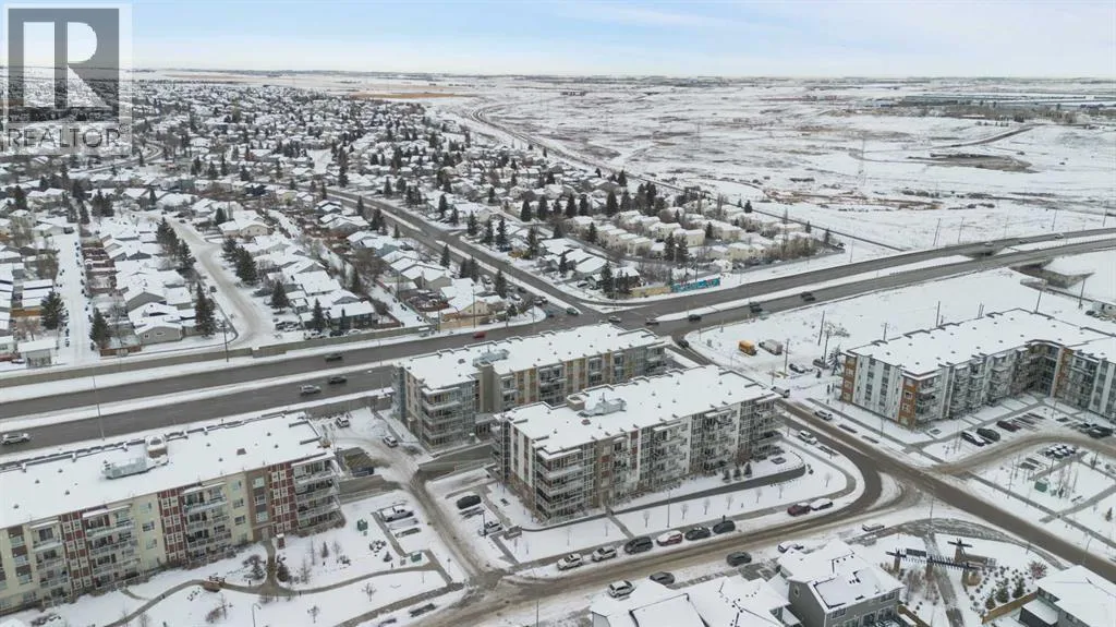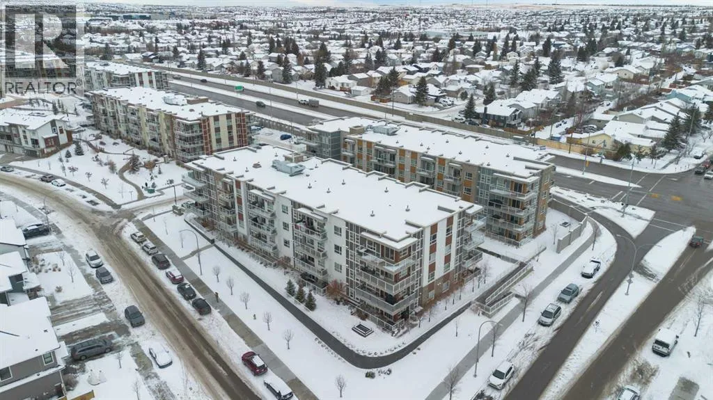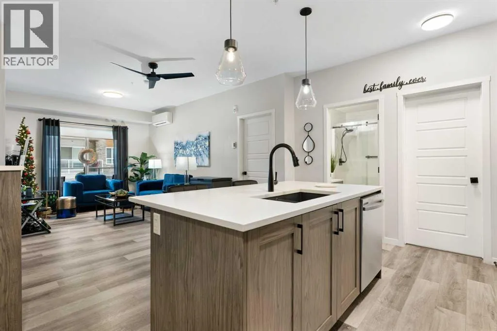 Step into comfort, style, and elevated living in this beautiful 2-bed, 2-bath condo in The Rise at The Parks of Harvest Hills. Built by Cedarglen Homes, and lovingly maintained by its original owners, this home stands out with premium upgrades and central AC for year-round comfort. From the moment you arrive, pride of ownership is evident. The welcoming entry leads into a bright, modern kitchen that makes both everyday cooking and hosting feel special. Featuring a large island with seating, quartz countertops, stainless steel appliances, and a stylish chevron tile backsplash that create a high-end look and feel. Plenty of cabinetry and a pantry give you the storage every homeowner wants without sacrificing clean, contemporary design. Luxury vinyl plank flooring runs throughout the main living spaces for durability and a modern finish. In the dining area, the builder-upgraded built-in adds character and practical storage, making entertaining effortless. The spacious living room has the perfect layout for relaxing, movie nights, or hosting game night with friends. Slide open the patio doors to your oversized private balcony. With room to lounge or dine, built-in exterior lighting, and a BBQ gas line ready to go, this becomes an outdoor extension of your home that you will love from morning coffee to summer evenings. The primary bedroom is tucked away on its own side of the home for privacy and peace. There is plenty of space for a king-sized bed and additional furniture, while the walk-in closet features custom built-ins designed to keep life organized. The 4-piece ensuite is bright, fresh, and calming. It feels like your own personal retreat at the end of a long day. Across the unit, the second bedroom offers flexibility for guests, a roommate, a nursery, or the perfect work-from-home office. The adjacent 3-piece bathroom includes a full-size walk-in shower with upgraded fixtures for a sleek and modern finish. Back near the entry, the laundry room truly sets this hom e apart. Builder-installed upper cabinets and extra shelving ensure everything has a place and stays clutter-free. A luxury rarely found in condo living. This space also doubles as your front closet with plenty of room for shoes and jackets. Your titled underground parking stall is conveniently just steps from the elevator, making grocery runs effortless. An assigned storage locker and secure bike storage are also included on the same lower level, giving you even more room for the things you love. You are perfectly positioned here. Minutes from the airport, close to Deerfoot and Stoney Trail, and a short stroll to restaurants, local shops, Landmark Cinemas, parks, tennis courts, and schools. Convenience and comfort come together seamlessly. Whether you are downsizing, investing, or purchasing your first home, this upgraded condo offers a level of quality and lifestyle that truly stands out.Welcome home to The Rise at The Parks of Harvest Hills. (id:27476)
