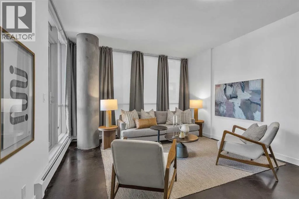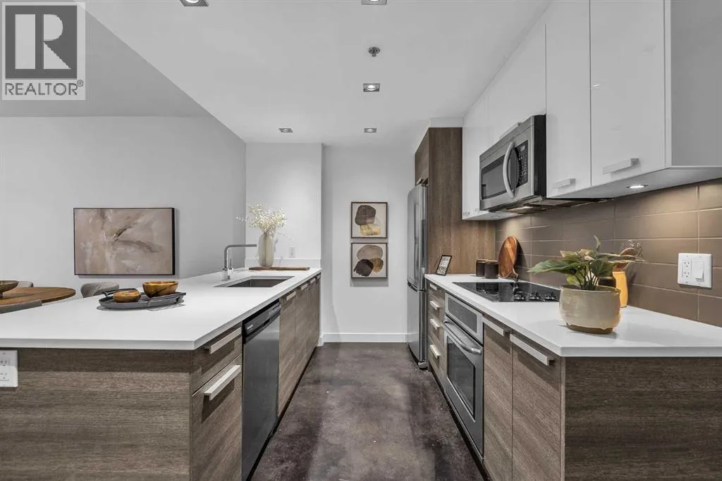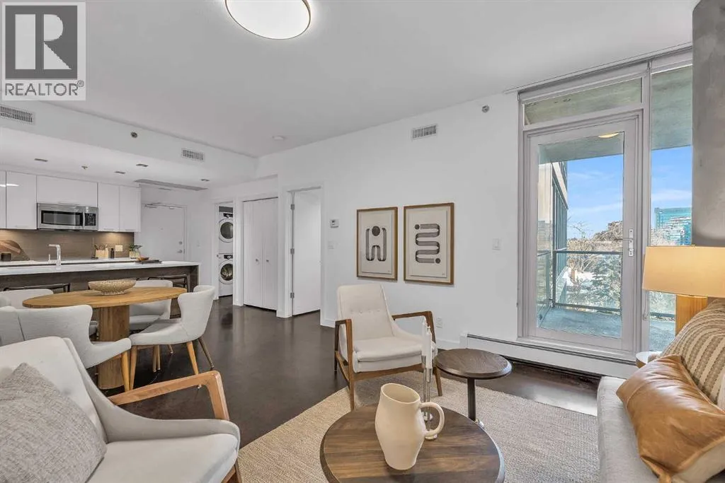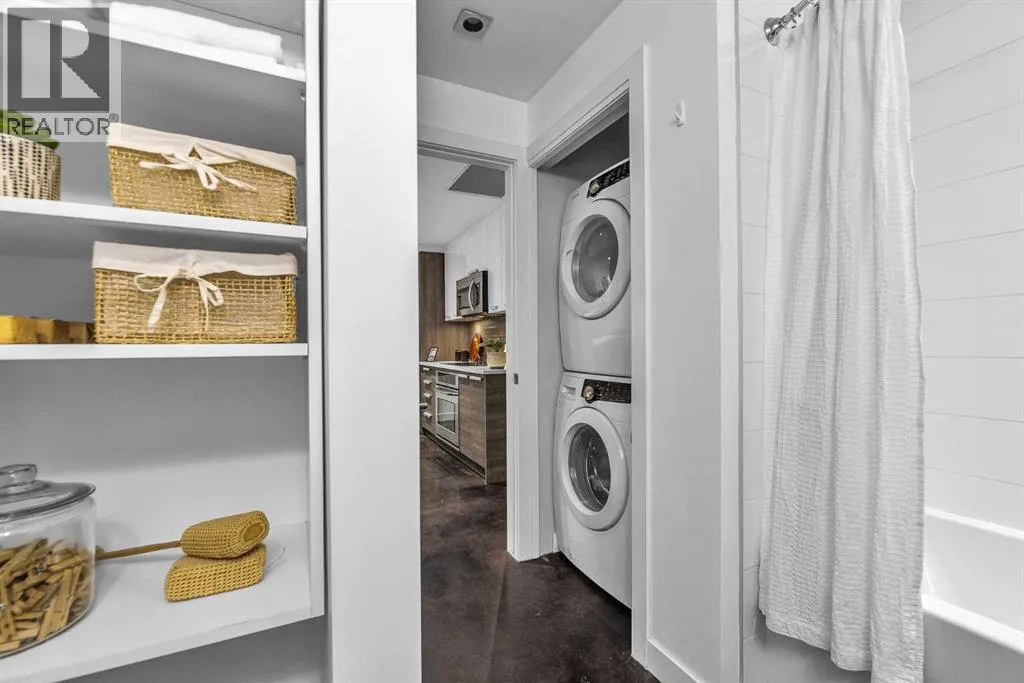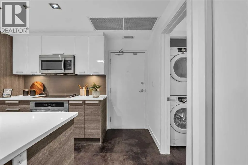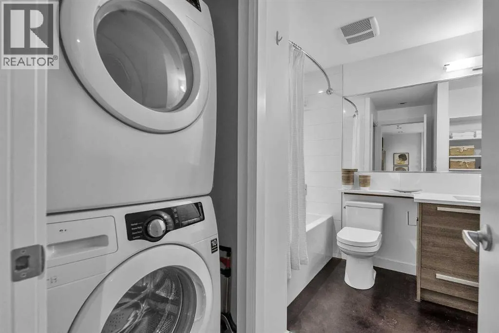 MODERN 1 BEDROOM CONDO IN THE HEART OF KENSINGTON | AIR CONDITIONING | TITLED PARKING + STORAGE | ROOFTOP PATIO WITH EPIC DOWNTOWN VIEWS****Welcome to PIXEL by Battistella, a exceptionally well-maintained concrete building. Perfectly positioned in the vibrant community of Kensingtonâjust steps to the Bow River pathway, Sunnyside C-Train Station, grocery stores, cafés, restaurants, boutiques, and the Plaza movie theatre. Walk or bike to downtown with ease or hop on the train and youâre at SAIT in just one stop.****This smartly designed 621 sq ft, 1 bedroom home offers a bright, contemporary layout with 9 ft ceilings, polished concrete floors, and a stylish open-concept living space. The modern kitchen features quartz countertops, stainless steel appliances, undercabinet lighting, pull-out garbage bins, and plenty of prep and storage space. Thereâs a dedicated area for dining, a spacious living room with custom blinds and curtains and a view of downtown.The bedroom includes built-in closet organizers, and the well-appointed bathroom offers a quartz vanity with drawers, built-in linen shelving, and a relaxing soaker tub. The full-size stacked washer & dryer is neatly tucked away, and an entry closet completes the space. Plus a covered balcony with gas line is perfect for BBQing and provides views of downtown and Kensington.*****The unit includes a titled underground parking stall and titled storage unit great for sports equipment and winter tires. The PIXEL building provides underground visitor parking, bike rooms, and a truly spectacular rooftop patio with a fireplace, seating areas, and a jaw-dropping panorama of the city â a perfect spot to unwind on a summer evening or to watch the Stampede fireworks. And yes PIXEL is pet friendly with no size restrictions.Urban convenience, modern design, and one of Calgaryâs most walkable locations â this is the lifestyle youâve been waiting for. Contact me to today to schedule a viewing and find out why this could be a s mart move for you! (id:27476)