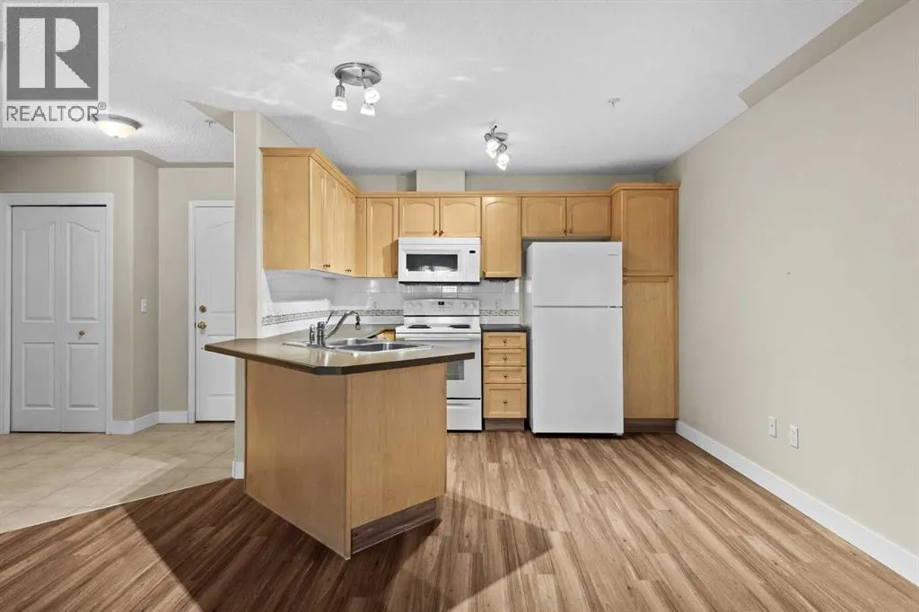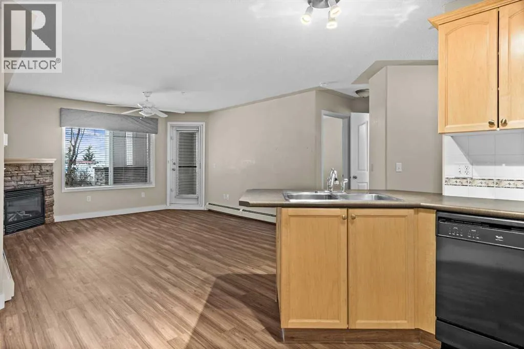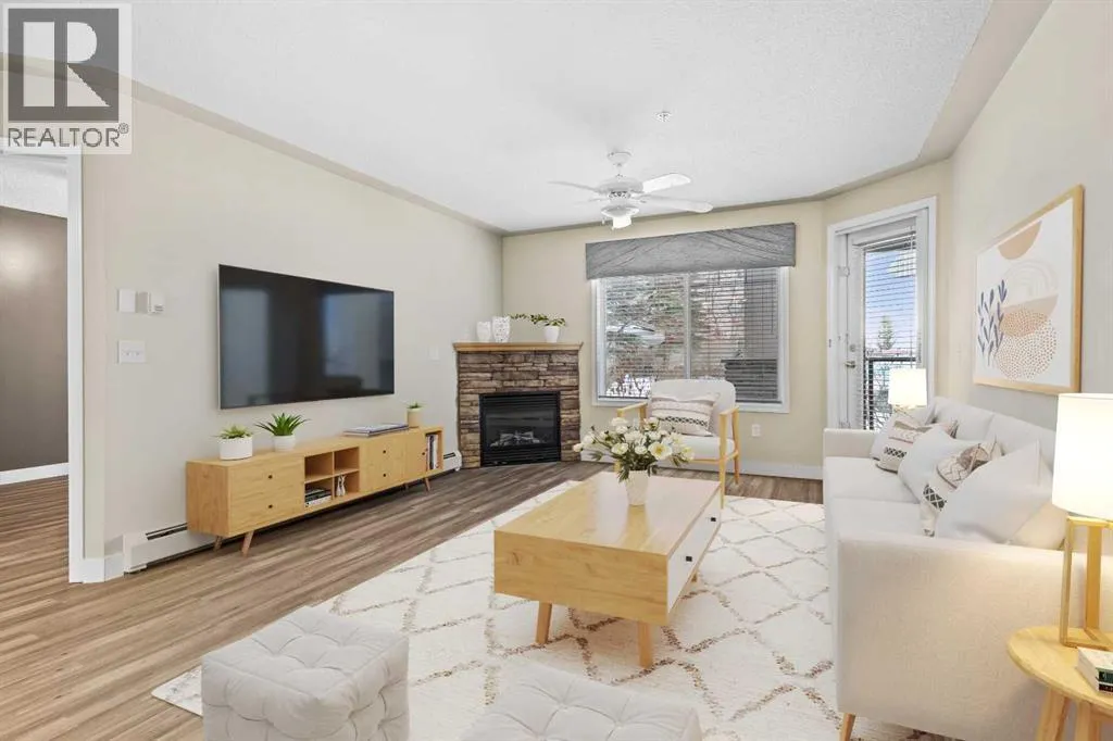 Step into this bright and inviting main floor 2-bedroom, 2-bathroom condo in the highly sought-after Pavilions at Rocky Ridge. Thoughtfully designed with a split-bedroom layout for privacy, this property features an open concept kitchen and living area with a cozy gas fireplace, LVP flooring, large windows, and direct access to your private balcony - perfect for morning coffee or evening relaxation. Main floor living means no elevator waits and easy outdoor access â ideal for quick walks with Fido (just don't forget to get board approval!).The spacious primary bedroom includes a walk-in closet and full ensuite, while the second bedroom is adjacent to a full four piece bath. Enjoy the ease of in-suite laundry with additional storage, the patio with BBQ gas line and secured storage shed, and titled underground parking.Residents enjoy outstanding onsite amenities, including a fitness center, theatre room, games room, meeting space, library, and even an onsite hair salonâan appealing convenience for seniors and busy professionals alike. Surrounded by walking paths, greenspace, and mountain views, the setting is as peaceful as it is practical.With unbeatable access to shopping, transit, and major roadways, this condo is an excellent choice for investors, downsizers, seniors, first-time buyers, and young professionals seeking comfort, convenience, and a vibrant community. (id:27476)