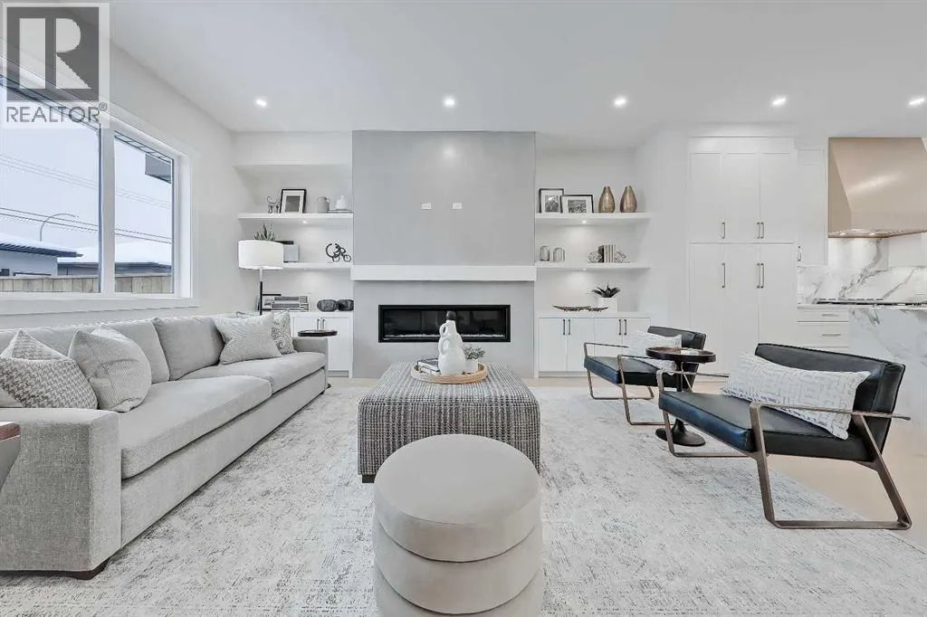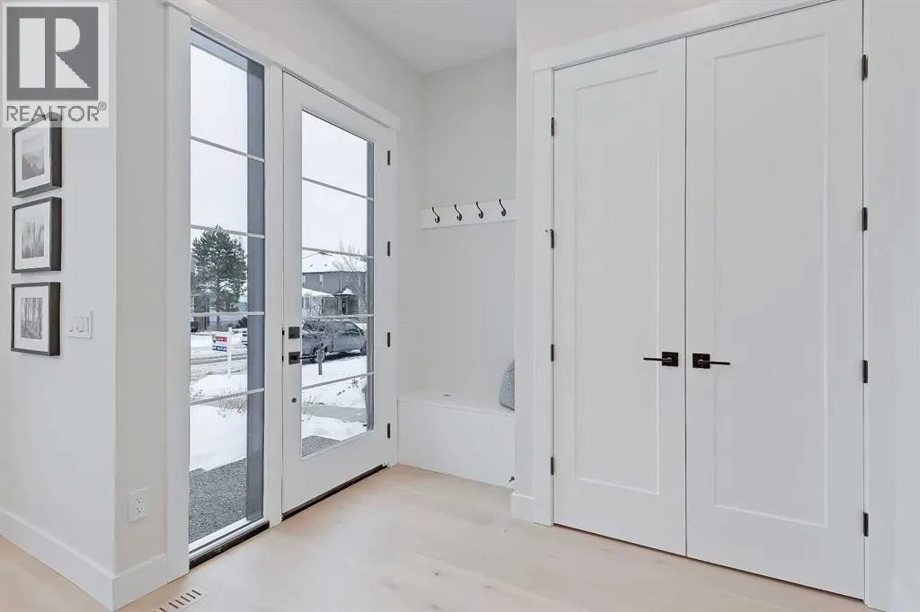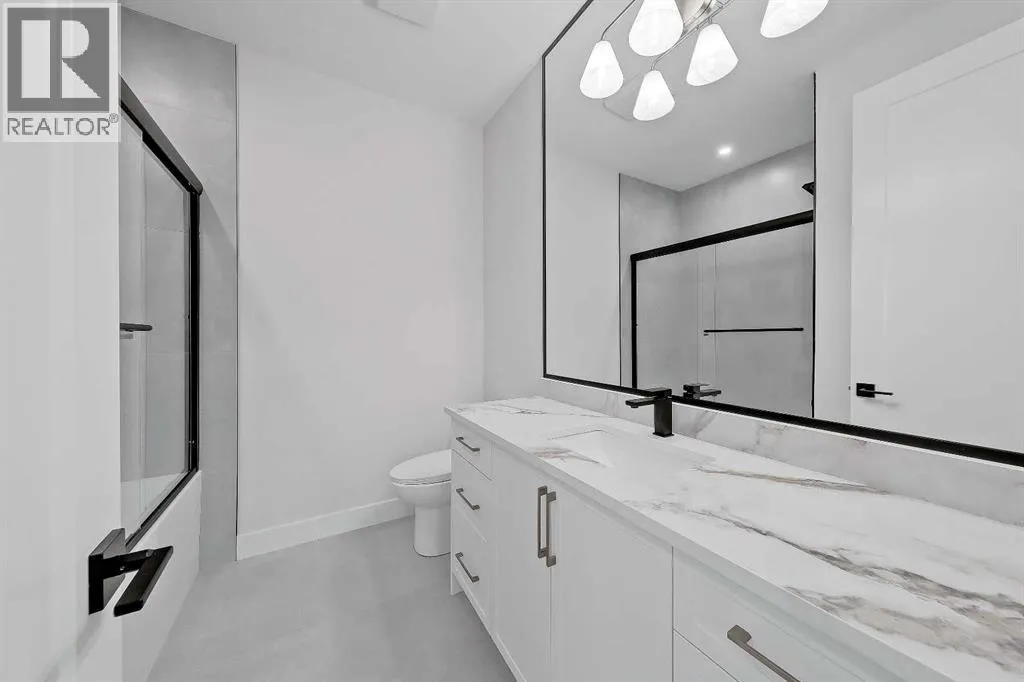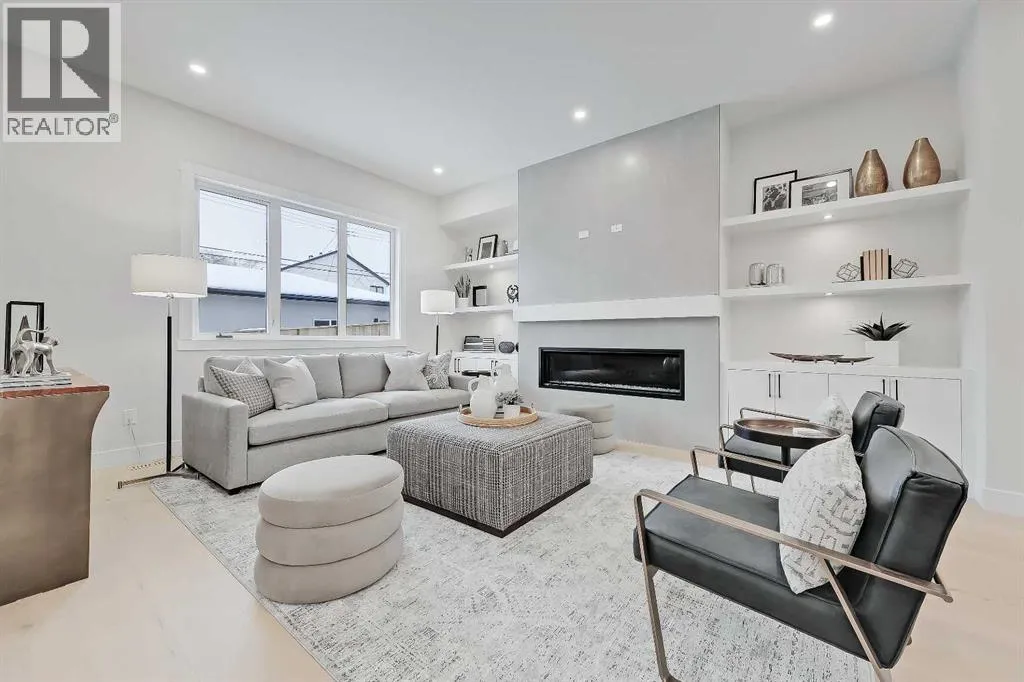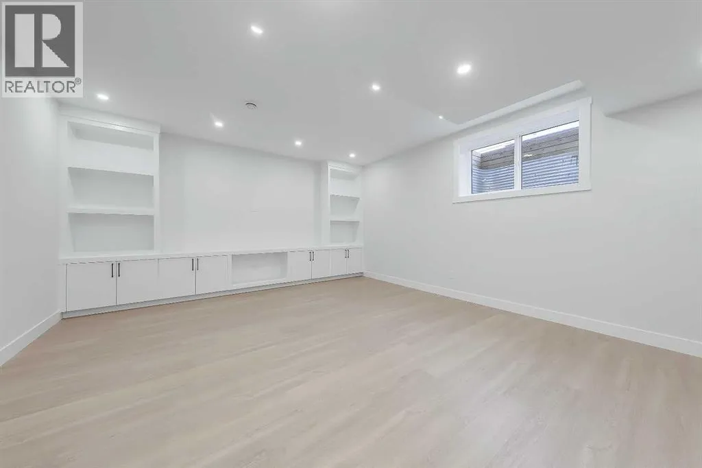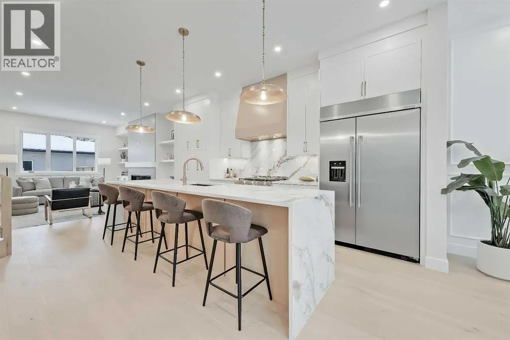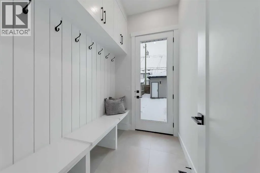 Set within sought-after KILLARNEY, this modern semi-detached home delivers light-filled interiors, a thoughtful layout, and elevated finishes that create a space that feels calm, intentional, and easy to live in. With parks, schools, and local favourites just minutes away, this is a home that supports both busy schedules and slower moments. The front entry immediately sets the tone. A welcoming foyer features CUSTOM BUILT-IN STORAGE with a bench and hooks, keeping bags, shoes, and coats neatly tucked away. Just off the entry is a stylish main floor POWDER ROOM, with quartz skirt, custom framed mirror perfectly placed for guests and day-to-day convenience without interrupting the flow of the living space. From here, the main floor opens into a clean, open layout. The kitchen sits at the centre of the home and anchors the entire level. A LARGE QUARTZ WATERFALL ISLAND creates a natural gathering point, complemented by integrated appliances, warm wood accents, and sleek cabinetry. The dining area flows easily alongside the kitchen, making it ideal for hosting or everyday meals without breaking connection. Toward the rear of the home, the living room feels comfortable and intentional. A LINEAR FIREPLACE with built-in shelving adds warmth and structure, while a BUILT-IN DESK tucked just off the living space creates an ideal work-from-home setup, homework station, or command centre that stays visually connected without taking over the room. At the back of the main floor, an ENCLOSED MUDROOM offers smart separation and functionality. Lockers and storage keep things organized, while direct access leads out to the backyard FULLY FINISHED GARAGE W/EPOXY FLOORS, making transitions effortless year-round. Upstairs, the primary suite stands out with a VAULTED CEILING and FEATURE WALL that add volume and visual interest, creating a true retreat feel. The ensuite balances style and function with a freestanding tub, glass shower, double vanity, and carefully selected finishes that fe el calm and refined. Secondary bedrooms are generously sized and easy to furnish. The upper landing adds unexpected flexibility, with enough space for a DESK, READING NOOK, or SMALL PLAY AREA, allowing this level to adapt as needs change over time. Downstairs, a spacious rec area is complemented by a DEDICATED HOME GYM complete with sports flooring and a full wall mirror. A WET BAR with floating shelves and wine fridge enhances the entertaining potential, while a bedroom and full bathroom provide comfortable space for guests or extended stays. The home is set in the heart of KILLARNEY, known for its walkability and strong local amenities. Just minutes from 17TH AVE SW, youâre close to neighbourhood favourites like Blanco Cantina & Merchants, along with nearby schools including Killarney School and Holy Name School. Optimist Athletic Park & the Killarney Aquatic & Recreation Centre are close by, while quick access to Crowchild Trail and Bow Trail keeps downtown easily within reach. (id:27476)