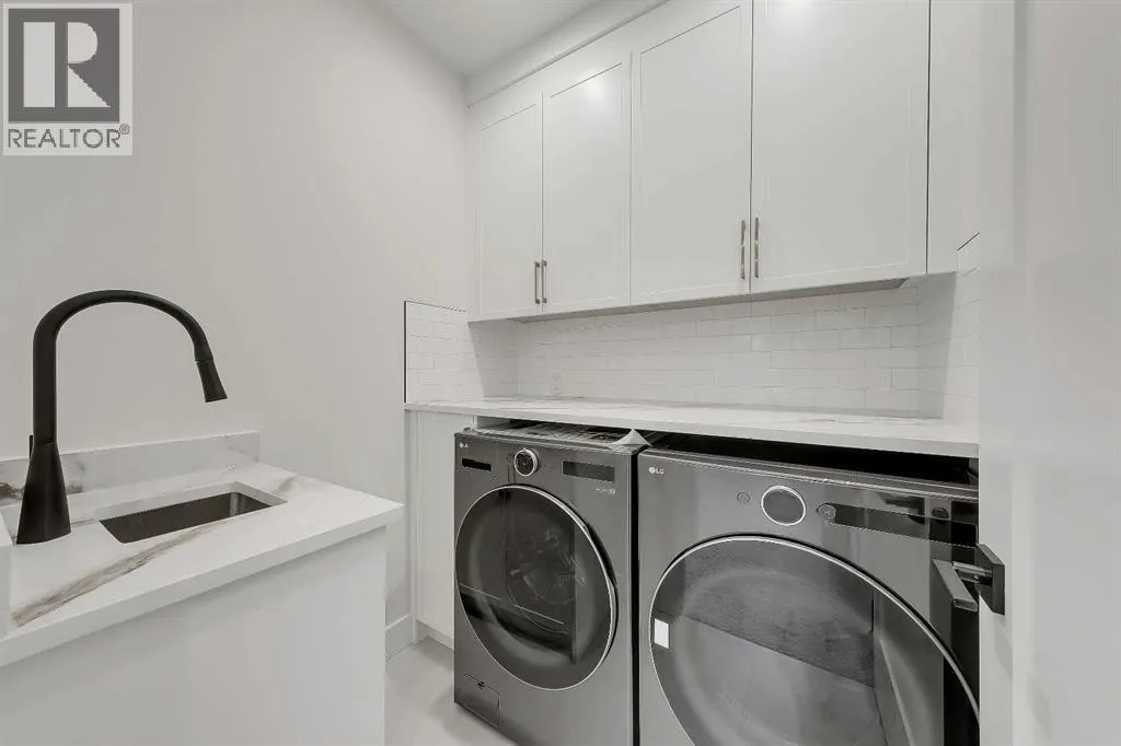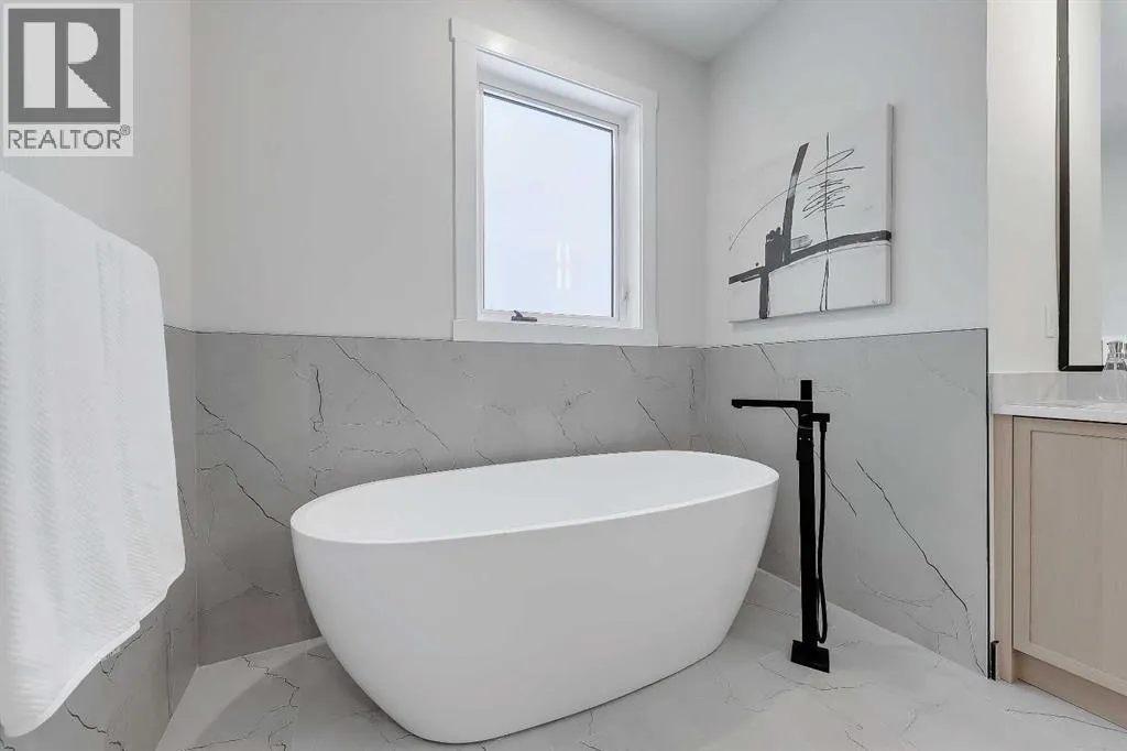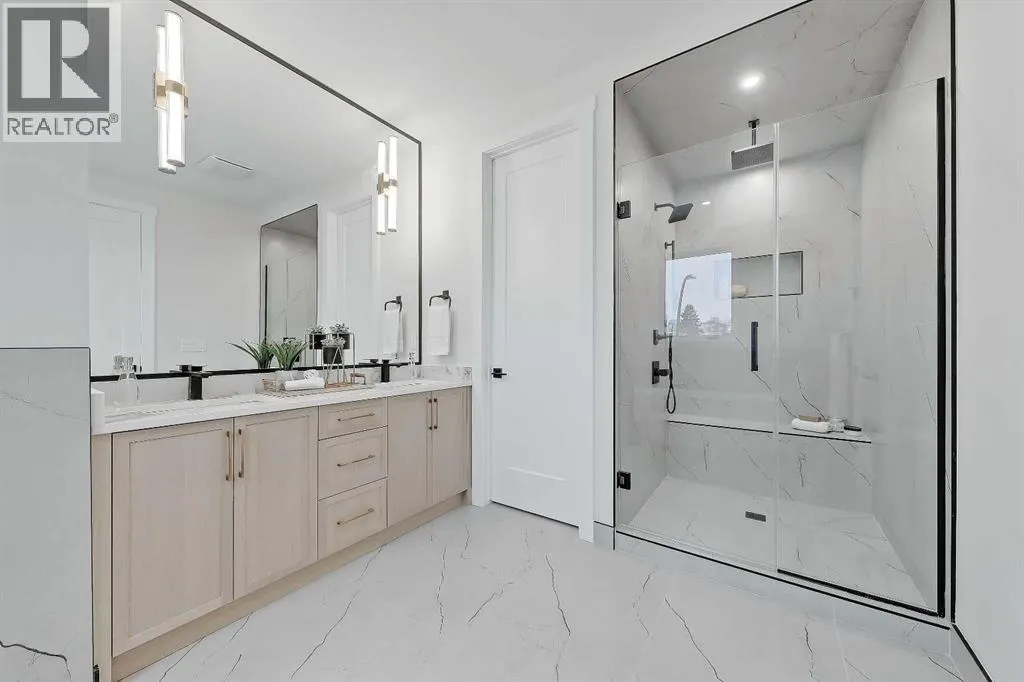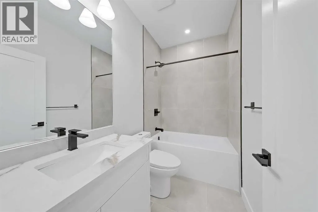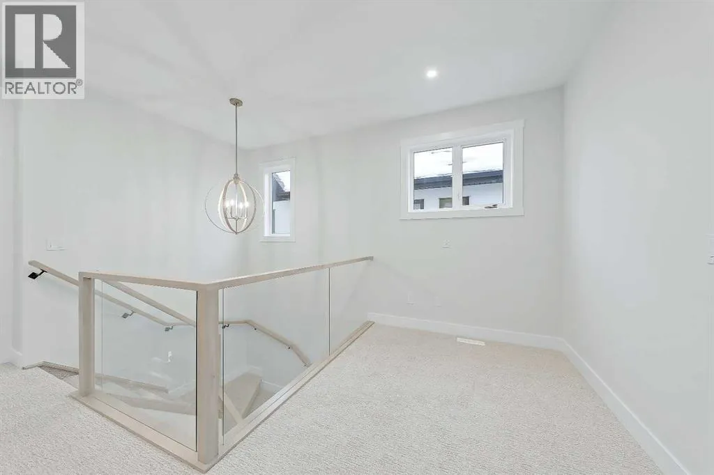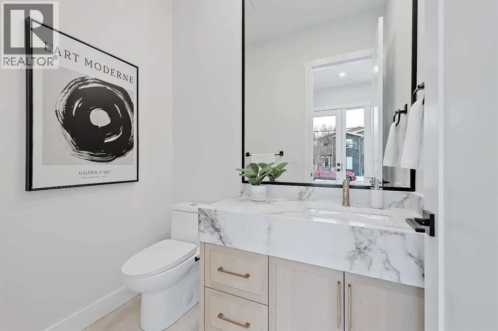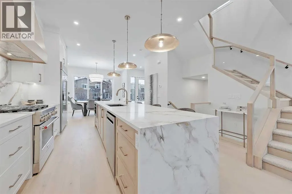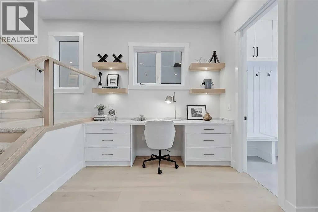 Set within sought-after KILLARNEY, this modern semi-detached home delivers light-filled interiors, a thoughtful layout, and elevated finishes that create a space that feels calm, intentional, and easy to live in. With parks, schools, and local favourites just minutes away, this is a home that supports both busy schedules and slower moments. The front entry immediately sets the tone. A welcoming foyer features CUSTOM BUILT-IN STORAGE with a bench and hooks, keeping bags, shoes, and coats neatly tucked away. Just off the entry is a stylish main floor POWDER ROOM, with quartz skirt, custom framed mirror perfectly placed for guests and day-to-day convenience without interrupting the flow of the living space. From here, the main floor opens into a clean, open layout. The kitchen sits at the centre of the home and anchors the entire level. A LARGE QUARTZ WATERFALL ISLAND creates a natural gathering point, complemented by integrated appliances, warm wood accents, and sleek cabinetry. The dining area flows easily alongside the kitchen, making it ideal for hosting or everyday meals without breaking connection. Toward the rear of the home, the living room feels comfortable and intentional. A LINEAR FIREPLACE with built-in shelving adds warmth and structure, while a BUILT-IN DESK tucked just off the living space creates an ideal work-from-home setup, homework station, or command centre that stays visually connected without taking over the room. At the back of the main floor, an ENCLOSED MUDROOM offers smart separation and functionality. Lockers and storage keep things organized, while direct access leads out to the backyard FULLY FINISHED GARAGE W/EPOXY FLOORS, making transitions effortless year-round. Upstairs, the primary suite stands out with a VAULTED CEILING and FEATURE WALL that add volume and visual interest, creating a true retreat feel. The ensuite balances style and function with a freestanding tub, glass shower, double vanity, and carefully selected finishes that fe el calm and refined. Secondary bedrooms are generously sized and easy to furnish. The upper landing adds unexpected flexibility, with enough space for a DESK, READING NOOK, or SMALL PLAY AREA, allowing this level to adapt as needs change over time. Downstairs, a spacious rec area is complemented by a DEDICATED HOME GYM complete with sports flooring and a full wall mirror. A WET BAR with floating shelves and wine fridge enhances the entertaining potential, while a bedroom and full bathroom provide comfortable space for guests or extended stays. The home is set in the heart of KILLARNEY, known for its walkability and strong local amenities. Just minutes from 17TH AVE SW, youâre close to neighbourhood favourites like Blanco Cantina & Merchants, along with nearby schools including Killarney School and Holy Name School. Optimist Athletic Park & the Killarney Aquatic & Recreation Centre are close by, while quick access to Crowchild Trail and Bow Trail keeps downtown easily within reach. (id:27476)