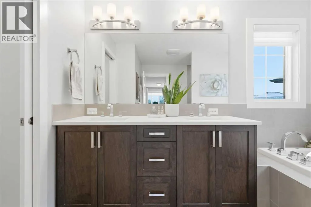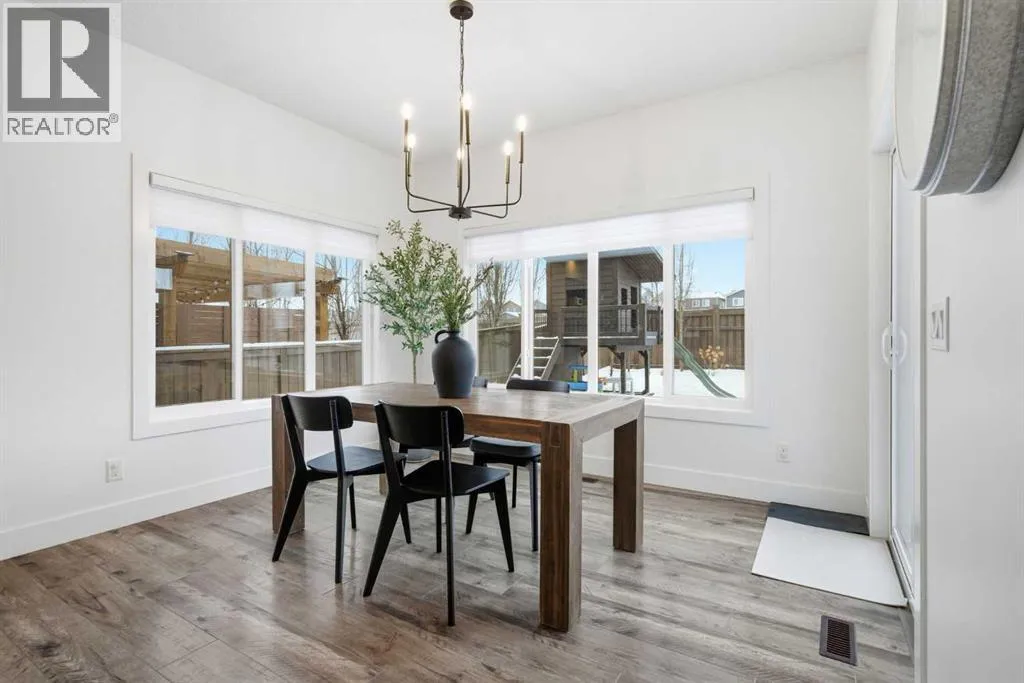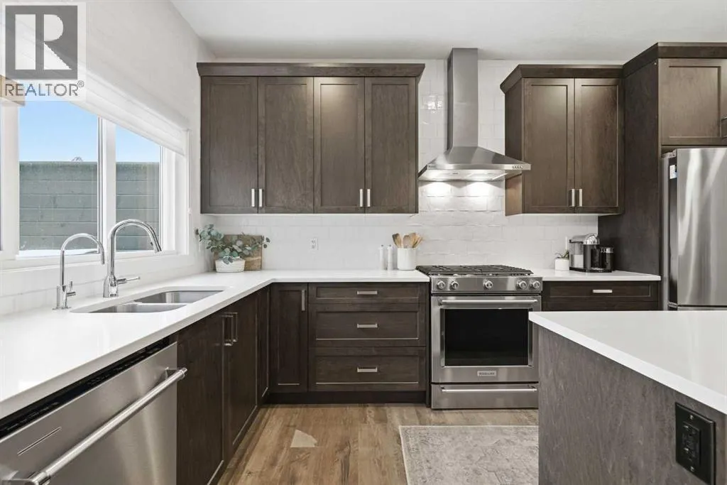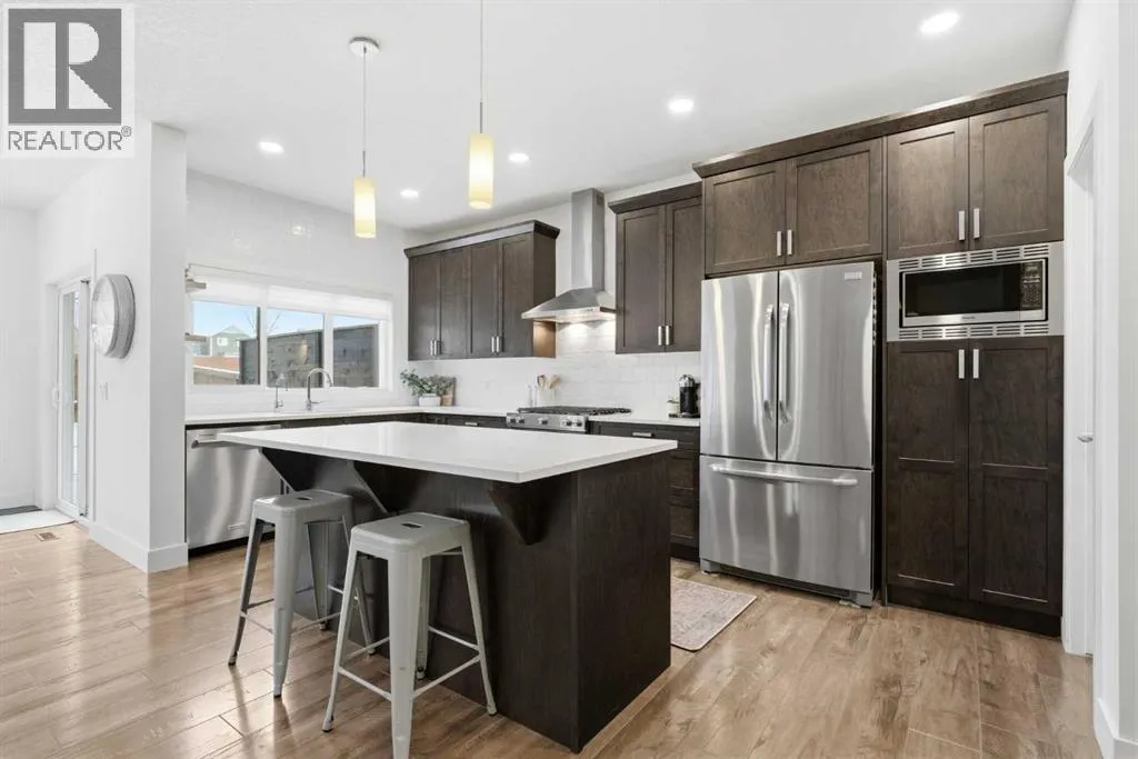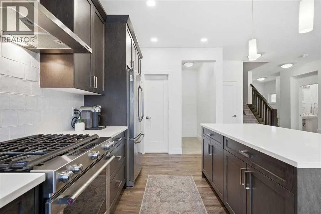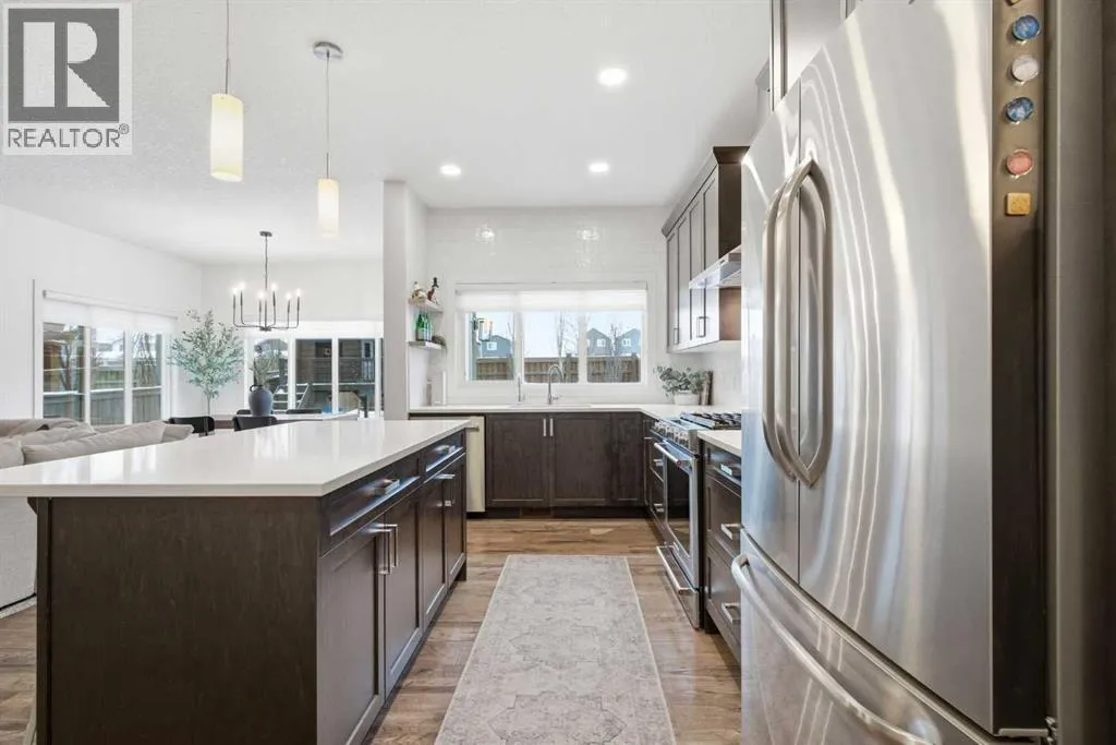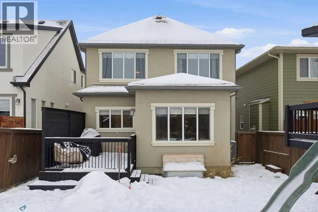 Welcome to beautiful Mahogany, one of Calgaryâs most sought-after, family-friendly lake communities. This thoughtfully updated and well-maintained two-storey home reflects true pride of ownership and offers a functional layout with generous living space, making it an excellent option for families. The main floor features a kitchen with dark maple cabinetry, white quartz countertops, full counter-to-ceiling tile backsplash, and a gas range with hood fan. Additional highlights include 9 ft ceilings, upgraded baseboards, central A/C, Hunter Douglas window coverings, and a gas fireplace. Upstairs, the primary bedroom includes a spacious ensuite with raised quartz countertops. Two additional bedrooms and upper-floor laundry complete the level. The basement has been professionally developed and adds a fourth bedroom, a full bathroom, and a large rec room. Outside, the west-facing backyard is fully landscaped and includes a natural gas line on the deck. An extended driveway and concrete walkway provide convenient backyard access. Residents enjoy year-round lake access with private beach use, clubhouse amenities, and skating rinks in the winter months. Located close to schools, playgrounds, and everyday amenities, this home is a great opportunity to live in one of Calgaryâs premier lake communities. (id:27476)