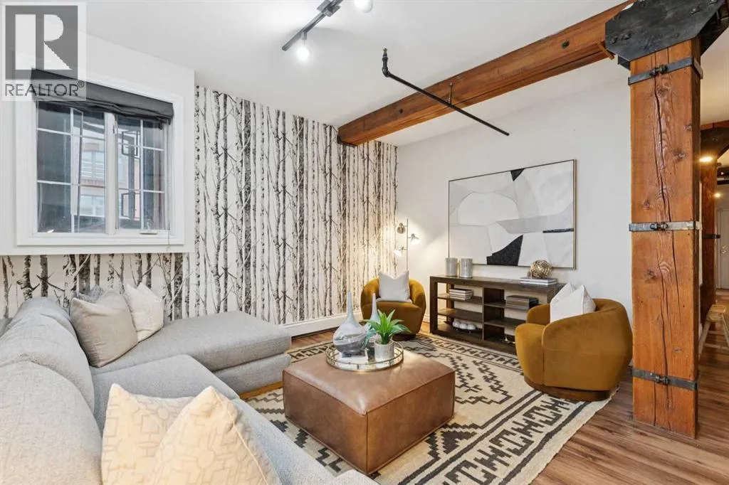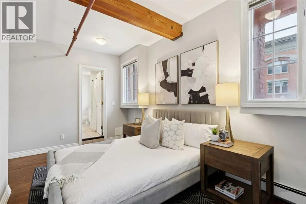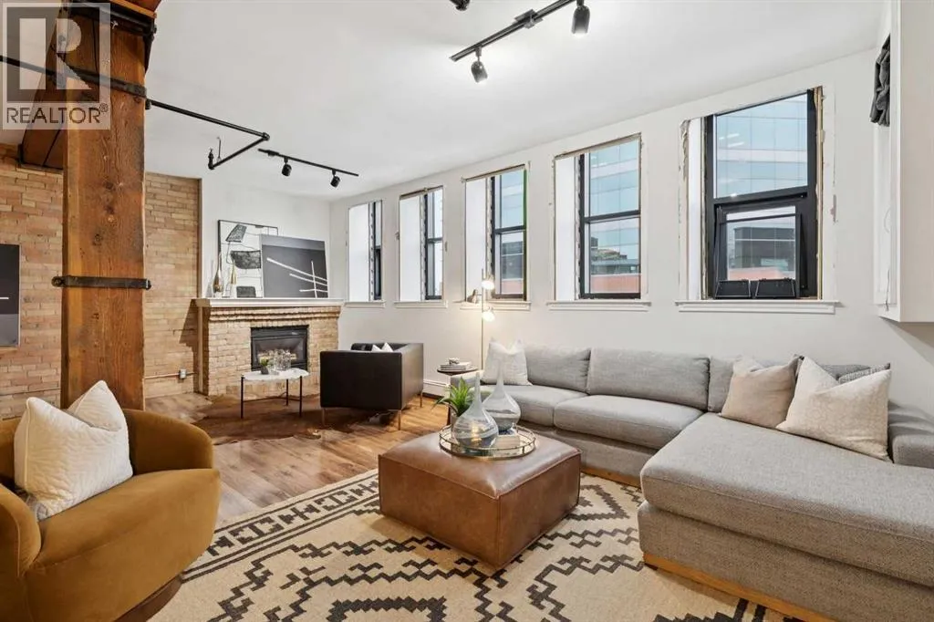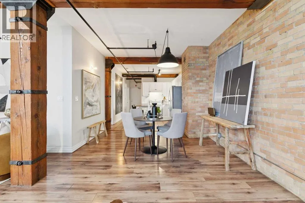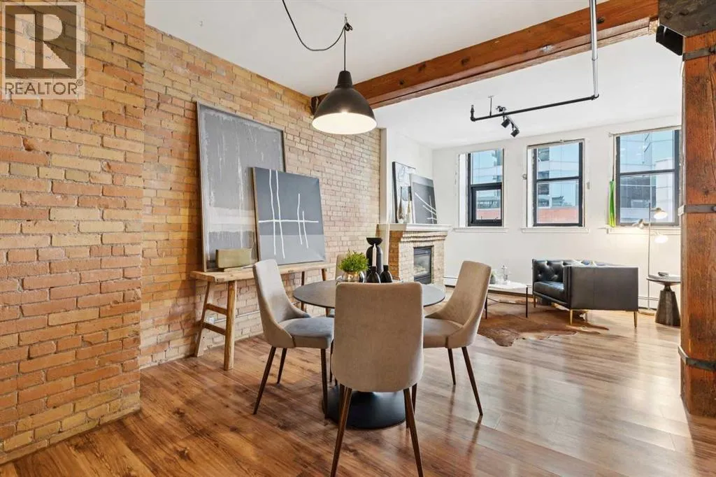Nestled in the heart of Calgary's Beltline, this extraordinary red brick loft offers a rare opportunity to own a piece of the cityâs rich history. Constructed in 1912 for the Imperial Tobacco Company by the renowned A. Dale and Associates, the architectural firm behind the iconic Calgary Tower, this building underwent a stunning conversion to lofts in 1995. For the first time ever, these timeless residences are available for sale, blending historical charm with modern sophistication. Offering over 1,100 SqFt, this expansive loft exudes character with its original brick walls, exposed wood beams, and soaring ceilings. A wall of windows floods the space with natural light, creating a warm and inviting ambiance reminiscent of a classic New York City loft. The open-concept layout is thoughtfully designed, offering endless possibilities for both living and working. A private den provides the perfect space for a home or business office, while two generously sized bedrooms are complemented by a five-piece Jack and Jill bathroom plus there is an additional three-piece bathroom. The galley-style kitchen features freshly sprayed maple cabinetry with under mount lighting, moveable island, and a seamless flow into the dining and living areas. Whether you envision this space as your personal sanctuary or a dynamic live/work environment, the possibilities are as limitless as your imagination. Beyond the loft itself, the building offers an array of amenities, including a gym, a games room, and a rooftop patio with breathtaking views of the Downtown Skyline. A titled underground parking spot is also included, ensuring convenience in this vibrant urban setting. This is more than a home; itâs a lifestyle. A rare blend of history, elegance, and modernity, this loft is a once-in-a-lifetime opportunity to own a truly unique piece of Calgaryâs architectural heritage. (id:27476)