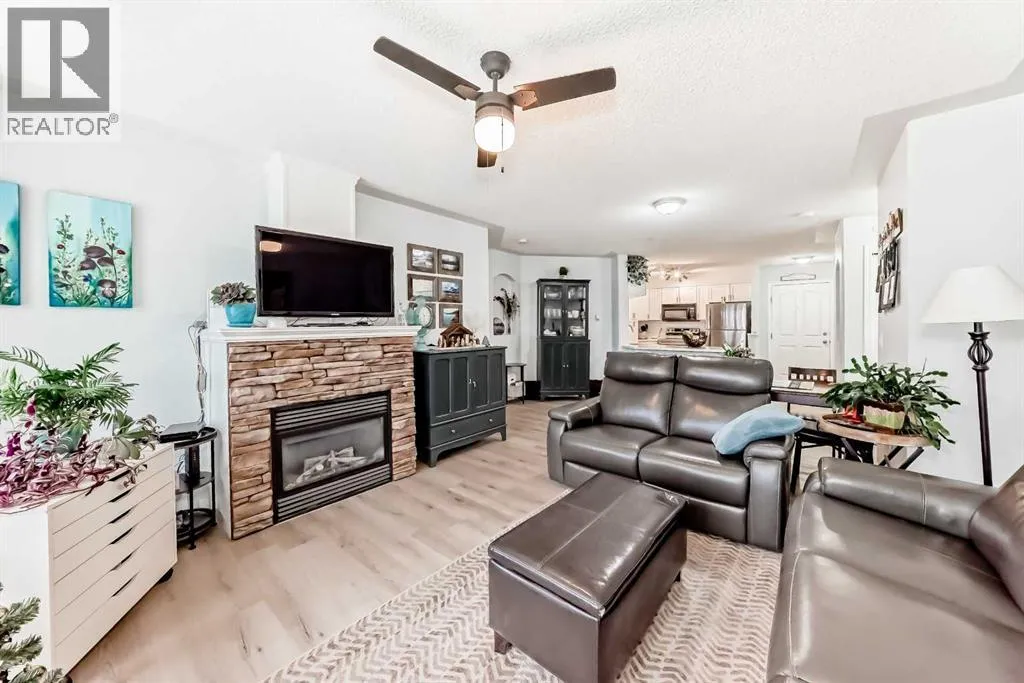 Wow! Do NOT miss this opportunity to own a truly AMAZING home. Pride of ownership shows throughout in one of the premiere units in the well-managed building in The Pavilions at Rocky Ridge! This ground level unit with 2 bedrooms, 2 baths plus a den (or 3rd bedroom) is as unique & pleasing as it is practical! Wake up every day to your own private view of the majestic Rocky Mountains! Enjoy your private, covered deck with your own convenient storage space just off of the deck. Inside, you will love the floor plan, with the open layout, fireplace, spacious kitchen, bright living room, large bedrooms, den and so much more. Your large and spacious primary bedroom leads into a gorgeous ensuite with soaker tub, shower and walk in closet. Recent upgrades include new paint & new vinyl plank flooring throughout, as well as a brand new stove. You will also have your own, heated underground parking stall. As a resident of Rocky Ridge (with a $25 per month HOA fee), you will also have access to indoor and outdoor facilities including banquet halls, fitness center, games rooms, conference rooms, tennis courts, playgrounds, cinema room and a hair salon. The location offers so much from gorgeous views, to walking/bike paths, ponds, proximity to shopping, major roads, public transit and more. Book your private viewing today! (id:27476)