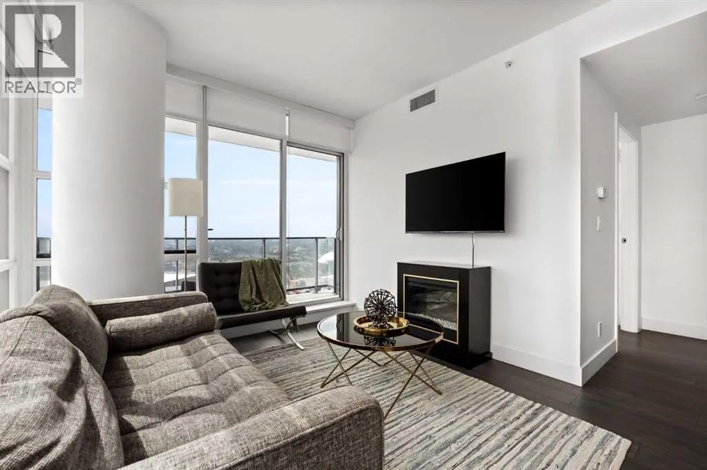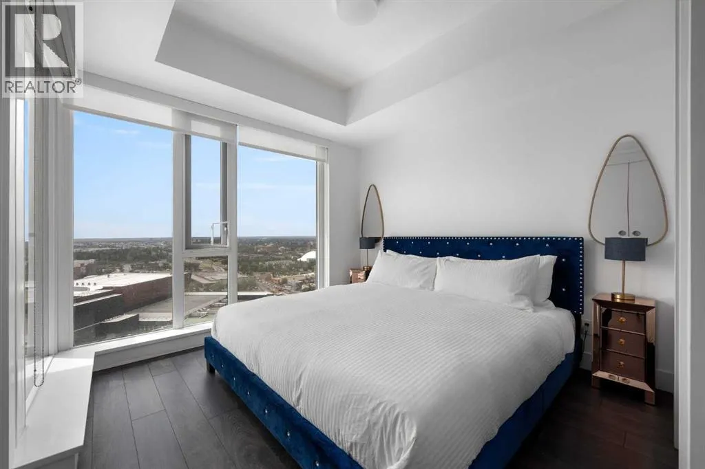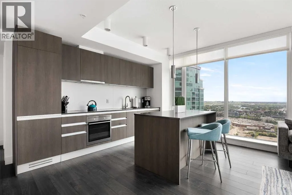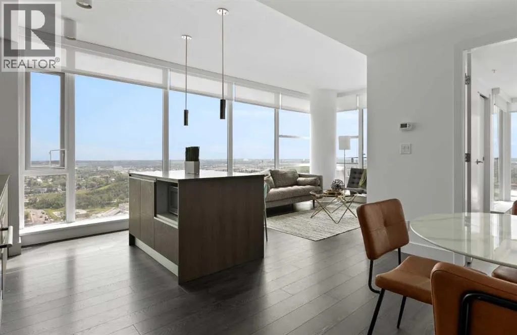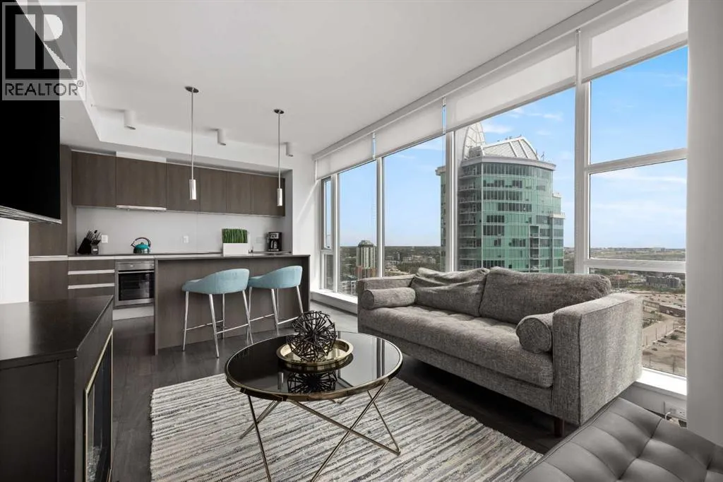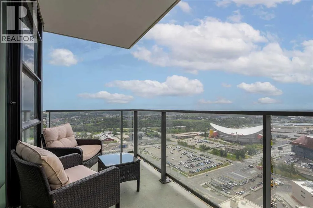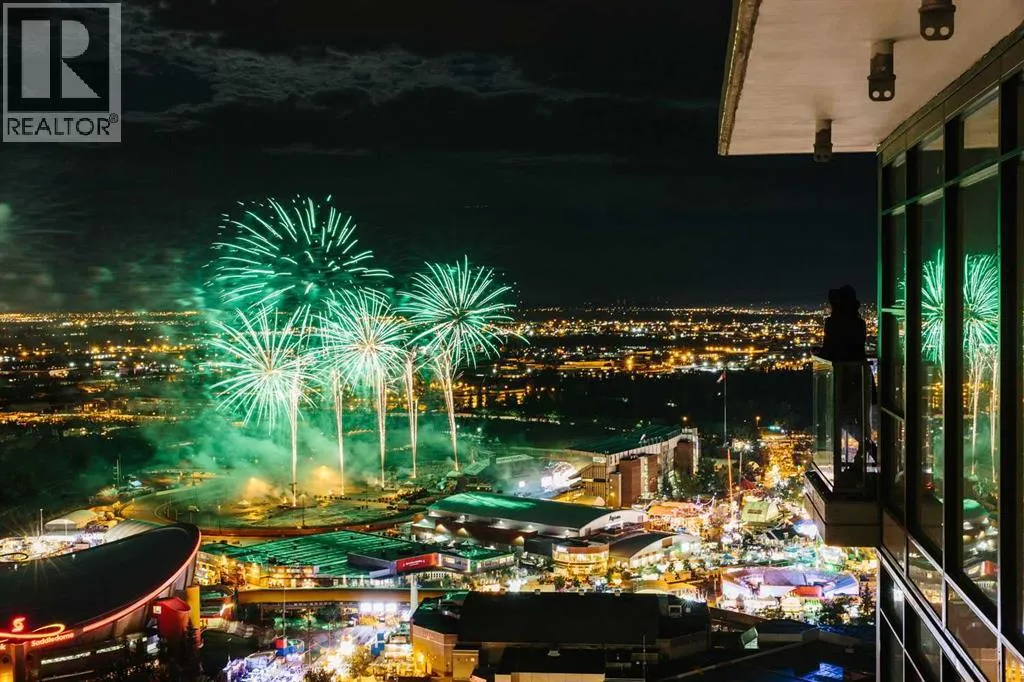 Welcome to this spectacular 2-bedroom, 2-bathroom residence perched on the 31st floor of the prestigious Guardian South Tower. Offering one of the most impressive vantage points in the building, this sky-high home features sweeping, uninterrupted views of the Stampede Grounds, Saddledome, the new BMO Centre, Elbow River, downtown skyline, and Calgaryâs future entertainment district. From breathtaking sunrises to the glow of Stampede fireworks, the panorama from this elevation is truly unmatched. Designed to maximize light and livability, the open-concept floor plan is wrapped in floor-to-ceiling windows, creating a bright and airy atmosphere throughout. The modern kitchen features sleek cabinetry, integrated appliances, and quartz countertops, flowing seamlessly into the living and dining areas â perfect for hosting or unwinding with the cityscape as your backdrop. The primary bedroom offers its own private retreat with an ensuite and ample storage, while the second bedroom is ideal for guests, extended family, or a dedicated office. Thoughtful separation between the bedrooms enhances privacy and functionality. A private balcony allows you to take full advantage of the 31st-floor views. Residents enjoy exclusive access to premium building amenities, including a fully equipped fitness centre, resident lounge, workshop, and professional concierge service. A titled underground parking stall is included for your convenience. Set in one of Calgaryâs most exciting districts, you are steps from the Central Library, Studio Bell, East Village, Inglewood, Stampede Park, new event facilities, cafés, transit, the river pathways, and the downtown core. This is urban living at its very best. Whether you are seeking a luxurious inner-city home or a strong investment with excellent rental potential â including corporate stays or short-term rental opportunities â this residence delivers unmatched views, refined finishes, and an unbeatable location. (id:27476)