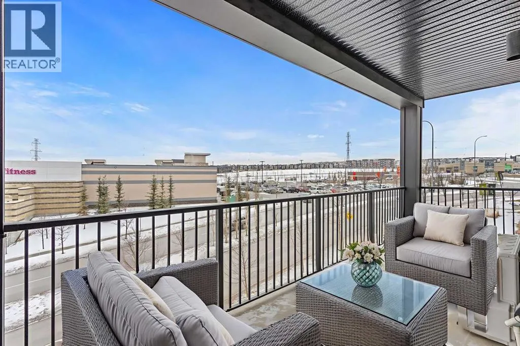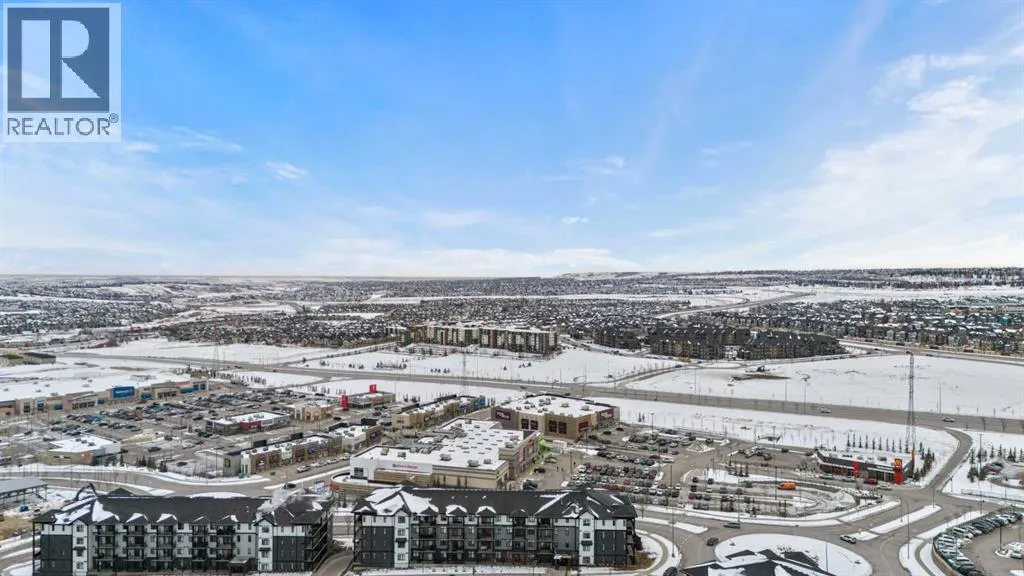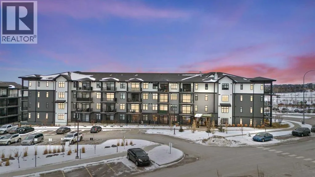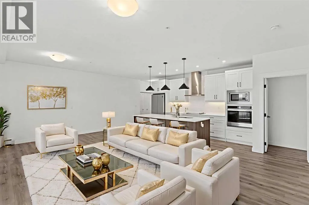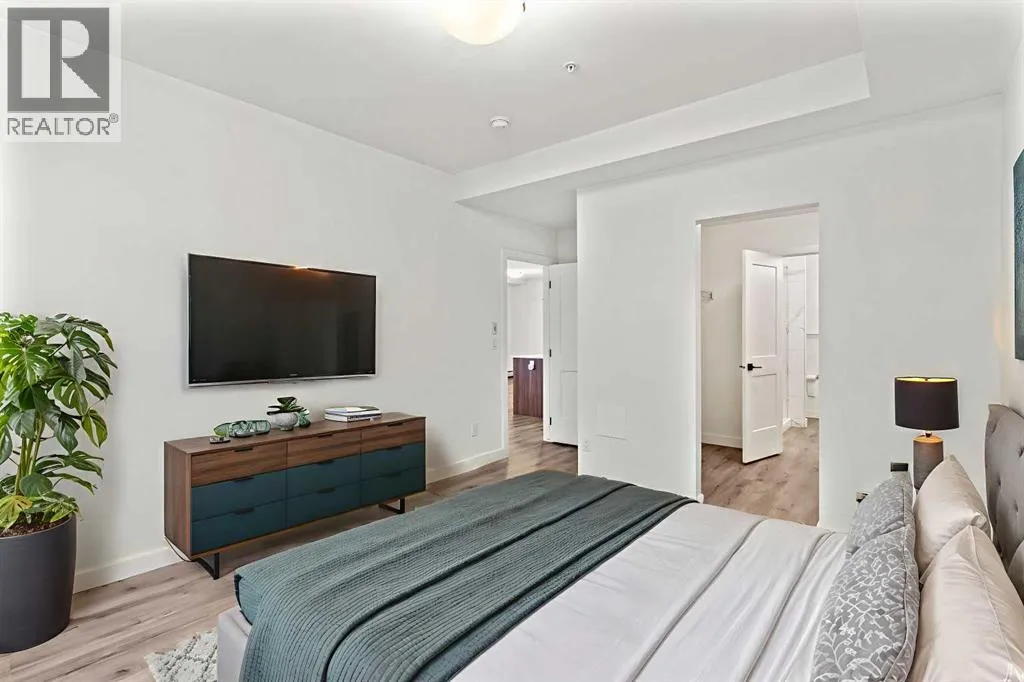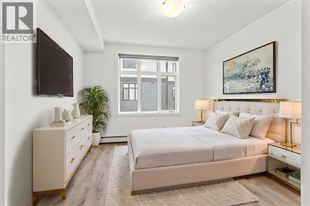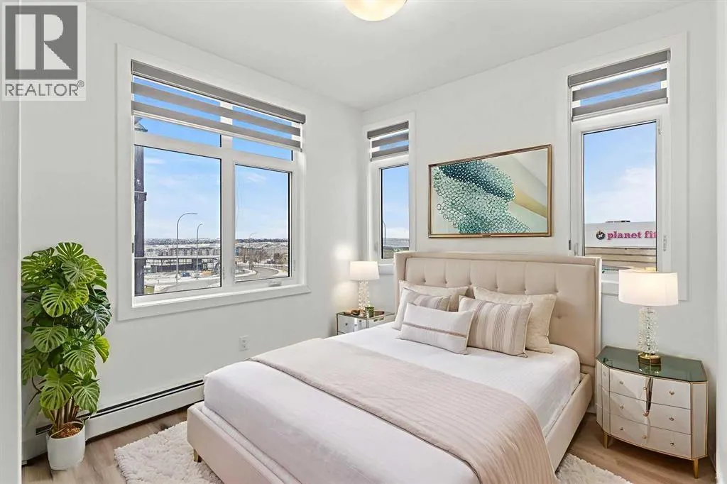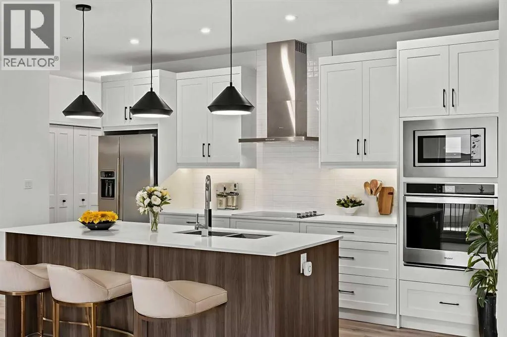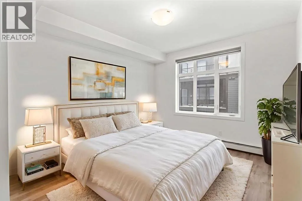 Welcome to elevated condo livingâwhere refined design, thoughtful upgrades, and everyday comfort come together seamlessly. This impeccably maintained end-unit residence is filled with natural light, framed by 9-foot ceilings and expansive south- and east-facing windows that create an airy, upscale atmosphere throughout.The upgraded kitchen is a true showpiece, featuring quartz countertops, extended 41-inch upper cabinetry, and a striking oversized island designed for both entertaining and effortless daily living. Luxury vinyl plank flooring flows throughout the home, connecting the generous dining area to a spacious living room thatâs perfect for hosting or unwinding in style. Convenient in-suite laundry adds to the homeâs functional appeal.The primary suite is a private retreat, offering a generous layout, an extra-large walk-in closet with custom organizer, and a spa-inspired 4-piece ensuite complete with a tiled shower and upgraded cabinetry. The second bedroom provides excellent flexibility, enhanced by a pocket door offering direct access to the main bathroomâideal for guests or a home office setup.With over $27,000 in builder upgrades, this home stands apart. Motorized zebra blinds (throughout, excluding the second bedroom) and builder-installed air conditioning deliver both comfort and convenience year-round. Step back and take in the open views, all while being moments from shops, dining, and everyday amenities in a vibrant, well-connected community.The offering is completed by one of the largest heated underground parking stalls in the building, paired with spacious storageâa rare and valuable combination.This is modern condo living done right. Thoughtfully upgraded, beautifully finished, and perfectly locatedâan exceptional opportunity to own a home that truly delivers on lifestyle and quality. (id:27476)