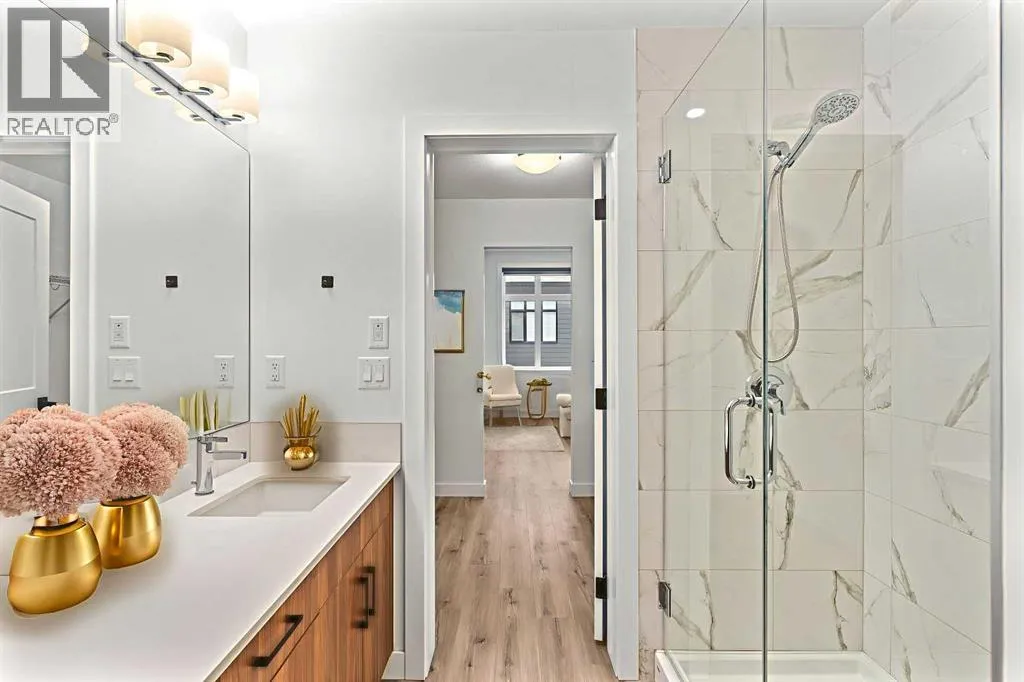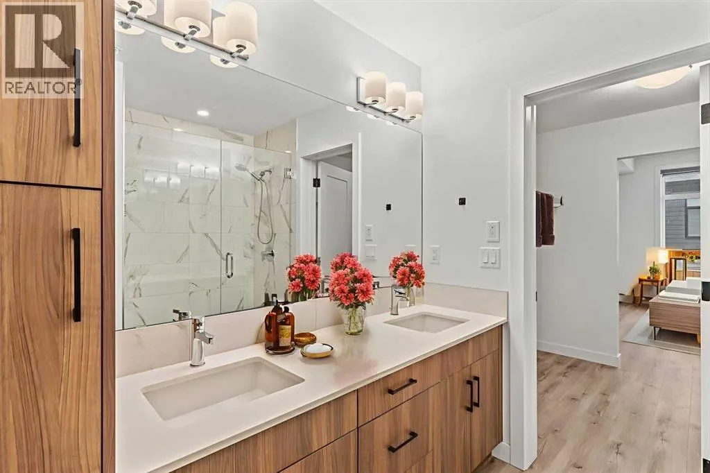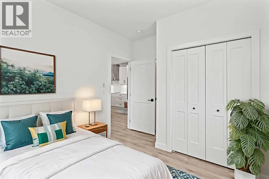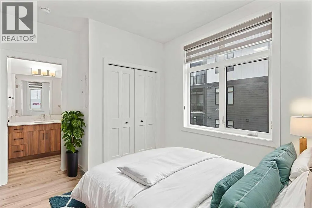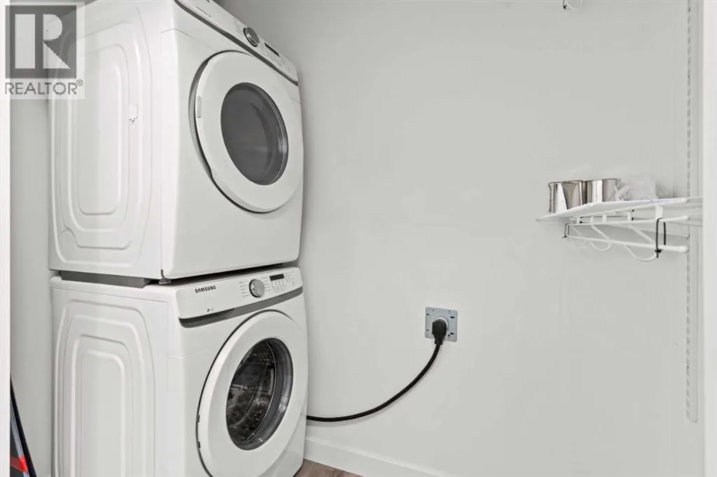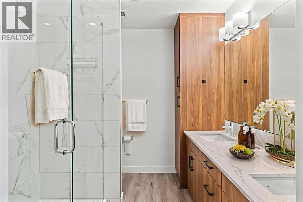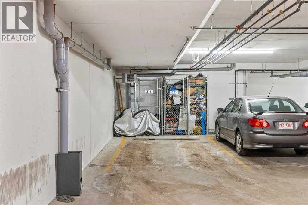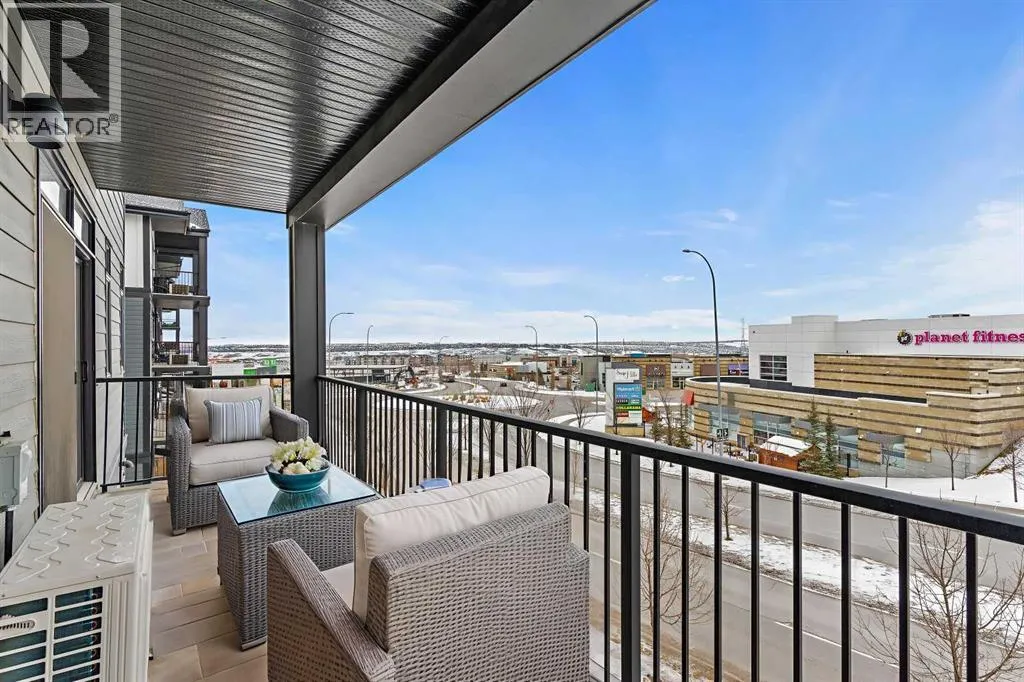 Welcome to elevated condo livingâwhere refined design, thoughtful upgrades, and everyday comfort come together seamlessly. This impeccably maintained end-unit residence is filled with natural light, framed by 9-foot ceilings and expansive south- and east-facing windows that create an airy, upscale atmosphere throughout.The upgraded kitchen is a true showpiece, featuring quartz countertops, extended 41-inch upper cabinetry, and a striking oversized island designed for both entertaining and effortless daily living. Luxury vinyl plank flooring flows throughout the home, connecting the generous dining area to a spacious living room thatâs perfect for hosting or unwinding in style. Convenient in-suite laundry adds to the homeâs functional appeal.The primary suite is a private retreat, offering a generous layout, an extra-large walk-in closet with custom organizer, and a spa-inspired 4-piece ensuite complete with a tiled shower and upgraded cabinetry. The second bedroom provides excellent flexibility, enhanced by a pocket door offering direct access to the main bathroomâideal for guests or a home office setup.With over $27,000 in builder upgrades, this home stands apart. Motorized zebra blinds (throughout, excluding the second bedroom) and builder-installed air conditioning deliver both comfort and convenience year-round. Step back and take in the open views, all while being moments from shops, dining, and everyday amenities in a vibrant, well-connected community.The offering is completed by one of the largest heated underground parking stalls in the building, paired with spacious storageâa rare and valuable combination.This is modern condo living done right. Thoughtfully upgraded, beautifully finished, and perfectly locatedâan exceptional opportunity to own a home that truly delivers on lifestyle and quality. (id:27476)