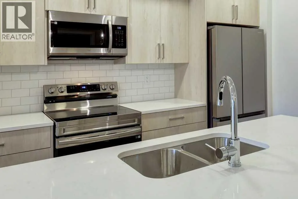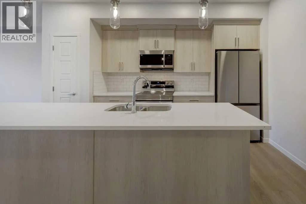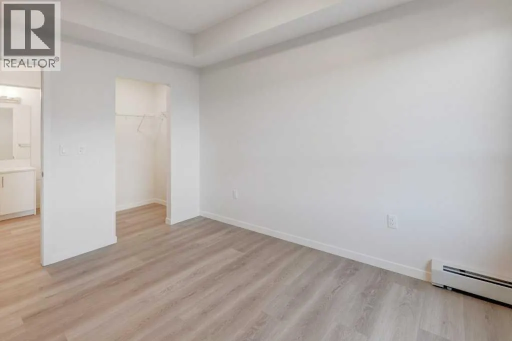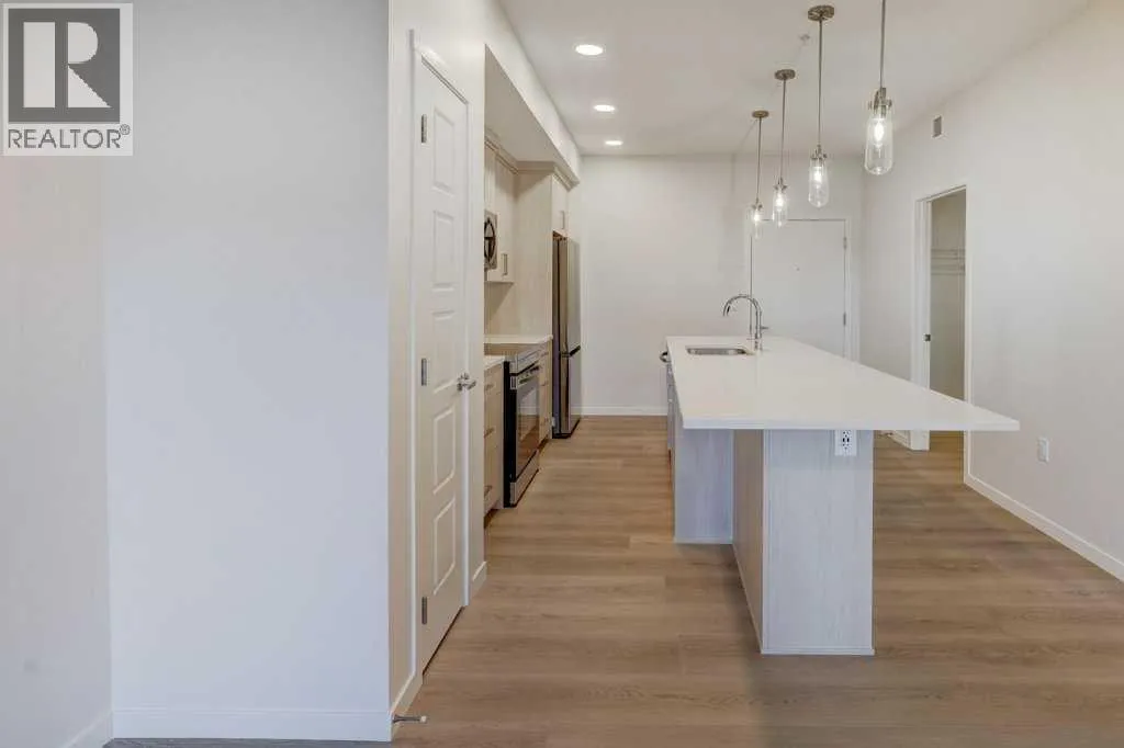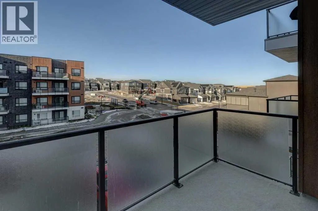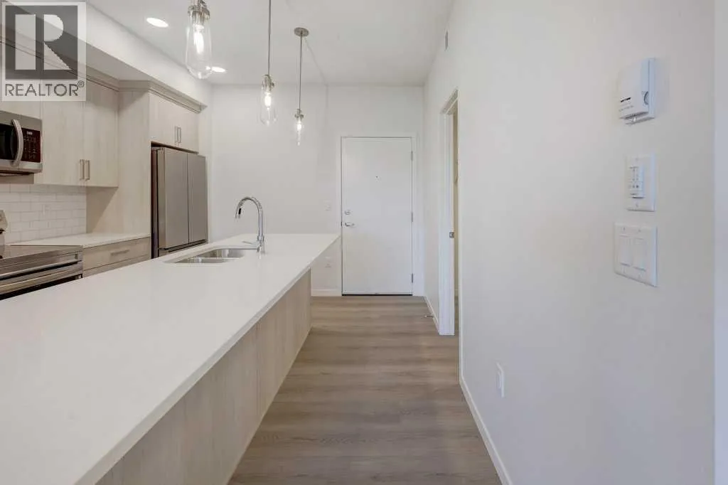INTRODUCING GLACIER RIDGE, IN BEAUTIFUL NORTHWEST CALGARY. BUILT BY CEDARGLEN LIVING, WINNER OF THE Customer Insight BUILDER OF CHOICE AWARD, 6 YEARS RUNNING! BRAND NEW "GR04" unit with high-spec features. You will feel right at home in this well thought-out, 586.94 RMS sq.ft. 1 bed, 1 bath home with open plan, 9' ceilings, LVP flooring throughout (NO CARPET), Low E triple glazed windows, BBQ gas line on the patio, Fresh Air System (ERV), A/C rough-in, and so much more. The kitchen is spectacular with full height, two tone cabinets, quartz counters, upgraded bank of drawers for pots and pans, undermount sink, rough-in water line to the fridge and S/S appliances. The island is extensive with built in flush breakfast bar, which transitions into the spacious living area, perfect for entertaining. The spacious primary bedroom has a large bright window (triple pane windows) and sizeable walk-in closet. Right beside your bedroom is a 4pc bath with quartz counters, upgraded tiles to the ceiling, and undermount sink. Nearby is the spacious laundry/storage room, this is a must see (washer & dryer included). Highlights include: Hardie board siding, designer lighting package, sound reducing membrane to reduce sound transmission between floors, clear glass railing to balconies and 1 titled underground parking stall included. A once in a lifetime community in Northwest Calgary. Framed by views of the Rocky Mountains and distinguished by natural coulees that cross the land, Glacier Ridge offers a rare chance for families to live in a new community. PET FRIENDLY COMPLEX, IMMEDIATE POSSESSION AVAILABLE AND DON'T FORGET TO CHECK OUT THE VIRTUAL TOUR. (id:27476)