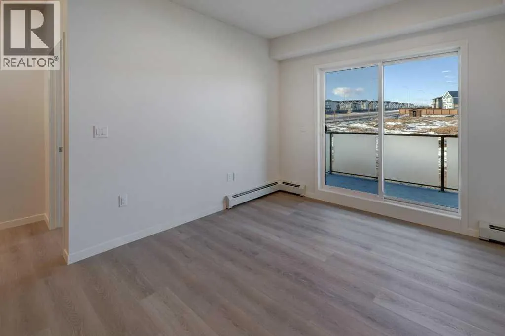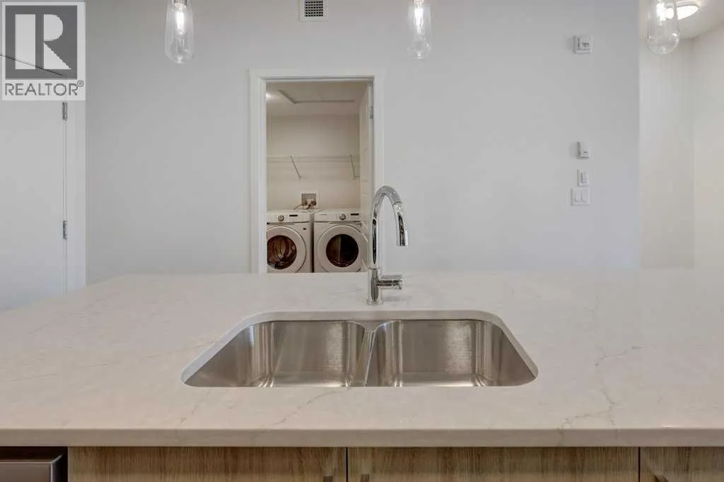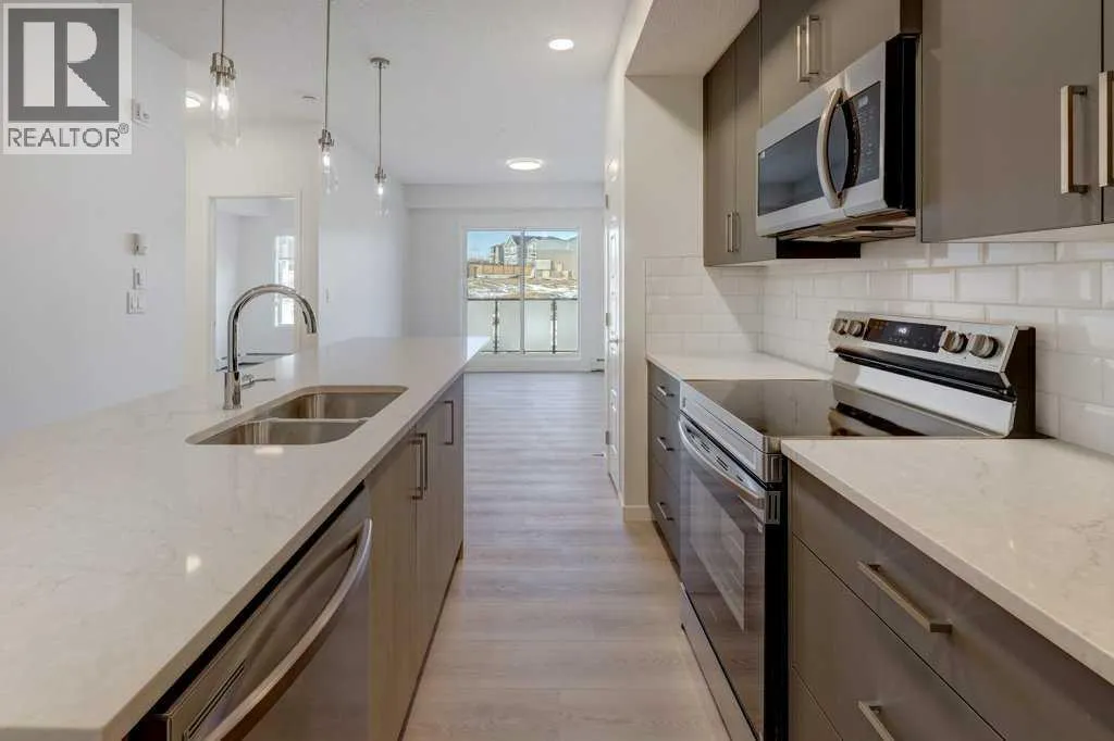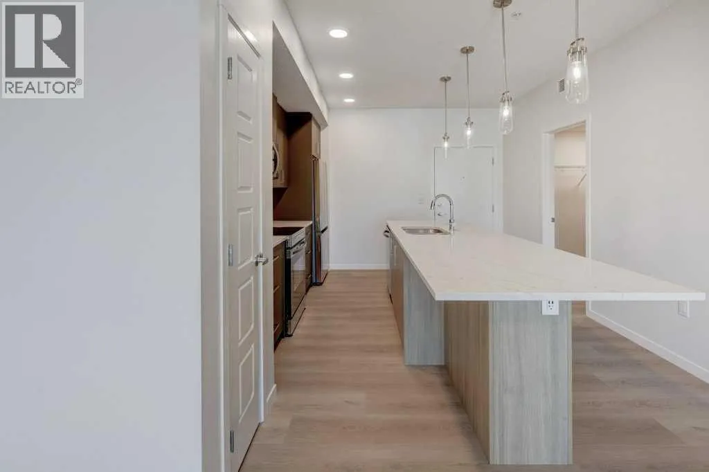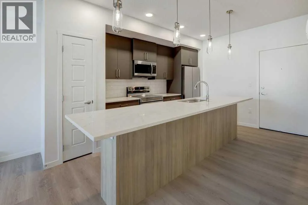 INTRODUCING GLACIER RIDGE, IN BEAUTIFUL NORTHWEST CALGARY. BUILT BY CEDARGLEN LIVING, WINNER OF THE Customer Insight BUILDER OF CHOICE AWARD, 6 YEARS RUNNING! BRAND NEW "GR04" unit with high-spec features. You will feel right at home in this well thought-out, 590.72 RMS sq.ft. 1 bed, 1 bath home with open plan, 9' ceilings, LVP flooring throughout (NO CARPET), Low E triple glazed windows, BBQ gas line on the patio, Fresh Air System (ERV), A/C rough-in, and so much more. The kitchen is spectacular with full height, two tone cabinets, quartz counters, upgraded bank of drawers for pots and pans, undermount sink, rough-in water line to the fridge and S/S appliances. The island is extensive with built in flush breakfast bar, which transitions into the spacious living area, perfect for entertaining. The spacious primary bedroom has a large bright window (triple pane windows) and sizeable walk-in closet. Right beside your bedroom is a 4pc bath with quartz counters, upgraded tiles to the ceiling, and undermount sink. Nearby is the spacious laundry/storage room, this is a must see (washer & dryer included). Highlights include: Hardie board siding, designer lighting package, sound reducing membrane to reduce sound transmission between floors, clear glass railing to balconies and 1 titled underground parking stall included. A once in a lifetime community in Northwest Calgary. Framed by views of the Rocky Mountains and distinguished by natural coulees that cross the land, Glacier Ridge offers a rare chance for families to live in a new community. PET FRIENDLY COMPLEX, IMMEDIATE POSSESSION AVAILABLE AND DON'T FORGET TO CHECK OUT THE VIRTUAL TOUR. (id:27476)