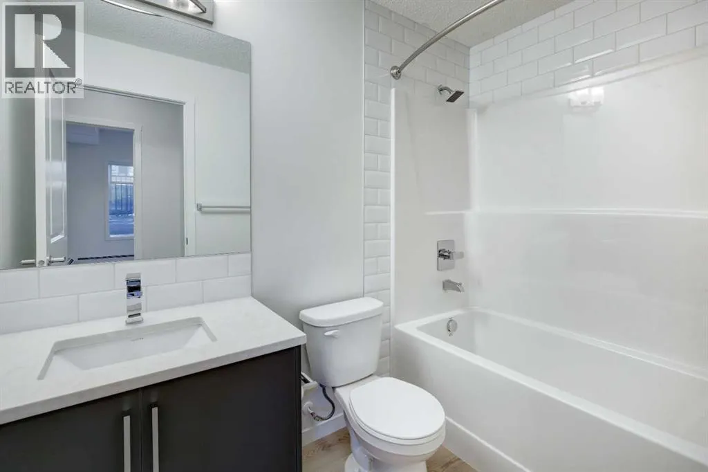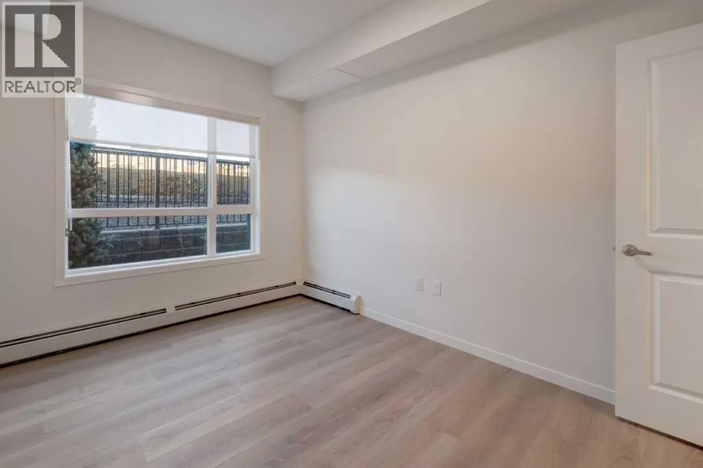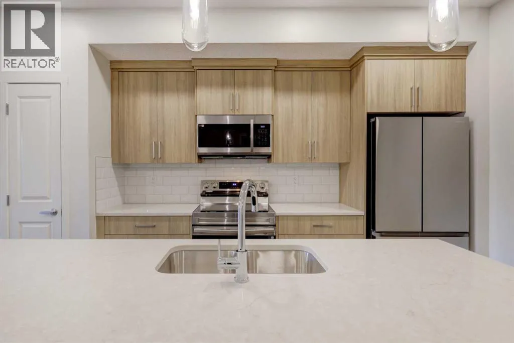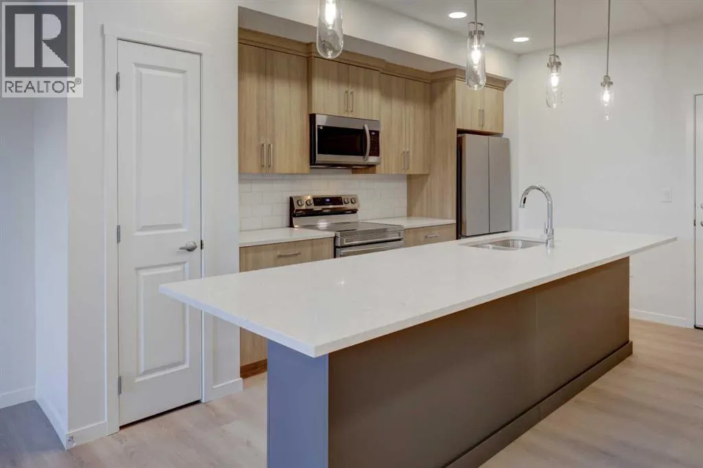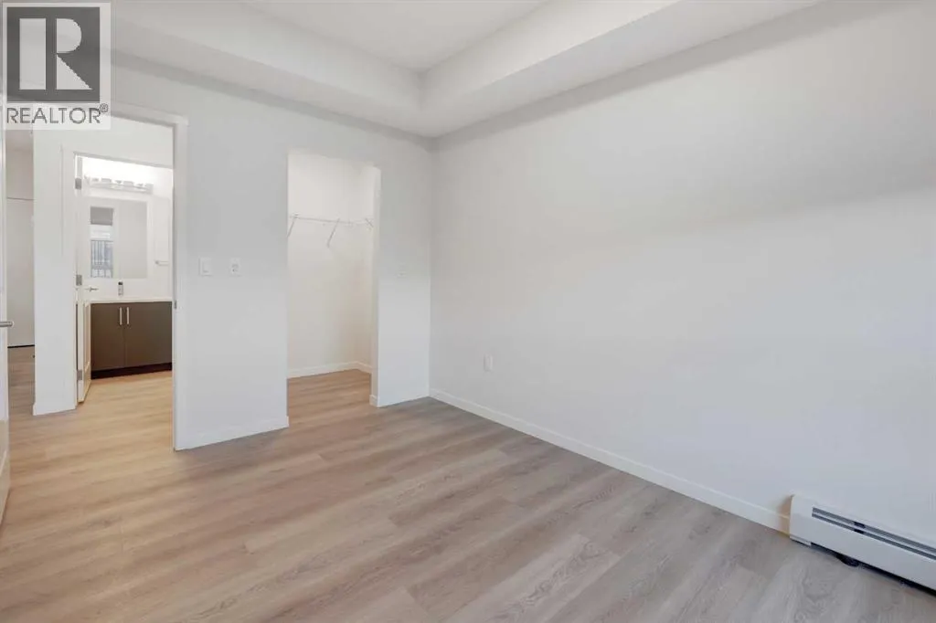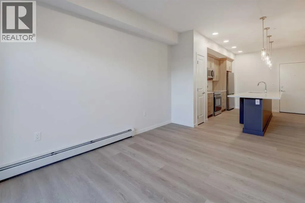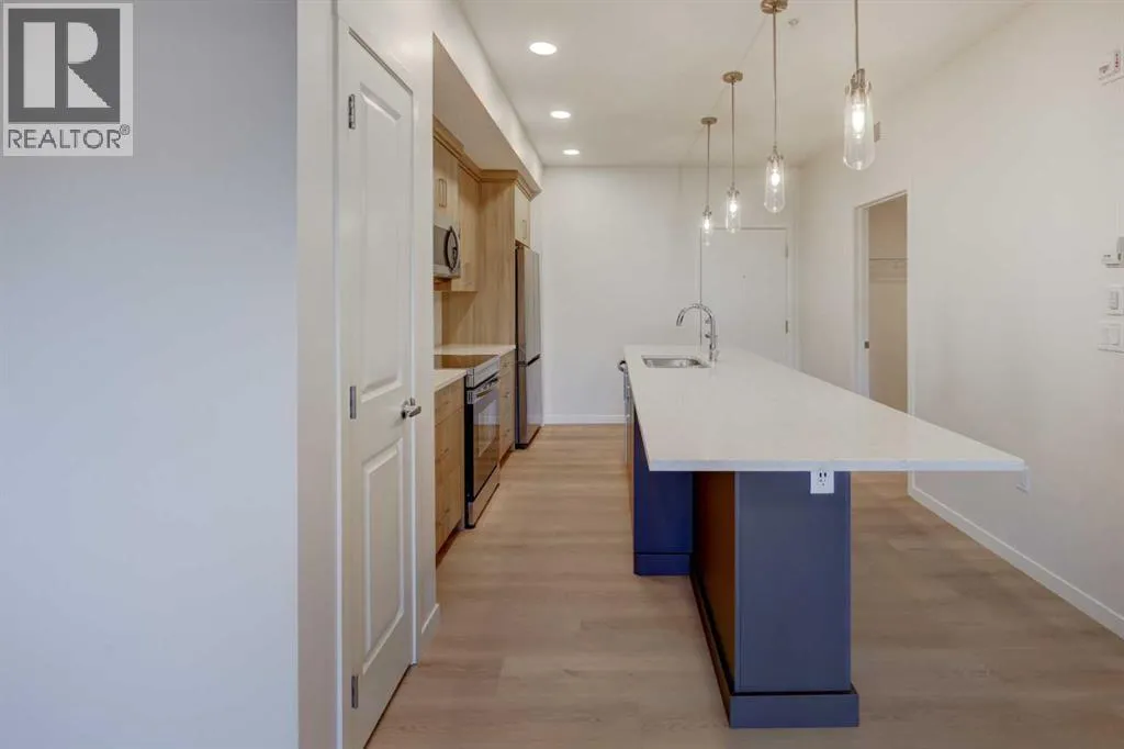 INTRODUCING GLACIER RIDGE, IN BEAUTIFUL NORTHWEST CALGARY. BUILT BY CEDARGLEN LIVING, WINNER OF THE Customer Insight BUILDER OF CHOICE AWARD, 6 YEARS RUNNING! BRAND NEW "GR04" unit with high-spec features. You will feel right at home in this well thought-out, 588.10 RMS sq.ft. 1 bed, 1 bath home with open plan, 9' ceilings, LVP flooring throughout (NO CARPET), Low E triple glazed windows, BBQ gas line on the patio, Fresh Air System (ERV), A/C rough-in, and so much more. The kitchen is spectacular with full height, two tone cabinets, quartz counters, upgraded bank of drawers for pots and pans, undermount sink, rough-in water line to the fridge and S/S appliances. The island is extensive with built in flush breakfast bar, which transitions into the spacious living area, perfect for entertaining. The spacious primary bedroom has a large bright window (triple pane windows) and sizeable walk-in closet. Right beside your bedroom is a 4pc bath with quartz counters, upgraded tiles to the ceiling, and undermount sink. Nearby is the spacious laundry/storage room, this is a must see (washer & dryer included). Highlights include: Hardie board siding, designer lighting package, sound reducing membrane to reduce sound transmission between floors, clear glass railing to balconies and 1 titled underground parking stall included. A once in a lifetime community in Northwest Calgary. Framed by views of the Rocky Mountains and distinguished by natural coulees that cross the land, Glacier Ridge offers a rare chance for families to live in a new community. PET FRIENDLY COMPLEX, IMMEDIATE POSSESSION AVAILABLE AND DON'T FORGET TO CHECK OUT THE VIRTUAL TOUR. (id:27476)