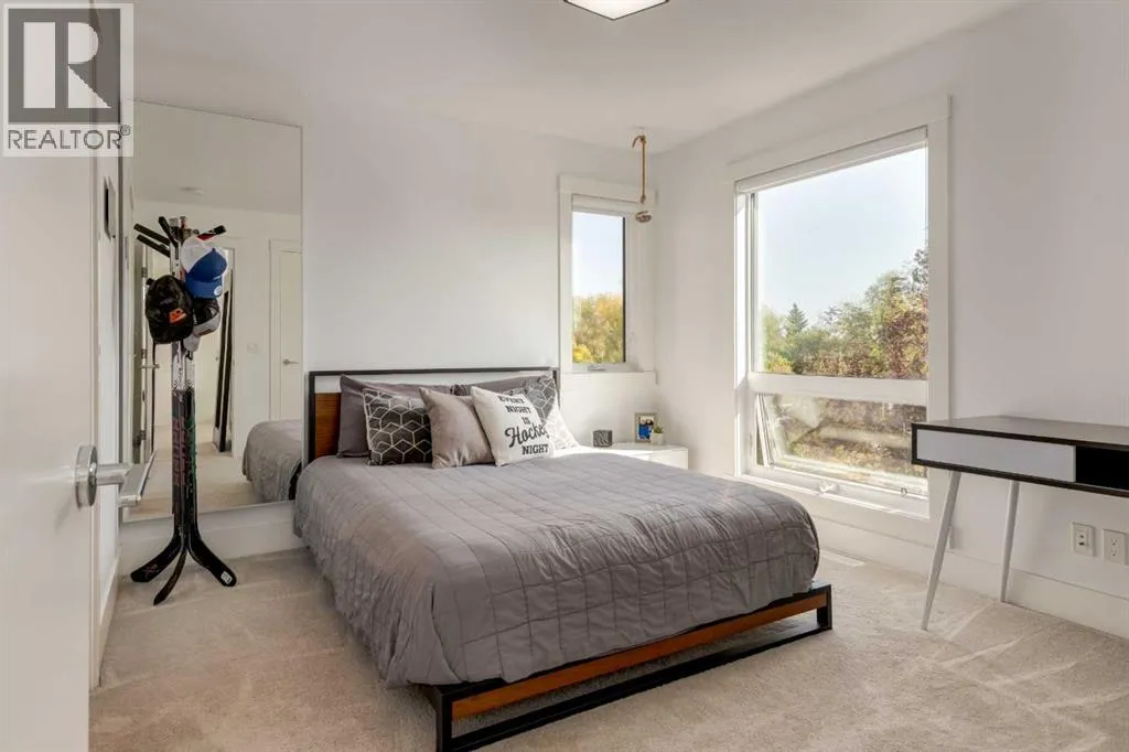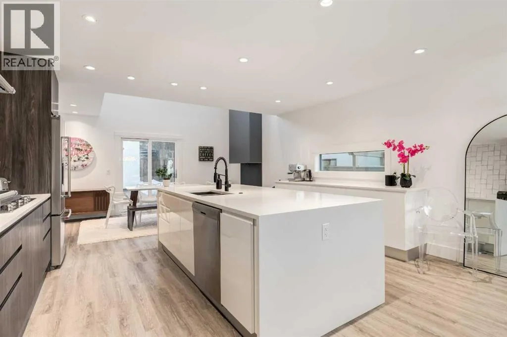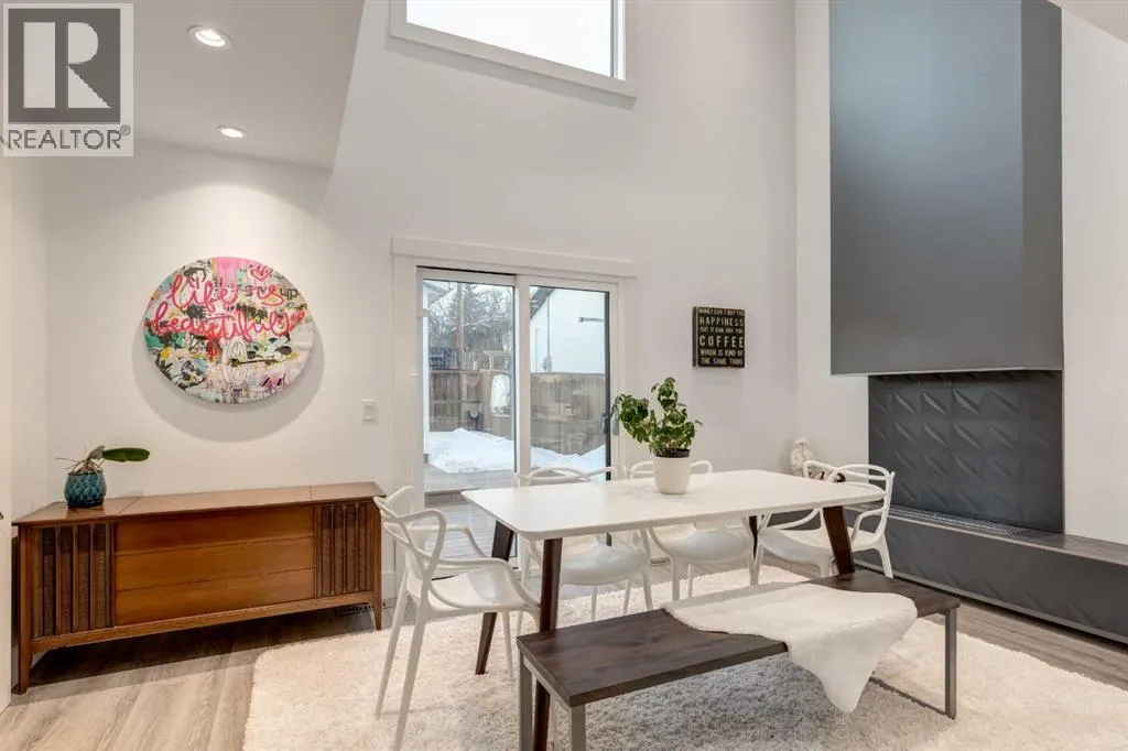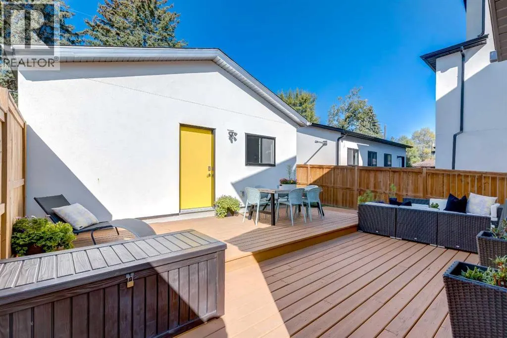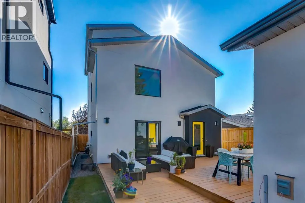 The home with the yellow door... yes, that one. Now is your chance to own this striking modern residence tucked into the sought-after community of Highwood. Situated on an extra-wide lot, this thoughtfully designed home offers over 2,900 sq ft of living space across three levels, plus a fully developed basement, all created to maximize light, volume, and livability. Clean architectural lines, a soft neutral palette, and expansive windows set a calm, airy tone throughout. Soaring ceilings, sleek finishes, and two dramatic open-to-below spaces are flooded with natural light from four skylights, creating a sense of space that feels both intentional and inviting. The kitchen balances form and function beautifully, featuring stainless steel appliances, a gas range, custom soft-close Italian cabinetry, and white quartz countertops with a waterfall island, designed for both everyday living and entertaining. The main living area is anchored by a distinctive BioFlame fireplace and opens seamlessly to a 600 sq ft deck and professionally landscaped, west-facing backyard, ideal for sunset evenings. The second level offers three bedrooms, including one with a private ensuite and heated floors, while custom built-ins throughout the home ensure effortless organization. The third-floor primary retreat feels like a private spa, complete with in-floor heating, an oversized shower, and serene finishes. Step onto your private balcony and take in downtown views- perfect for enjoying fireworks from the comfort of home. The legal one-bedroom basement suite is equally polished, with a private side entrance, custom Italian kitchen, radiant floor heating, soundproofed construction, oversized shower, and generous storage. With long-term tenants eager to stay, itâs an ideal income opportunity or multi-generational solution. Additional highlights include an oversized 22â x 24â insulated garage with 220V EV charging, custom window coverings, USB outlets throughout, high-efficiency furnace and ho t water tank, roughed-in A/C, and a quiet cul-de-sac location with an east-facing front overlooking a lush park. Surrounded by mature trees and excellent schoolsâincluding public, Catholic, French, Spanish, Mandarin, and Foundations for the Future, Highwood is a true hidden gem. With Confederation Park, outdoor rinks, golf, pools, playgrounds, bike paths, transit, and the future Green Line LRT all nearby, this home offers the perfect balance of design-forward living and everyday convenience. A rare opportunity where modern minimalism, refined craftsmanship, and inner-city lifestyle come together seamlessly. (id:27476)