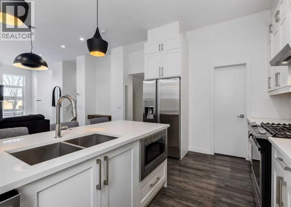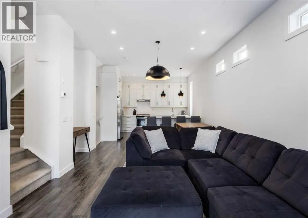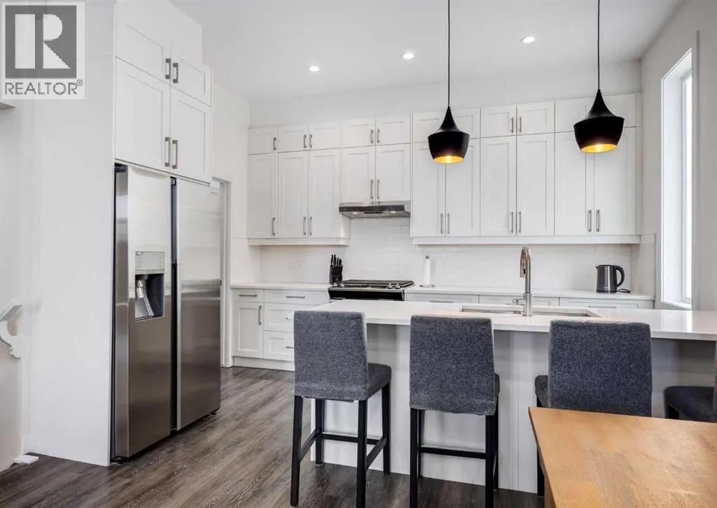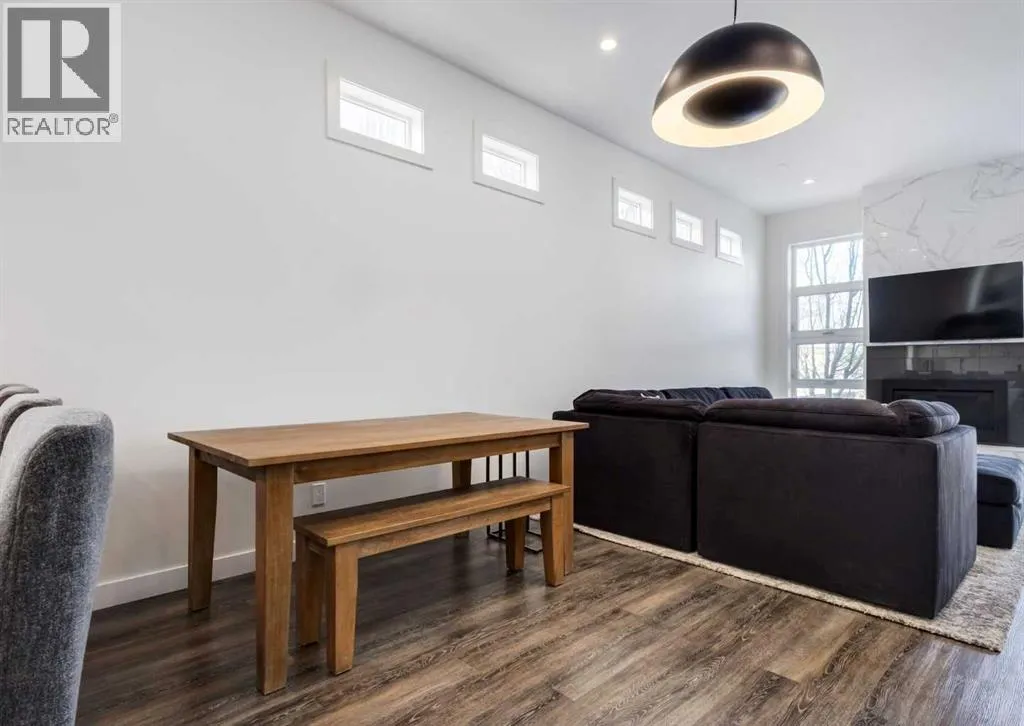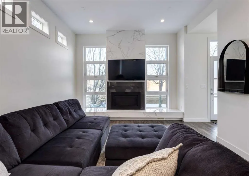 Discover contemporary elegance in this stunning two-storey townhome, perfectly situated on a quiet street in the sought-after community of Tuxedo Park. Centrally located with effortless access to downtown, trendy shops, restaurants, parks, deerfoot trail/airport and all other amenities. Spanning three thoughtfully designed levels, this modern residence boasts three bedrooms, three full bathrooms, and a convenient half bath. Flooded with natural light through oversized windows, the main floor welcomes you with impressive 10' flat ceilings that enhance the sense of space and sophistication. The open-concept layout flows seamlessly from the contemporary kitchenâideal for cooking and gatheringâto the bright living and dining areas, creating an inviting environment for both relaxed daily life and entertaining. Upstairs vaulted ceilings and a skylight create space with an airy, architectural charm. The luxurious primary retreat is a true sanctuary, featuring a spa-inspired ensuite complete with heated tile floors for comfort. An additional bedroom with itâs own ensuite and a convenient upper floor laundry complete this floor. The fully finished lower level extends the homeâs versatility with a spacious living/media room, a full bathroom, and the third bedroomâperfect as a guest suite, home gym, office, or flex space. Finished with premium upscale materials and timeless modern design throughout, this property also includes a single detached garage and outdoor patio. In one of Calgaryâs most vibrant yet peaceful inner-city neighbourhoods, this Tuxedo Park townhome combines style, thoughtful functionality, and an unbeatable location. A must-see gem that perfectly balances urban convenience with quiet retreatâready to welcome you home. Check out the video in the media link and book your private showing today! (id:27476)
