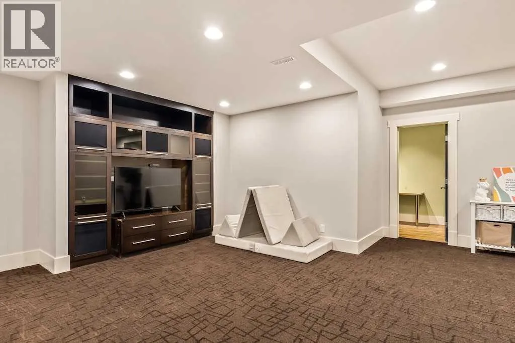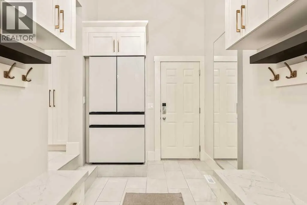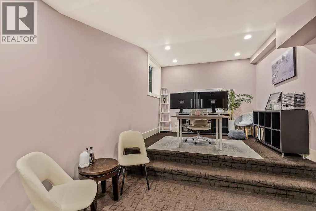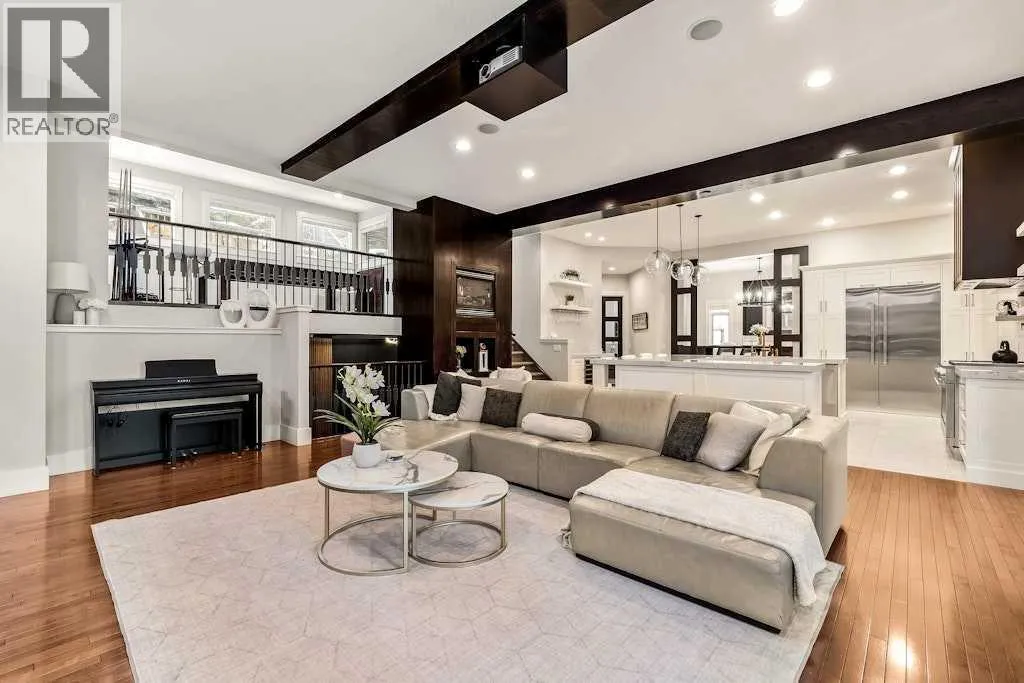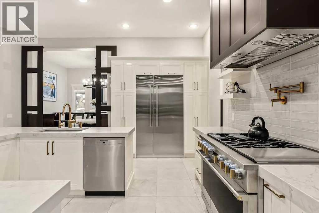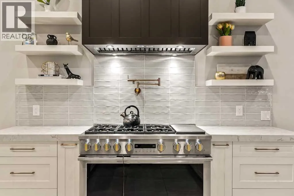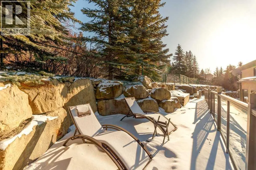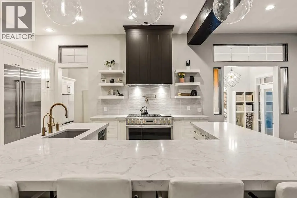 Extensively renovated and impeccably appointed, this architecturally striking five-level split is positioned on a quiet cul-de-sac in Signal Hill, offering almost 3,500sqft above grade and over 5,500sqft total, on a multi-tiered pie shaped lot with multiple outdoor living areas and mountain views. The heart of the home is a the huge custom created kitchen which has been thoughtfully renovated and designed with extensive built-ins, premium stone countertops with a 2.5" mitre edge, and a high-end appliance package including a 48" Monogram gas range, Miele dishwasher, separate built-in JennAir refrigerator and freezer units. A dedicated wine bar with custom cabinetry, new countertops, built-in wine fridge, floating shelves, and hanging wine rack seamlessly connects the kitchen to the dining and living spaces, making it ideal for both everyday living and entertaining. The main living areas are enhanced by custom millwork, updated lighting, and a new fireplace with tile surround, while the dining room features custom built-in cabinetry and lighting. The main floor also features a large private office, tastefully designed powder room, the spacious welcoming foyer, huge mudroom and access to the oversized attached garage. Ceiling heights add to the sense of scale, with approximately 13ft ceilings in the entry, 11ft ceilings on the main level, and 9ft ceilings in the basement. The upper level is anchored by a spacious primary retreat with coffee bar, two walk-in closets full of built-ins, access to the rooftop patio showcasing mountain views, and the ensuite complete with oversized double headed steam shower, dual vanity, heated tile, extra deep soaker tub and designated hair/makeup vanity. Two spacious additional bedrooms, connected by a jack-and-jill bathroom, as well as one of two laundry rooms complete this level. The basement rec room is wide-open and large enough to accommodate the needs of almost anything you can imagine, while still offering a designated gym space, arts&craft room, teen bedroom with its own hangout space, full bathroom, second laundry room and seemingly endless storage space. Practical upgrades include; Hunter Douglas blinds throughout, a radon mitigation system installed in 2022, a new furnace (2024), recently refinished roof top balcony with new TufDek waterproof vinyl decking and the addition of a new 8â x 8â patio door enhance flow to the huge outdoor space off the upper living/flex room. Outdoor living is a standout feature, offering multiple exterior spaces including a front porch with gas hookup, oversized entertaining deck, rooftop deck, fenced grass yard, and dedicated dog run. Located close to schools, parks, shopping, and westside amenities, this home represents a rare opportunity to own an extensively renovated, move-in-ready property in one of Calgaryâs most established communities. (id:27476)
