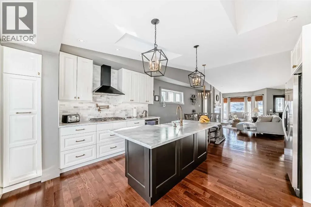 *Magnificent Backyard View to this fully updated WALKOUT 5 bedroom bungalow backing onto Green Space, Pathway. Stunning Open Concept Design with vaulted hardwood floors leading into an open concept kitchen/dining/living room with view through the main floor to the beautifully landscaped, secluded back yard with access to the Pathway system.This dream kitchen is thoughtfully designed with a pot filler above the built-in gas cooktop, a dual-temperature beverage and wine fridge tucked beneath the coffee and tea nook, and a warming drawer located under the built-in oven. A large central island features a timeless ceramic apron sink and provides ample seating for several bar stools. The space is completed with an abundance of cabinetry and elegant marble countertops. Overhead, the vaulted ceiling is enhanced by two skylights, one of which opens and closes remotely and is equipped with a rain sensor that automatically closes at the first sign of precipitation. Truly endless possibilities await in this exceptional kitchen.Step through the kitchenâs French doors onto the expansive upper deck that spans the full width of the home, offering outstanding options for entertaining and showcasing beautiful views of the park and beyond. The nighttime city lights create a spectacular backdrop to enjoy and unwind.The main floor is filled with natural light thanks to the abundance of windows and provides an ideal layout for open entertaining or relaxed family living. The primary bedroom features patio doors leading directly to the deck and includes a lovely four-piece ensuite with a storage cabinet. Two additional bedrooms and a four-piece bathroom complete this level.The fully finished walk-out basement, with its separate entrance, adds exceptional versatility. It includes two more bedrooms, a stylish four-piece bathroom, a spacious laundry room, and a recreation room with a separate wet bar area complete with cabinetry and countertops. This space is perfect for older children to host friends or enjoy their own private retreat.Notable updates completed in 2020 include a new furnace and hot water heater. A playground is conveniently located just down the street, while the pathway system behind the home leads to a nearby school and small business centre. Enjoy close proximity to transit, abundant shopping, Stoney Trail Ring Road, Country Hills Boulevard, and a short drive to Calgary International Airport. This BEAUTY won't last!! (id:27476)