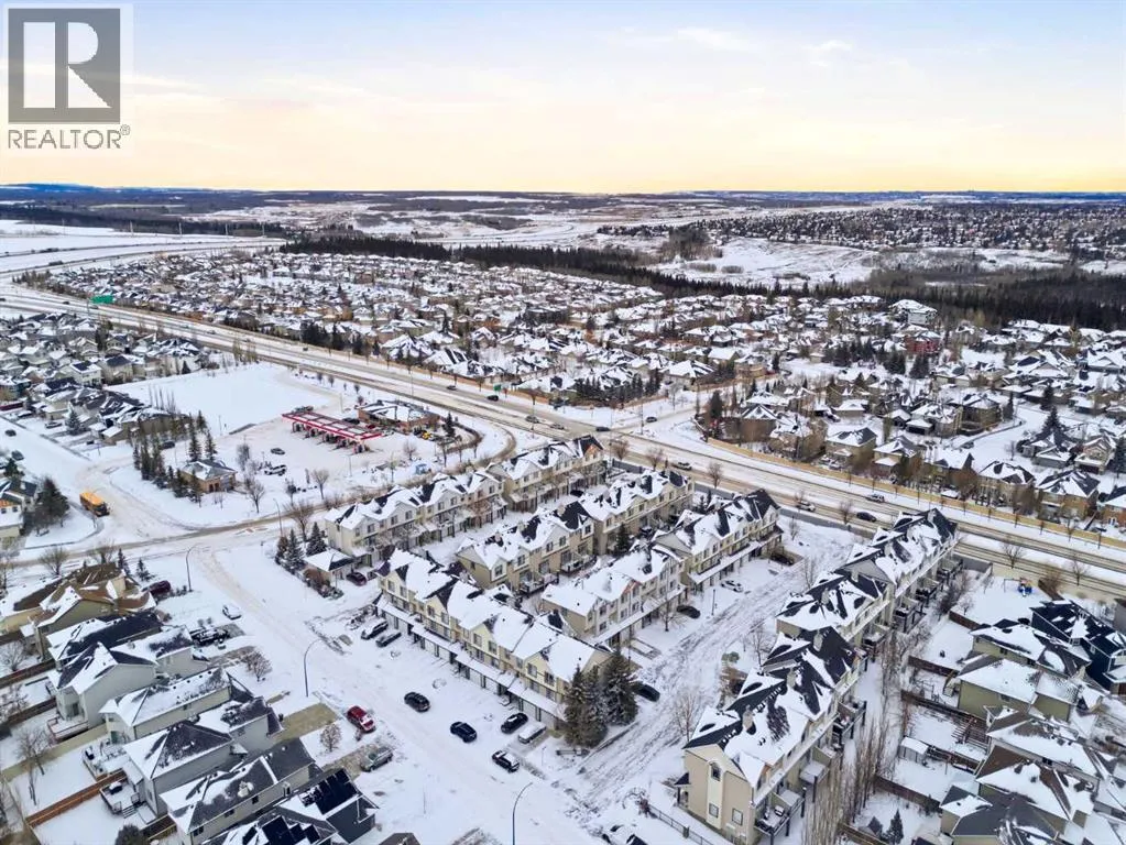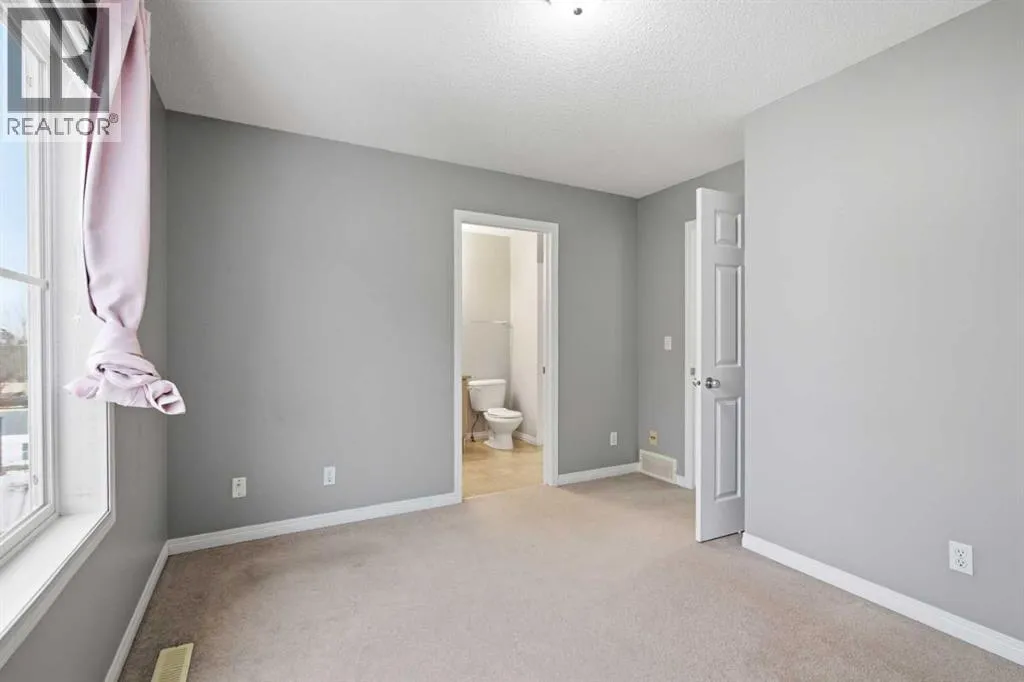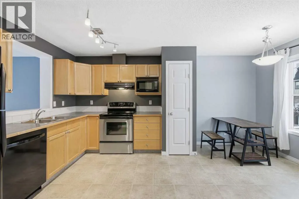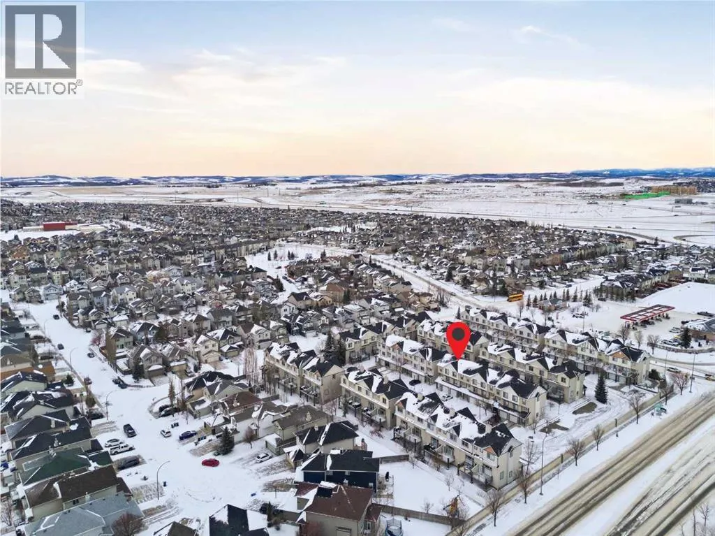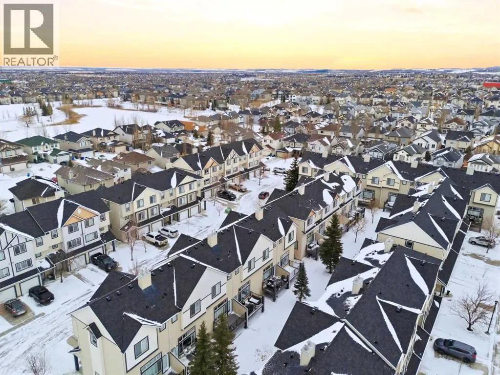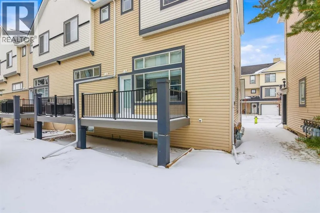 Beautiful sunny end-unit townhome located steps from Fish Creek Park. This low-maintenance townhouse backs onto a green space and features a private deck. The oversized living room offers 14-ft ceilings and tall windows for excellent natural light. Spacious kitchen with maple cabinets, upgraded laminate flooring, black appliances, and a bright breakfast nook.The home includes two primary suites, each with large closets and private ensuites. The lower-level flex space is ideal for a family room, office, gym, or playroom. Attached single garage plus driveway parking. Small pets allowed. Easy access in and out of the complex. (id:27476)