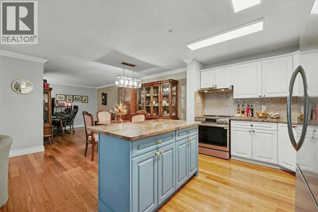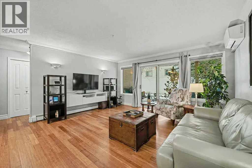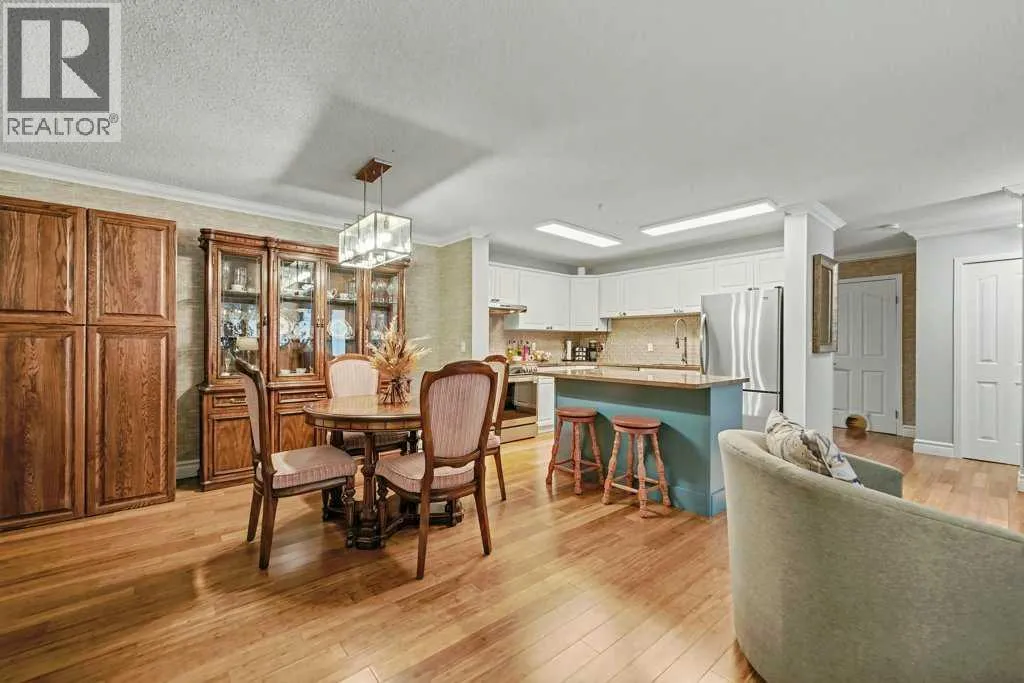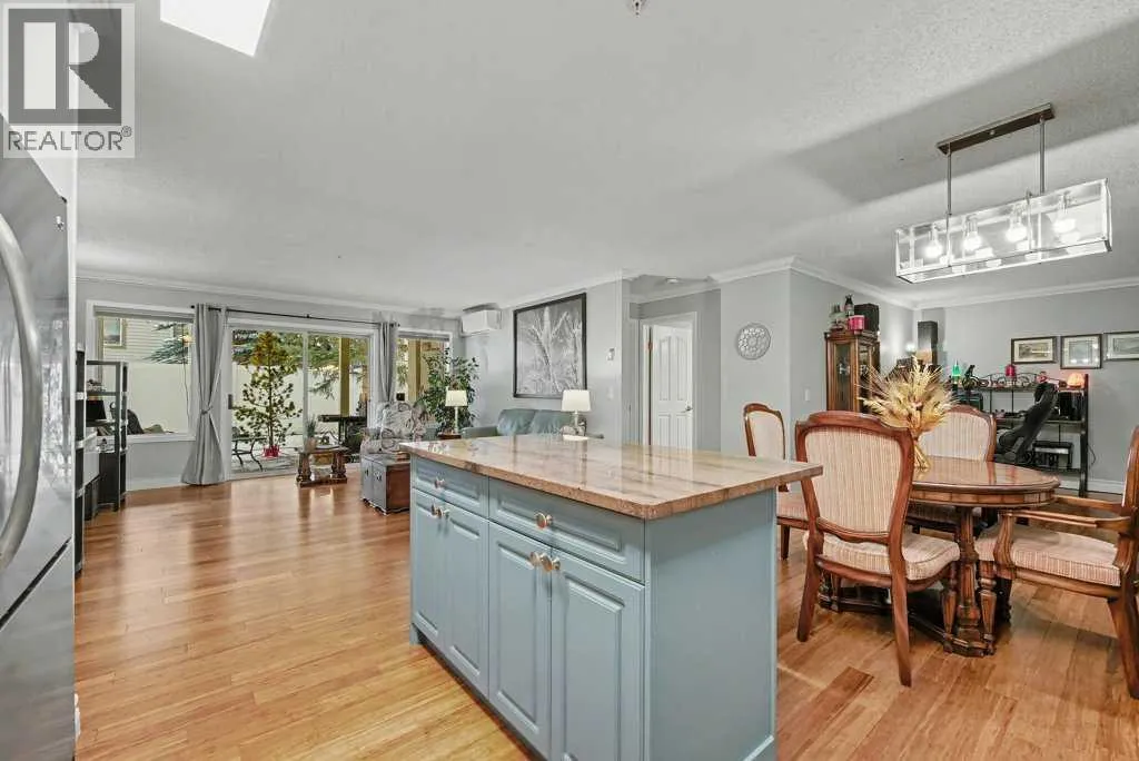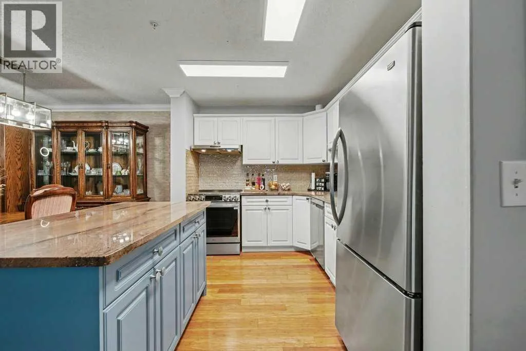 Impressively large condo that "lives like a home" - 1429 sq. ft. - and has been upgraded with high end finishings! Be welcomed as you enter the spacious foyer, adorned with engineered bamboo strand flooring. The open plan shows off the gourmet chef's kitchen, complete with an oversized granite island/counters, glass backsplash, light cabinetry and upgraded stainless steel appliances (*new induction range, new dishwasher and newer fridge)! The adjacent living room and dining room provide a perfect flow for entertaining. A unique open den area provides many options - family room/bonus room or work from home office space. Other features include: upgraded baseboards and crown moldings. The living room has plenty of space for entertaining family and friends. Enjoy effortless, stair-free living with the convenience of stepping directly from your living room onto your private patio - perfect for fresh air, easy pet access, and a seamless indoor-outdoor lifestyle! Both very large bedrooms feature new windows, mahogany custom California Closet organizers, air conditioners, remote bottom up / top down blinds. A 3 piece bathroom is located off the second bedroom, and the master bedroom features a 4 piece ensuite. A massive in-suite storage room is located next to the laundry - which has newer LG full sized washer and dryer. This home also includes 2 parking spaces and is located close to all amenities including: grocery, shopping, schools, golf, express transit to downtown and airport, future green line c-train station, public library, Vivo rec centre and more. Deerfoot & Stoney Trails are easily accessed. (id:27476)