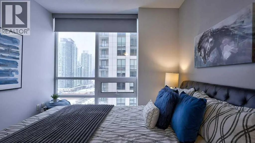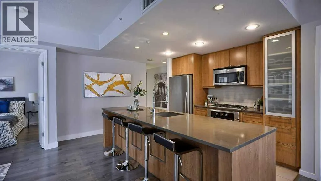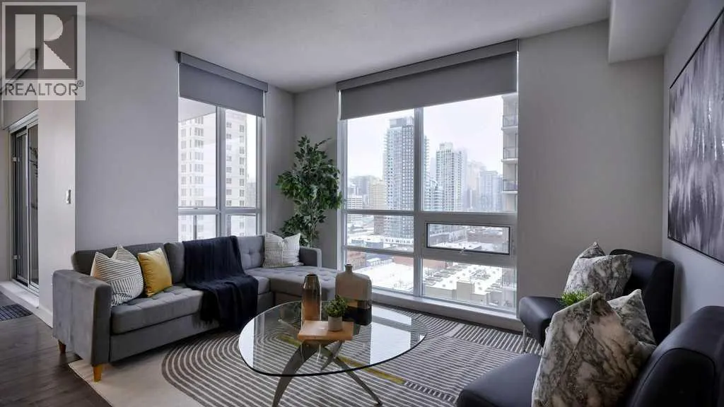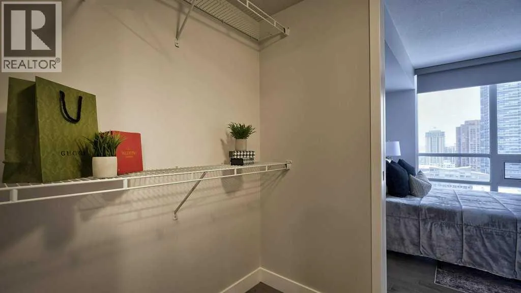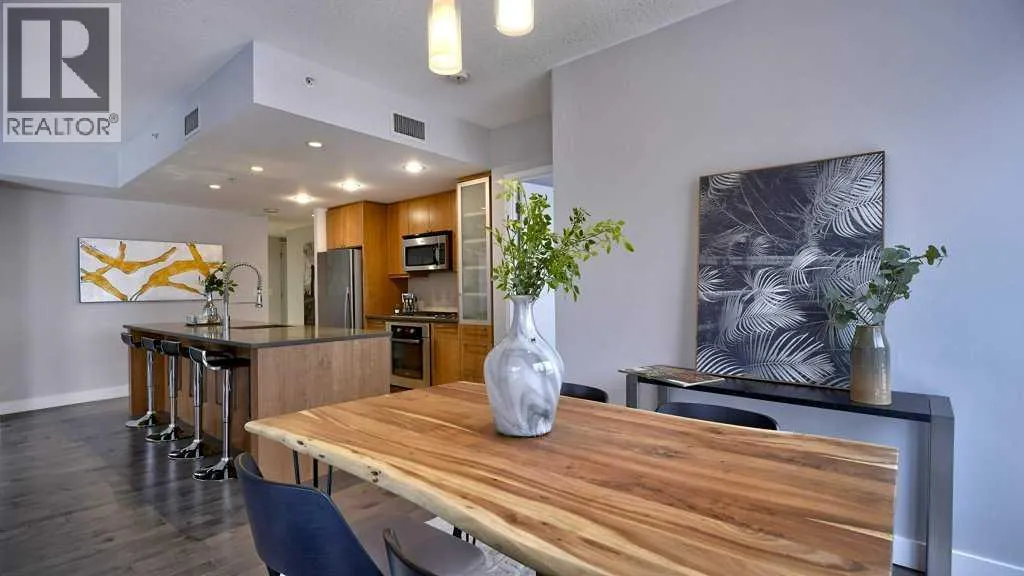 Panoramic city skyline views surround this sleek 14th-floor corner residence, featuring expansive floor-to-ceiling windows with custom blinds and a contemporary 2-bed, 2-bath layout. Freshly painted from top to bottom, including all trim and baseboards, for a crisp, move-in-ready finish. Step into a generous entryway with rich hardwood floors that extend into the bright, open-concept living space. The modern kitchen features extensive cabinetry with convenient pull-out shelves, sleek stainless steel appliances, and elegant quartz countertops. The kitchen flows seamlessly into the sun-filled living room and open dining area, which extends onto a glass-railed balcony offering uninterrupted city views. Thoughtfully designed with bedrooms on opposite sides, this layout ensures maximum privacy. The primary suite offers a spacious walkthrough closet and a luxurious 5-piece ensuite complete with double sinks, a deep soaker tub, and an oversized shower. The second bedroom provides two closets and a stylish 3-piece ensuite featuring a fully tiled shower and contemporary vanity. The flex room offers versatility as a den, home office (with cable and electrical outlets), or generous in-suite storage. Convenient in-suite laundry includes a Bosch washer and dryer. Residents of Nova enjoy a wealth of amenities: a state-of-the-art fitness Centre, inviting social room, guest suites, secure bike storage, 24-hour concierge/security, and a beautifully maintained outdoor garden on the second floor. The pet-friendly location is exceptionalâCo-op and Tim Hortons are right across the street, the C-Train is just three blocks away, and 17th Avenueâs vibrant dining, shopping, parks, and off-leash dog parks are all within easy walking distance. (id:27476)