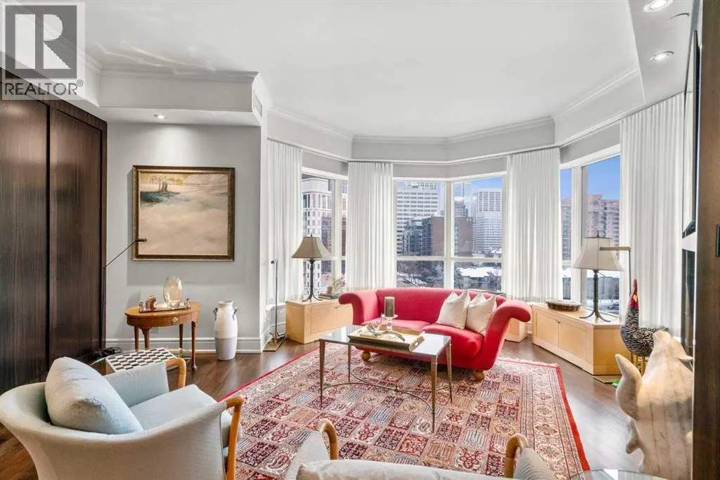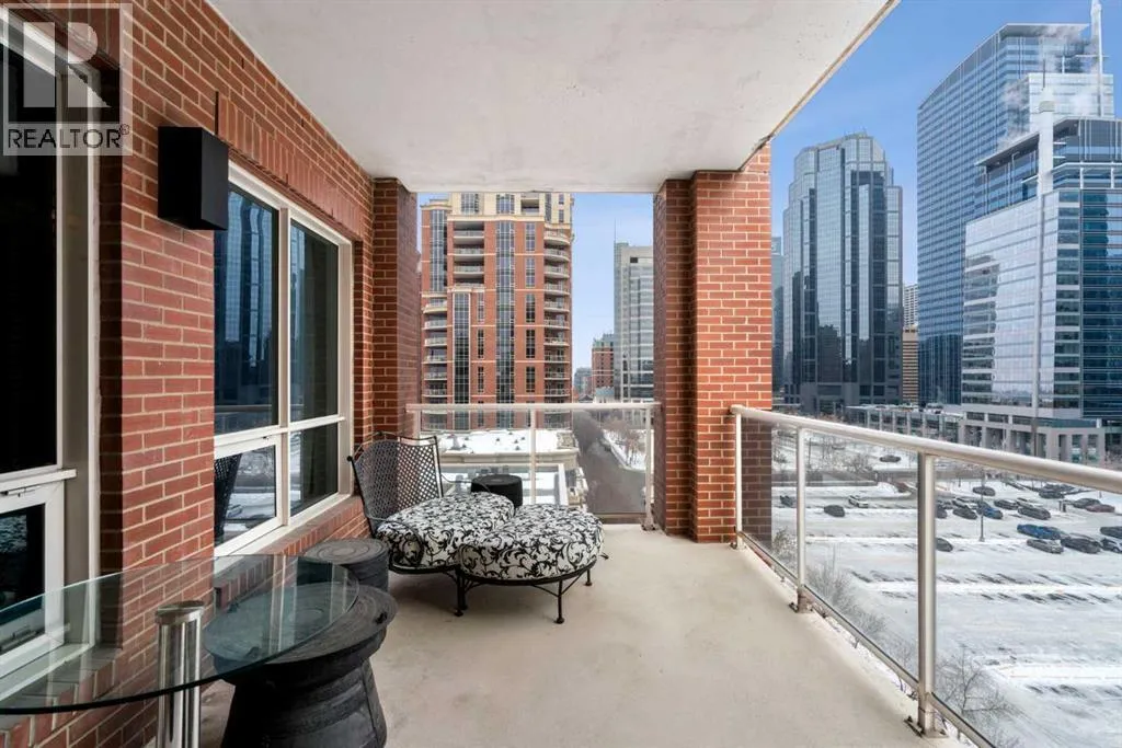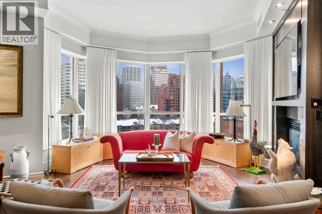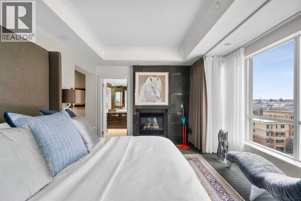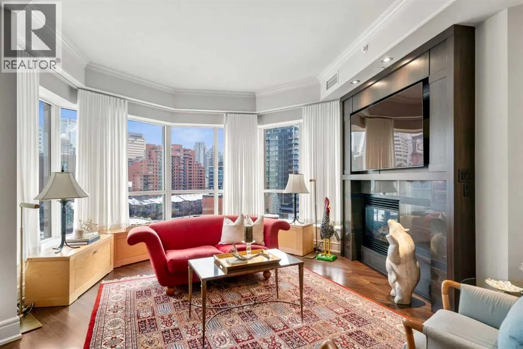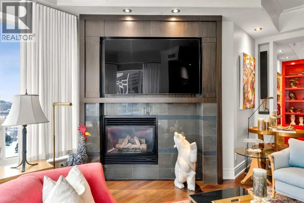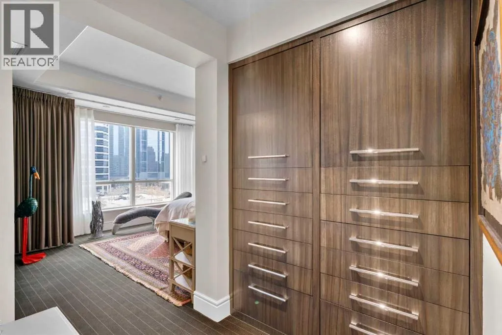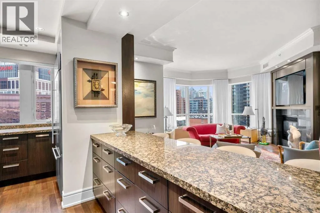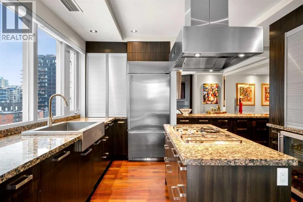 Welcome to Princeton Hall, one of Calgaryâs most prestigious and renowned residential addresses, ideally situated in the heart of Eau Claire, directly along the Bow River and Princeâs Island Park. This exceptional 8th-floor, southwest-facing corner residence offers 1716 sq. ft. of luxurious living space, flooded with natural light through expansive floor-to-ceiling windows showcasing breathtaking views of the river, park, and downtown skyline. Meticulously redesigned by pre-eminent interior designer Douglas Cridland, the home is a refined contemporary masterpiece featuring rich solid hardwood flooring, exotic zebra wood paneling, custom solid wood built-ins, coffered ceilings, gas fireplaces, B&O sound system, luxurious wool carpeting in the bedrooms, Hunter Douglas window coverings, and central AC. The open concept living and dining areas are ideal for both elegant entertaining and everyday comfort featuring floor to ceiling windows, fireplace with custom feature wall, plus feature shelving in the dining area. The primary suite is a private retreat, totally separated from the main living area, featuring two walls of windows, a dual sided fireplace to the ensuite, wall-mounted TV, boutique style wood paneled walk-in closet, in addition to a full wall of built-in drawers and cabinets, custom blinds, a spa-inspired 5-piece ensuite with freestanding wet tub, multiple head walk-in shower, granite counters, private water closet and granite tiled walls. The second bedroom / den showcases stunning wood paneling, plus discreetly concealed 3 piece ensuite and closets. The gourmet kitchen impresses with extensive custom cabinetry, thick granite counters, an oversized storage rich island, dual sized deep sink, professional appliances including gas cooktop with designer hood fan, built-in wall oven, microwave/oven, warming drawer, wine and bar fridges, Monogram fridge, dishwasher, and sleek aluminum pull-down cabinet doors that allow the storage to be concealed. The unique eat ing bar affords additional storage. The generous covered terrace with a gas BBQ line extends the living space. The beautifully finished service room combines in-suite laundry and storage. Exclusive features include private elevator access directly into the suite, two titled heated underground parking stalls, and an oversized titled storage locker. Princeton Hall offers a truly elevated lifestyle with 24 hour concierge, grand two story lobby, fitness center with steam and sauna, temperature controlled wine cellar and tasting room, private function and board rooms, ownerâs lounge, guest suite, visitor parking, and a heated underground parkade with car wash. Steps from river pathways, downtown offices, boutique shopping, fine dining, Kensington, and major routes, this remarkable residence presents a rare opportunity to own an extraordinary home in one of Western Canadaâs most distinguished condominium developments. (id:27476)