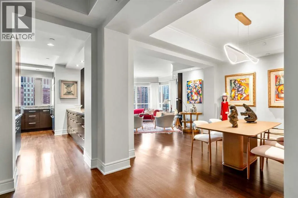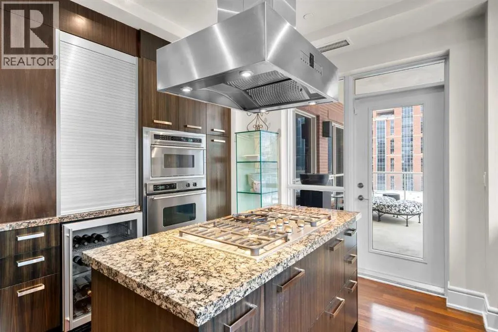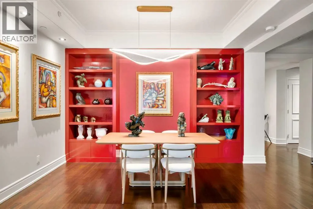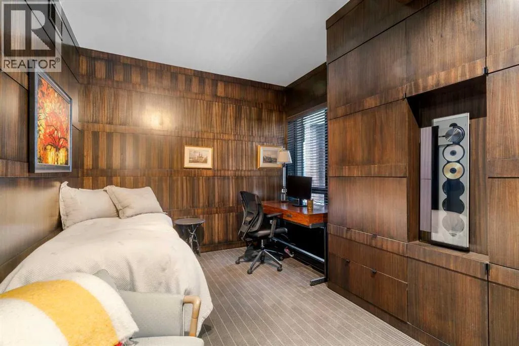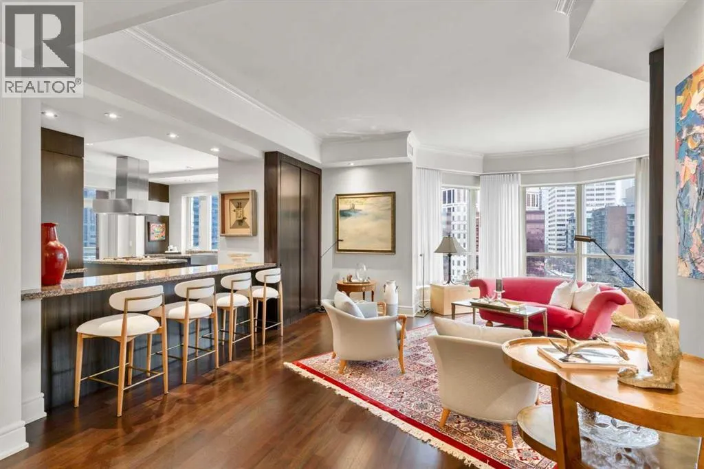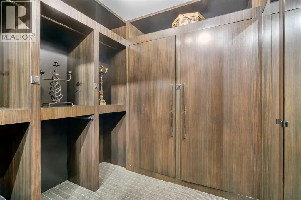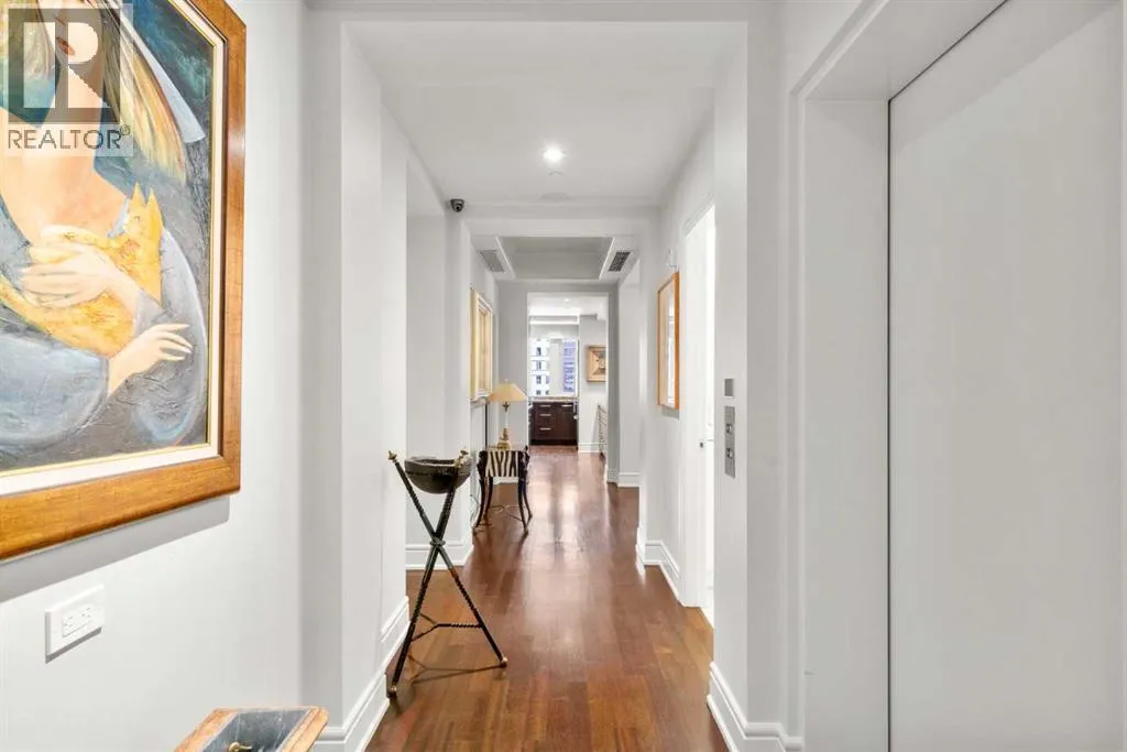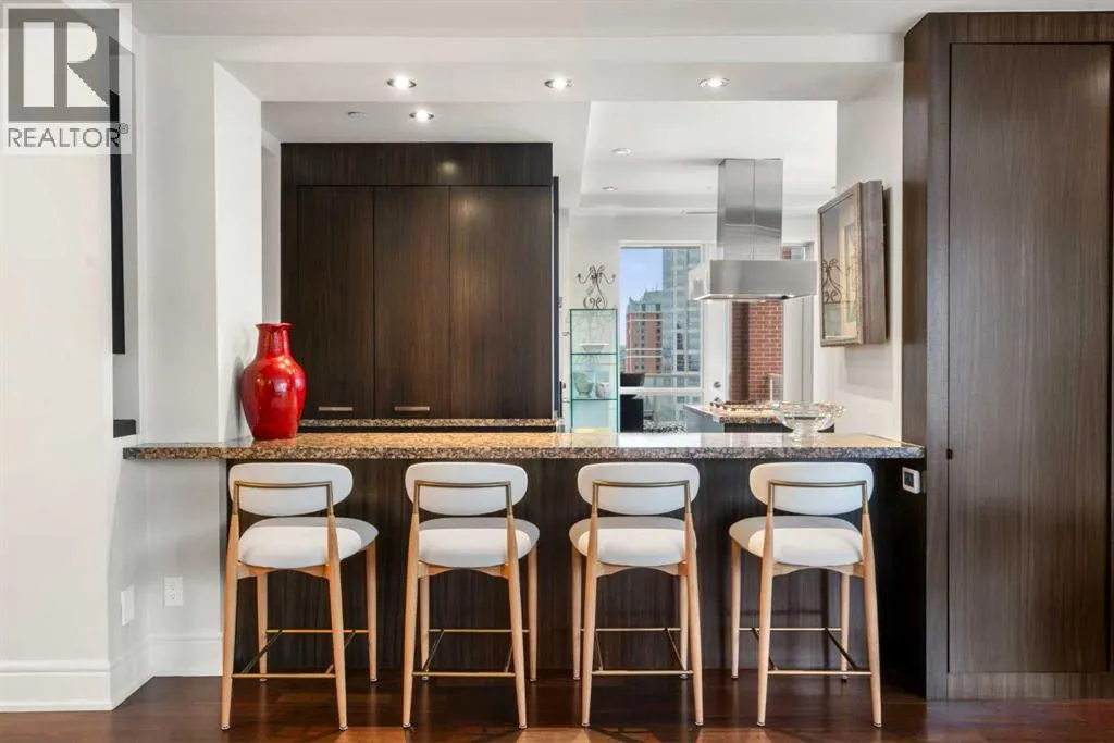 Welcome to Princeton Hall, one of Calgaryâs most prestigious and renowned residential addresses, ideally situated in the heart of Eau Claire, directly along the Bow River and Princeâs Island Park. This exceptional 8th-floor, southwest-facing corner residence offers 1716 sq. ft. of luxurious living space, flooded with natural light through expansive floor-to-ceiling windows showcasing breathtaking views of the river, park, and downtown skyline. Meticulously redesigned by pre-eminent interior designer Douglas Cridland, the home is a refined contemporary masterpiece featuring rich solid hardwood flooring, exotic zebra wood paneling, custom solid wood built-ins, coffered ceilings, gas fireplaces, B&O sound system, luxurious wool carpeting in the bedrooms, Hunter Douglas window coverings, and central AC. The open concept living and dining areas are ideal for both elegant entertaining and everyday comfort featuring floor to ceiling windows, fireplace with custom feature wall, plus feature shelving in the dining area. The primary suite is a private retreat, totally separated from the main living area, featuring two walls of windows, a dual sided fireplace to the ensuite, wall-mounted TV, boutique style wood paneled walk-in closet, in addition to a full wall of built-in drawers and cabinets, custom blinds, a spa-inspired 5-piece ensuite with freestanding wet tub, multiple head walk-in shower, granite counters, private water closet and granite tiled walls. The second bedroom / den showcases stunning wood paneling, plus discreetly concealed 3 piece ensuite and closets. The gourmet kitchen impresses with extensive custom cabinetry, thick granite counters, an oversized storage rich island, dual sized deep sink, professional appliances including gas cooktop with designer hood fan, built-in wall oven, microwave/oven, warming drawer, wine and bar fridges, Monogram fridge, dishwasher, and sleek aluminum pull-down cabinet doors that allow the storage to be concealed. The unique eat ing bar affords additional storage. The generous covered terrace with a gas BBQ line extends the living space. The beautifully finished service room combines in-suite laundry and storage. Exclusive features include private elevator access directly into the suite, two titled heated underground parking stalls, and an oversized titled storage locker. Princeton Hall offers a truly elevated lifestyle with 24 hour concierge, grand two story lobby, fitness center with steam and sauna, temperature controlled wine cellar and tasting room, private function and board rooms, ownerâs lounge, guest suite, visitor parking, and a heated underground parkade with car wash. Steps from river pathways, downtown offices, boutique shopping, fine dining, Kensington, and major routes, this remarkable residence presents a rare opportunity to own an extraordinary home in one of Western Canadaâs most distinguished condominium developments. (id:27476)